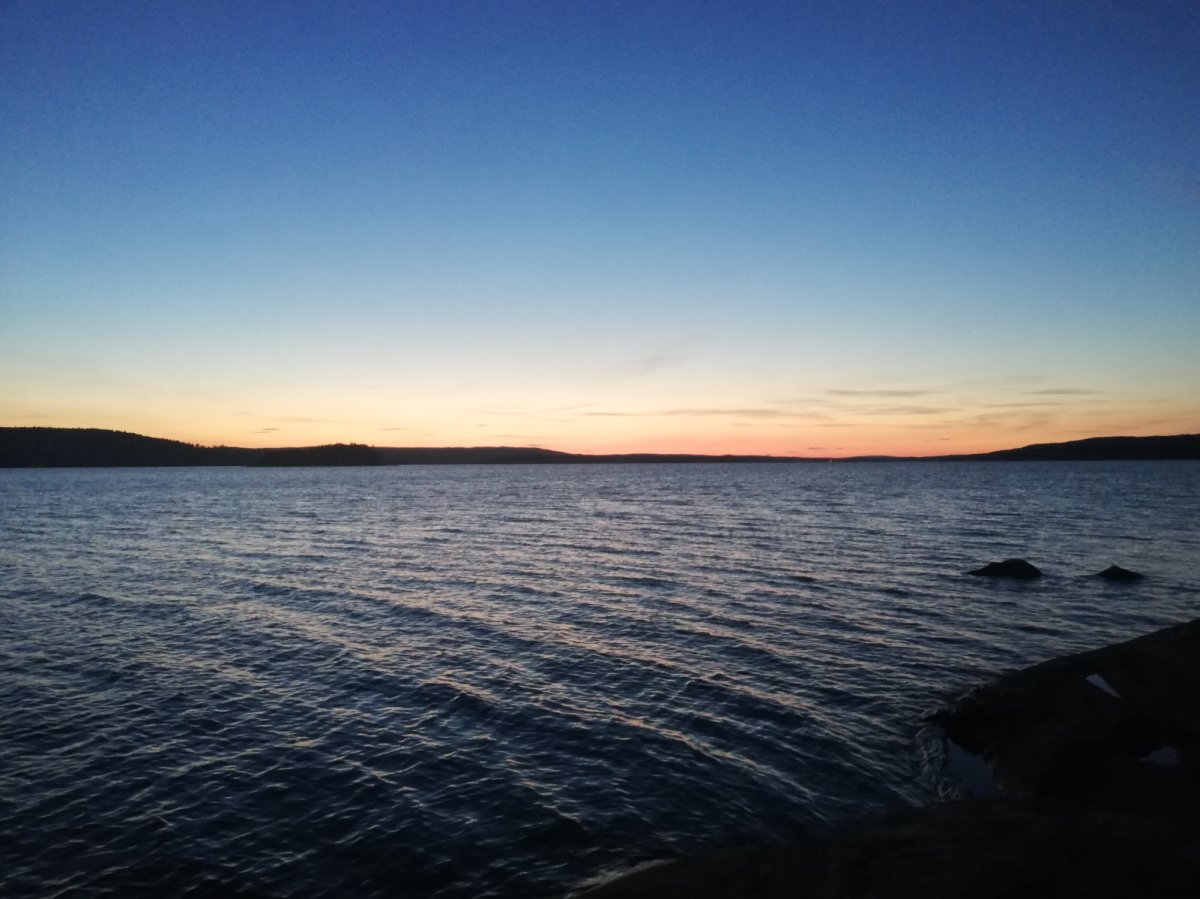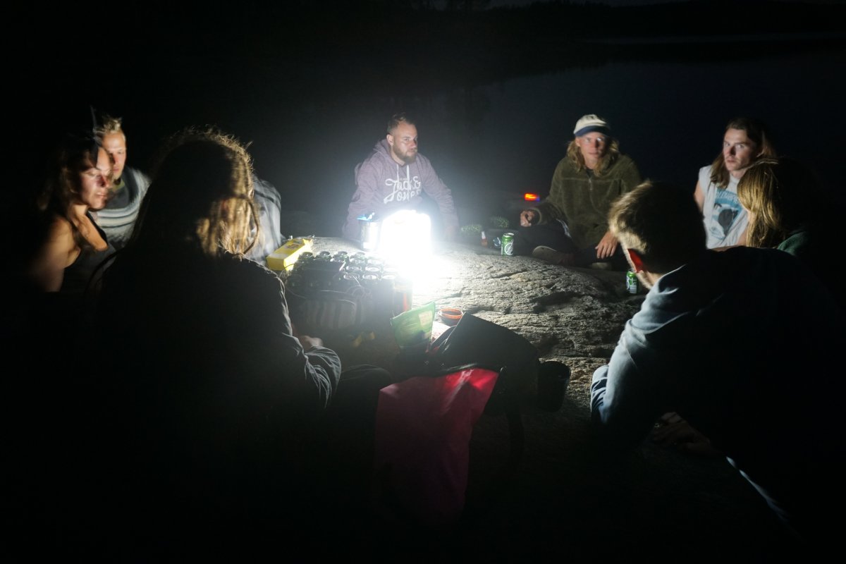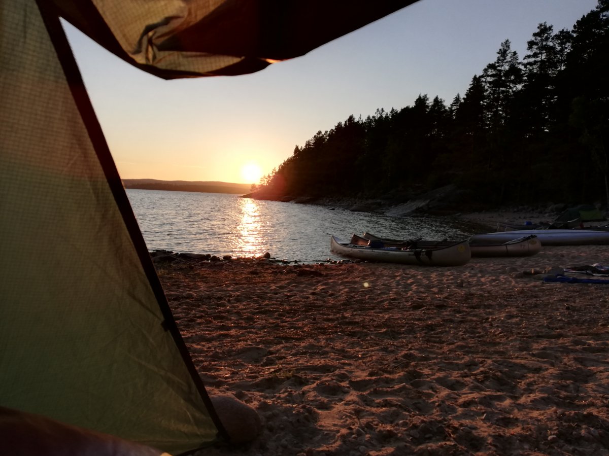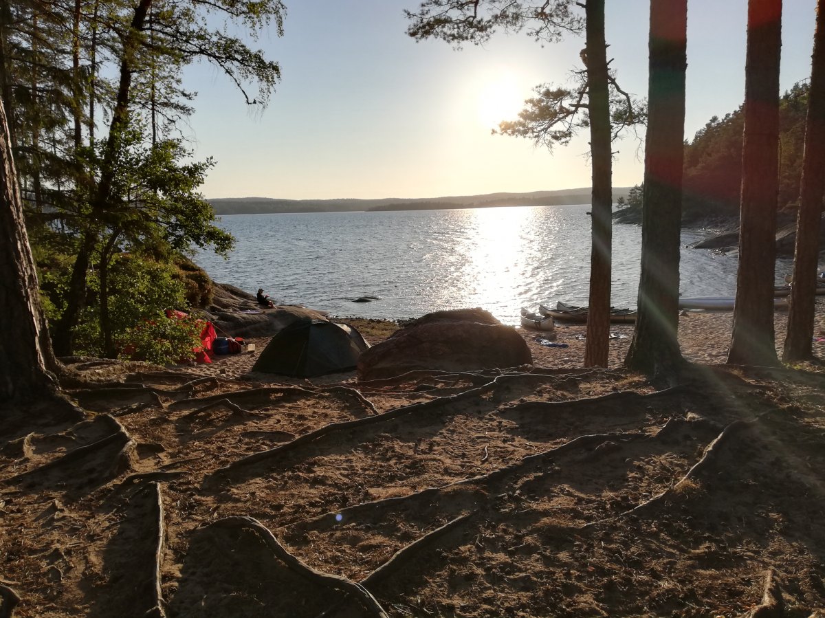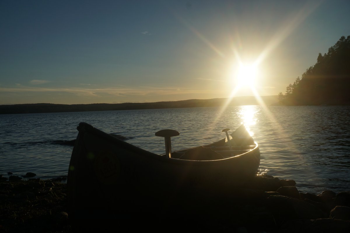 So zogen Annika und ich den letzten Abend alleine weiter zurück Richtung Lennartsfors. Um noch ein letztes Mal den Sonnenuntergang bewundern zu können, haben wir sogar nochmal den See überquert, um auf die Ostseite des Sees zu gelangen und haben in der Nähe von Myntebäcken unser Lager aufgeschlagen. Dort haben wir nette Angler getroffen - wir hatten auch eine Angel dabei aber bis dato noch nicht geangelt, da sich keiner von uns so wirklich damit auskannte. Also wurde am letzten Abend noch im Sonnenuntergang bis in die Tiefe Nacht geangelt! Gefangen haben wir nichts - außer einer schwimmenden Blindschleiche und ein paar Steine, in denen sich der Haken verhakte... Dies ließ sich in den meisten Fällen lösen (von unseren Experten) - das ein oder andere Mal mussten wir jedoch selbst ins Wasser, schwimmend oder eben mit dem Kanu. Anschließend haben wir am Strand noch Karten gespielt - es war ein sehr schöner Abschlussabend mit dem Blutmond. Dieser war leider nur kurz sichtbar, da dies die einzige bewölkte Nacht war.