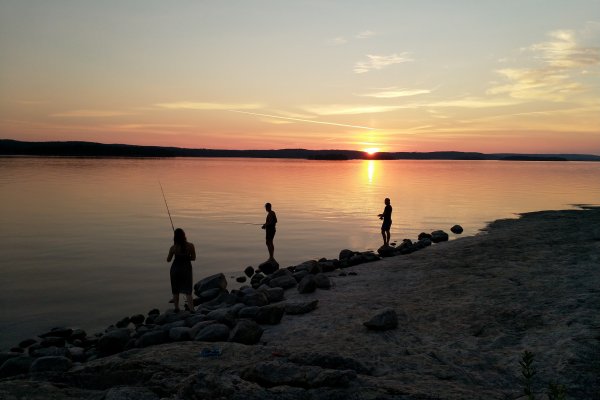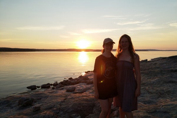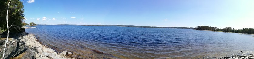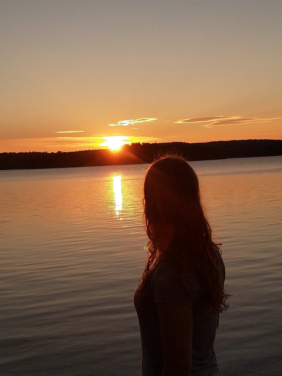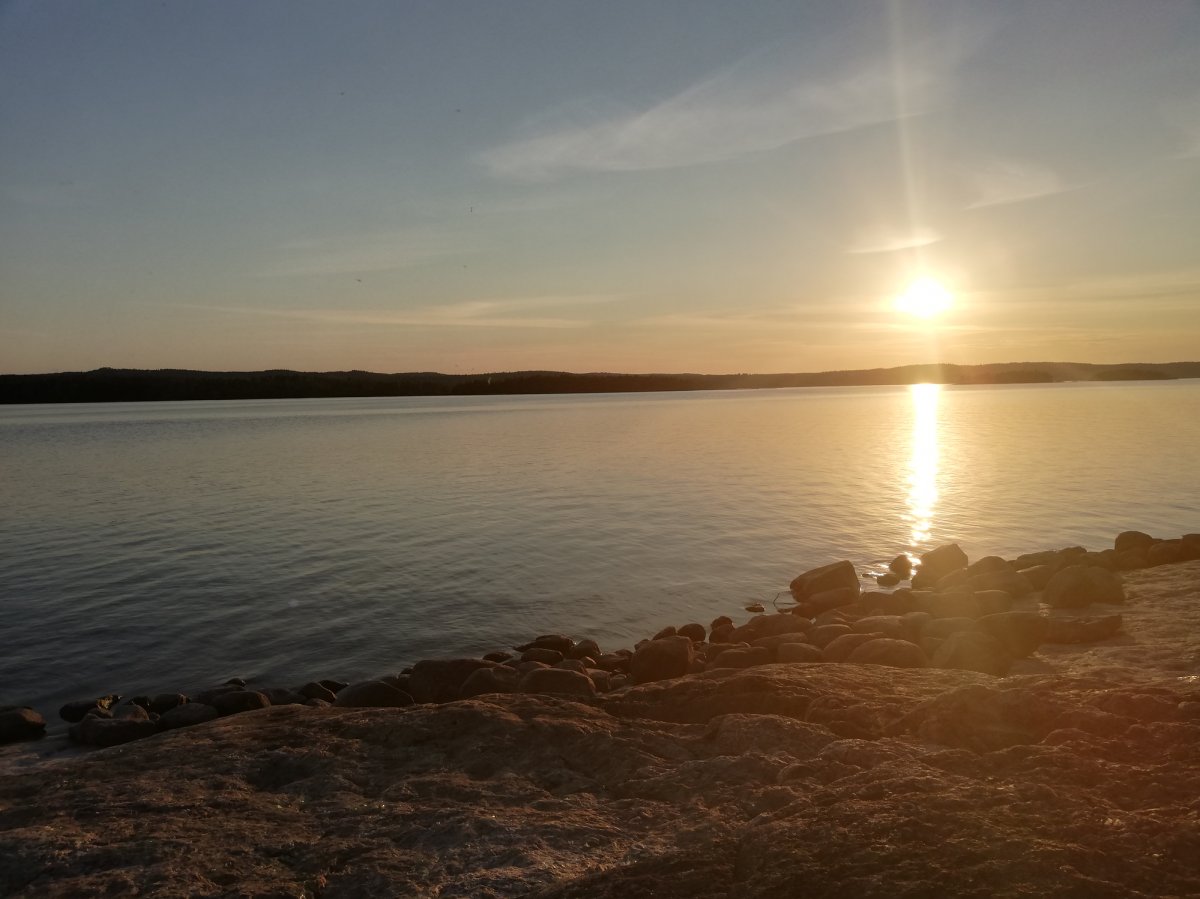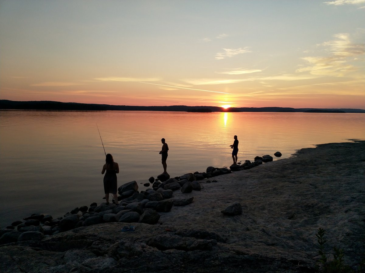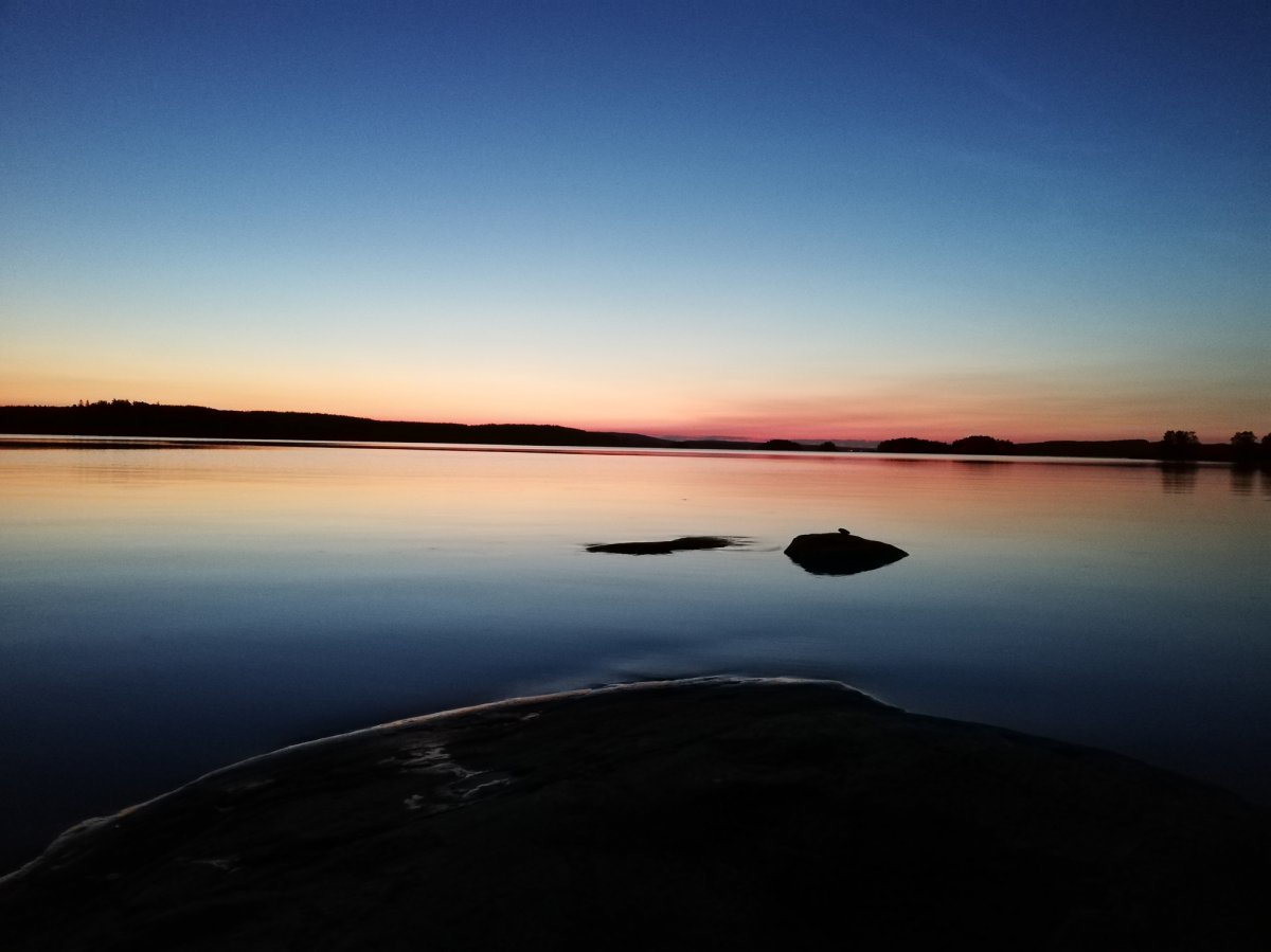 So zogen Annika und ich den letzten Abend alleine weiter zurück Richtung Lennartsfors. Um noch ein letztes Mal den Sonnenuntergang bewundern zu können, haben wir sogar nochmal den See überquert, um auf die Ostseite des Sees zu gelangen und haben in der Nähe von Myntebäcken unser Lager aufgeschlagen. Dort haben wir nette Angler getroffen - wir hatten auch eine Angel dabei aber bis dato noch nicht geangelt, da sich keiner von uns so wirklich damit auskannte. Also wurde am letzten Abend noch im Sonnenuntergang bis in die Tiefe Nacht geangelt! Gefangen haben wir nichts - außer einer schwimmenden Blindschleiche und ein paar Steine, in denen sich der Haken verhakte... Dies ließ sich in den meisten Fällen lösen (von unseren Experten) - das ein oder andere Mal mussten wir jedoch selbst ins Wasser, schwimmend oder eben mit dem Kanu. Anschließend haben wir am Strand noch Karten gespielt - es war ein sehr schöner Abschlussabend mit dem Blutmond. Dieser war leider nur kurz sichtbar, da dies die einzige bewölkte Nacht war.