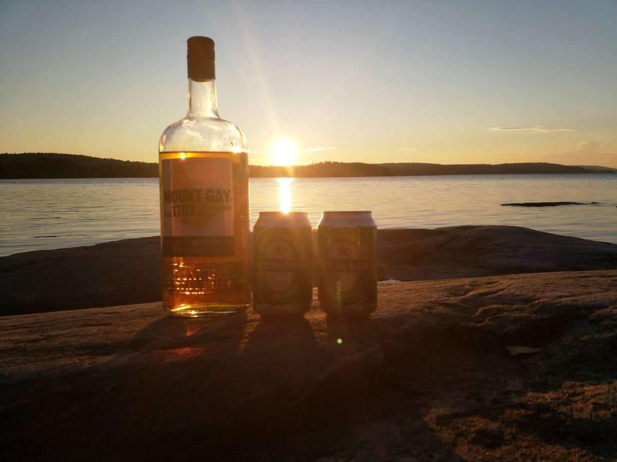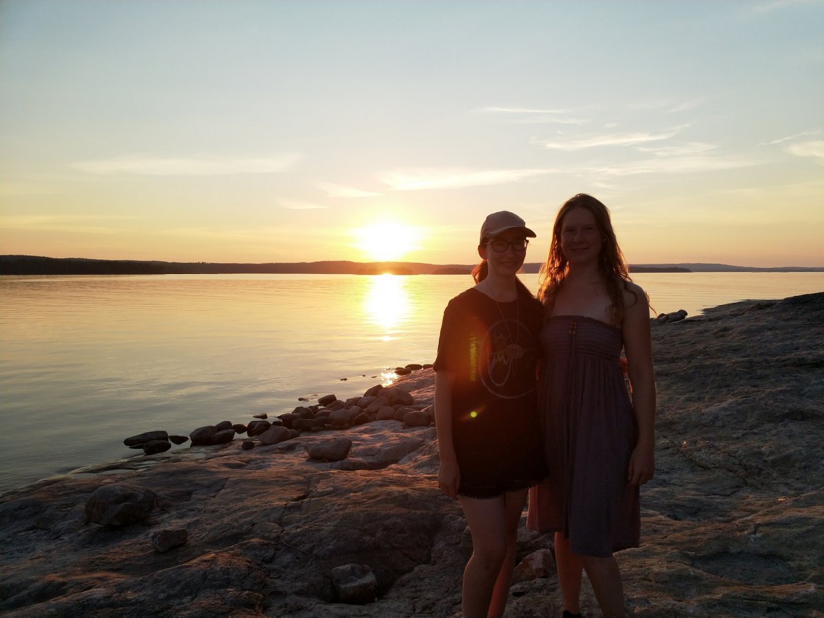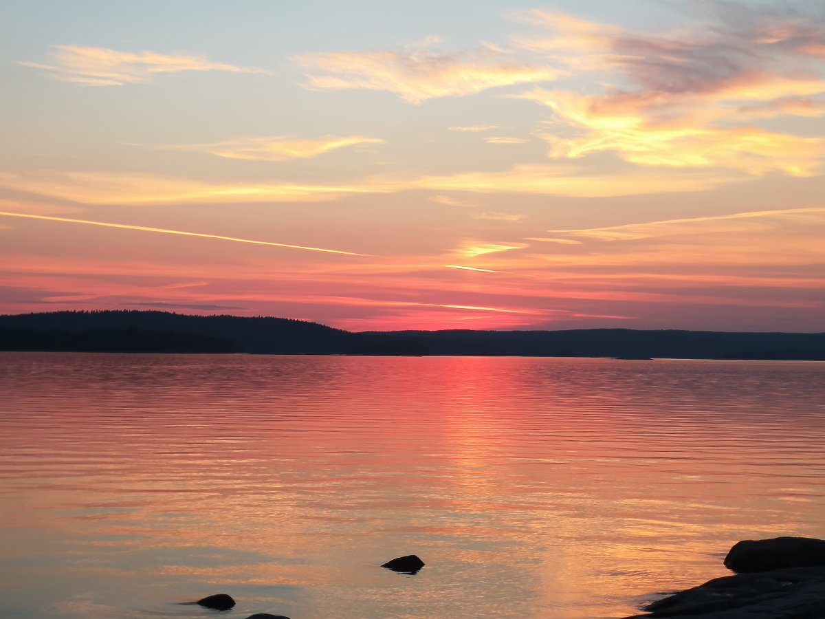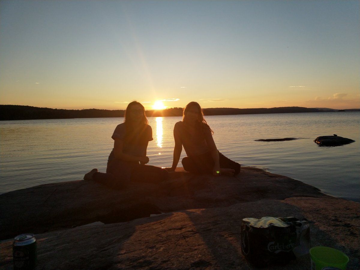 Unsere Paddelprofies trafen wir dann lustiger Weise auf der Insel Barön wieder. Ursprünglich war unser Plan, diese Tour alleine zu machen und Ruhe vor der Menschheit zu haben. Funktionierte nur so mäßig gut, wie sich auf Barön herausstellte ;-). Wir waren also ursprünglich nur zum Kochen auf Barön (Dano 19), dort trafen wir auf unsere 2 Paddelprofis, eine Familie, 4 FSJler und 2 Kerle auf Abenteuer Tour - Björn und Matze. Annika und ich hatten viel zu viel Gemüseragou gekocht (was übrigens wirklich sehr lecker war!) und aus den Abnehmern der Reste wurden sehr gute Freunde. Abends saßen wir alle auf den Felsen, haben uns den Sonnenuntergang angeschaut und dabei über Gott und die Welt gequatscht. Dabei ging zuerst die Sonne unter, dann der Mond auf und unter und dann ging die Sonne um 5 auch schon wieder auf. Dieses Farbenspiel war einfach unvergesslich! Nachdem wir unser Schokomüsli und Milchpulver gegen den leckeren Wein der Familie getauscht hatten, wurde der Abend noch lustiger.