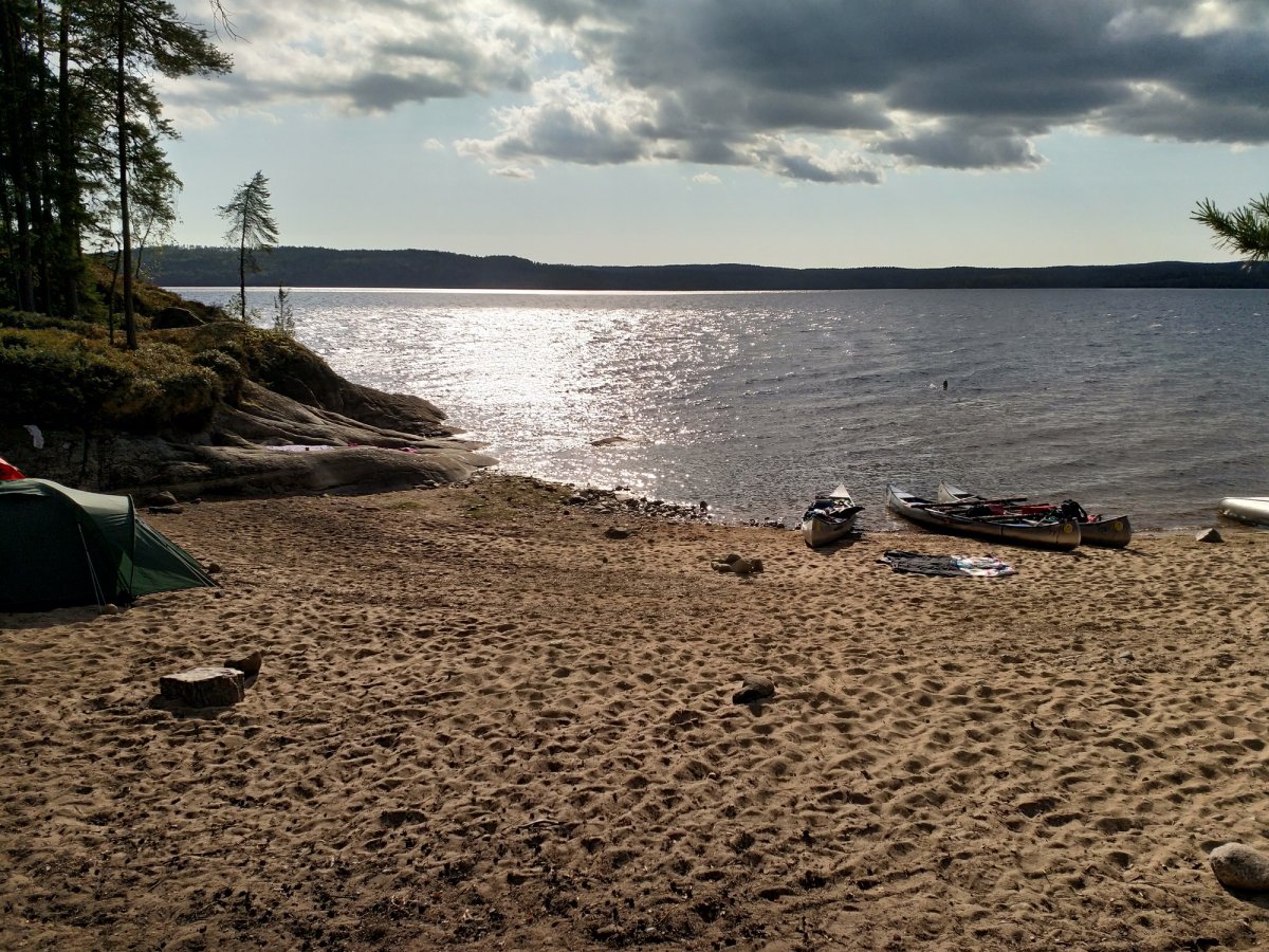 Am nächsten Tag ging es weiter Richtung Norden. Zu unserem Glück kam ein weiteres Kanu neben uns her, welches merkwürdiger weiße kerzengrade fuhr, obwohl nur die hintere Person paddelte. Wir hatten es zu 2. Bis dahin nicht geschafft, geradeaus zu fahren und pendelten immer hin und her. Also ergriff ich die Gelegenheit um mal nachzufragen. Der Trick lag darin, das Paddel nach dem Paddelschlag nach hinten zu führen und als Finne zu benutzen und den stärkeren Paddler nach vorne zu setzen. Diese Erkenntnis hat uns danach definitiv schneller voran gebracht und uns einige kurven-km gespart :D.