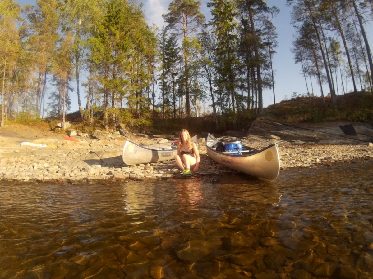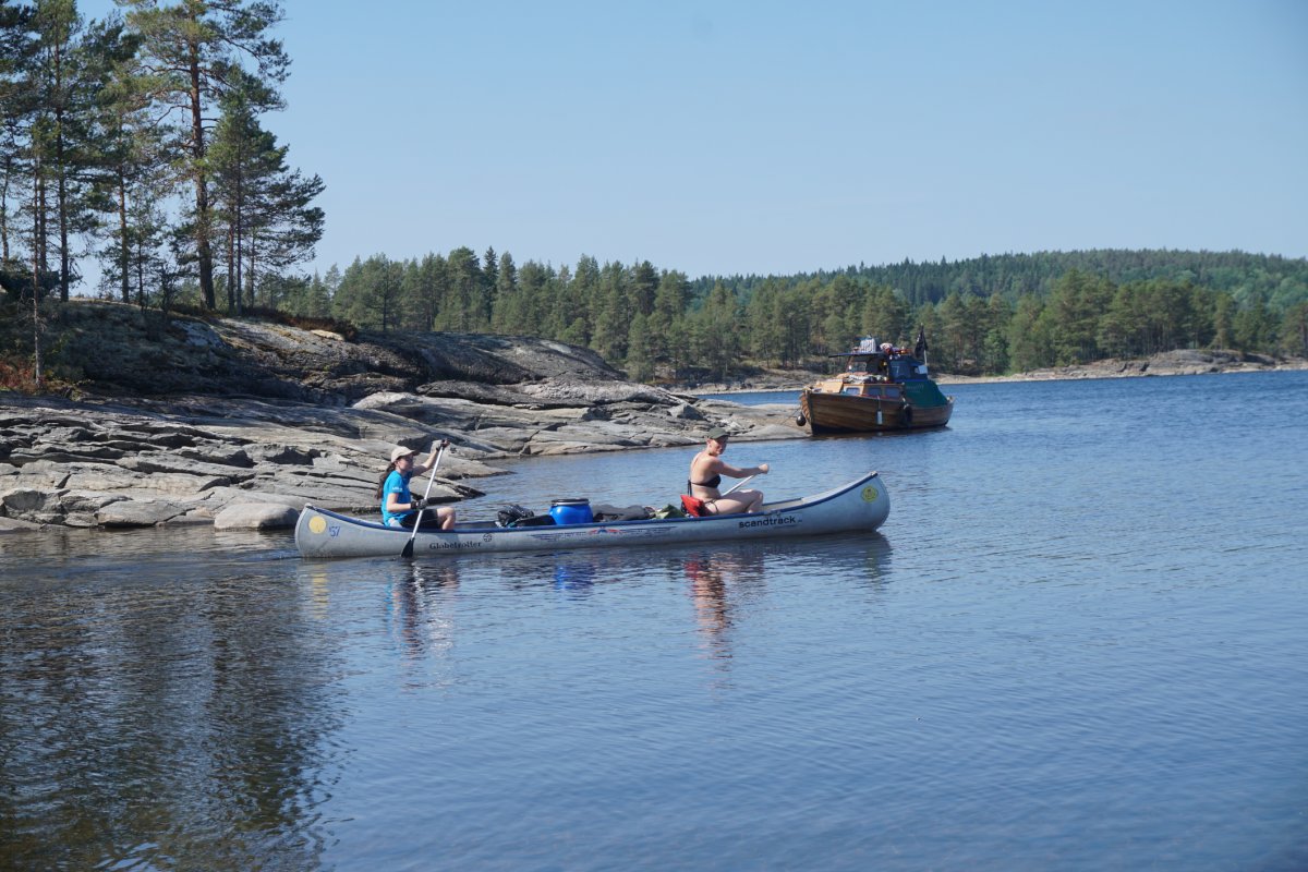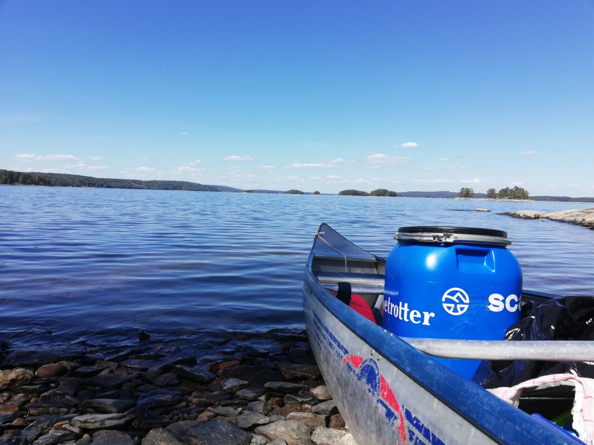 Angekommen im Camp erwartete uns die erste Trockentoilette unseres Lebens bei ca 30 Grad Außentemperatur. Als dieses Erlebnis verdaut war, ging es langsam zum Sachen abholen und umpacken. In diese Packsäcke passt wirklich mega viel rein! Trotzdem sollte man sich an die vorgeschriebenen max 20kg halten, man braucht wirklich nicht so viel, wie man denkt und muss schließlich alles zum Kanu schleppen ;-). Nachdem alles mit letzter Kraft zum Kanu getragen wurde, war es endlich soweit: Wir fuhren los. Zwar in Schlangenlinien, aber wir bewegten uns vorwärts. Das Wetter war traumhaft, blauer Himmel und sehr warm - daher beschlossen wir, am ersten Tag nur ein kleines Stück zu fahren und unseren Urlaub direkt zu genießen - die anstrengende Anreise war bei diesem unglaublichen Ausblick sofort vergessen :-). Bis zum Dano 12 sind wir gekommen und haben dort auf der Nordseite der wunderschönen Insel am Strand angelegt. Nach einer kurzen Erkundungstour haben wir uns auf die warmen Felsen in die Sonne gelegt und erstmal geschlafen.