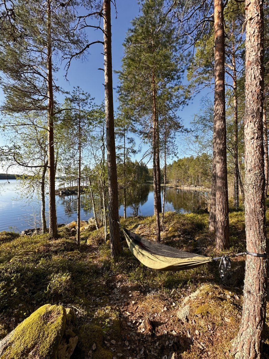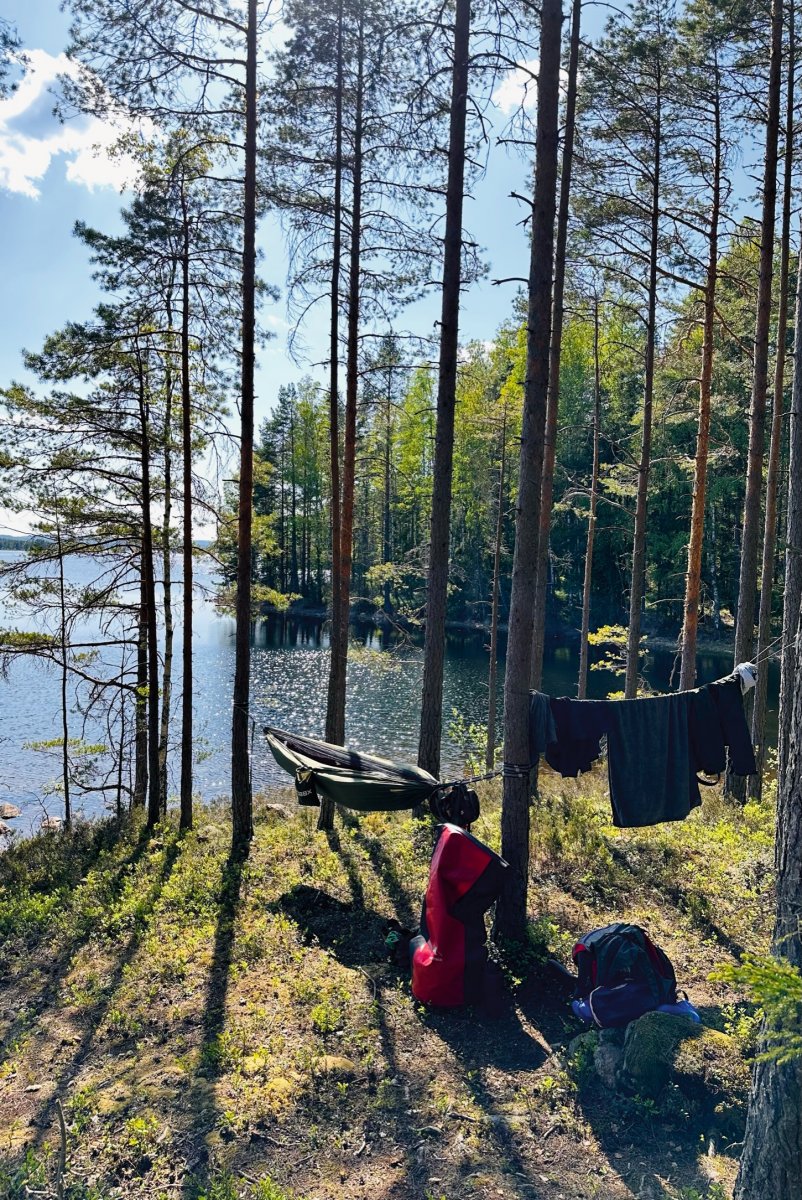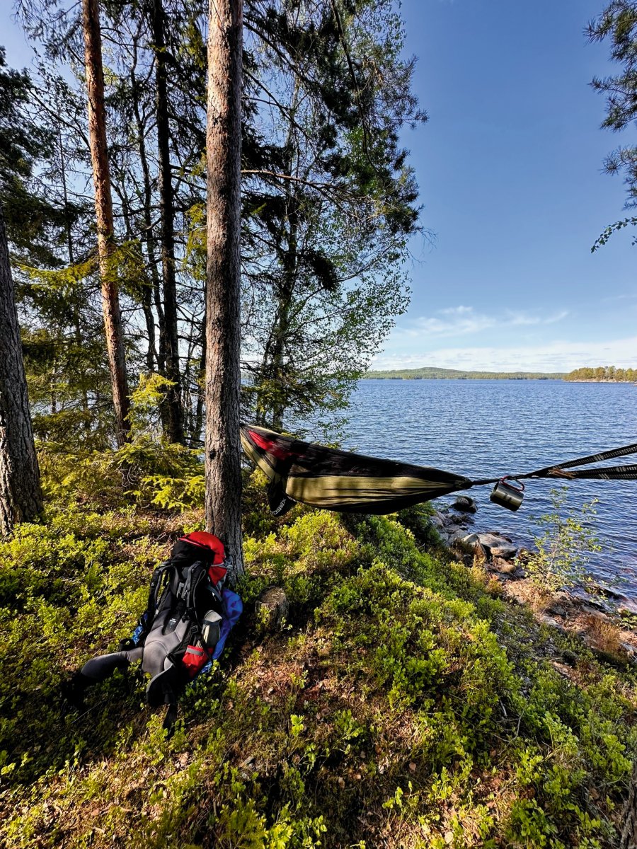 Nach einer milden Nacht in unseren Hängematten erwachten wir am nächsten Morgen erfrischt auf und setzen unsere Kanutour nach einem gemeinsamen Frühstück und frisch gekochtem Kaffee am Feuer fort. Wir erreichten beinahe routiniert inmitten des Stora Gla eine kleine Insel, welche zur Lagebesprechung der optimale Ort war. Zusammen analysierten wir die bisherige Strecke und definierten die Route für den weiteren Tag. Wir wollten zeitig am nächsten definierten Halt ankommen, um in Ruhe unser Lager aufzubauen und noch bei Sonnenschein eine Runde im See schwimmen zu gehen. Unsere Pläne gingen auf und das Entladen des Kanus wie auch der Lagerbau gingen nun schon deutlich leichter von der Hand. Auch das Feuermachen mit den von uns mitgebrachten Feuerstahl und Birkenrinde ging beinahe auf den ersten Versuch.