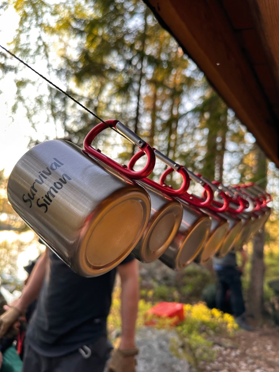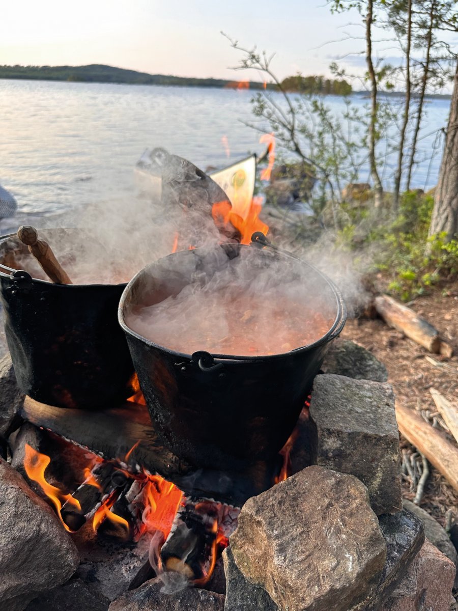Am Lagerfeuer begannen wir unter Anleitung unseres Outdoor Kochbuchs mit der Zubereitung unseres Abendessens. Es war ein Gemeinschaftsprojekt, bei dem jeder seine kulinarischen Fähigkeiten einbrachte. Das Knistern des Feuers und der Geruch von frisch gekochtem Essen erfüllte die Luft. Wir saßen um das Feuer herum, lachten, erzählten Geschichten und genossen das köstliche Mahl bis die ersten von uns den Weg in Ihre Schlaf Behausung antraten um sich von der Anreise, dem Paddeln und dem Lagerbau zu erholen.