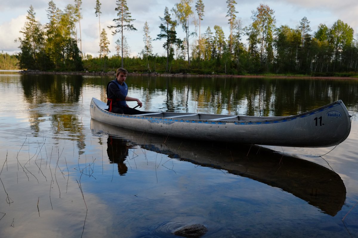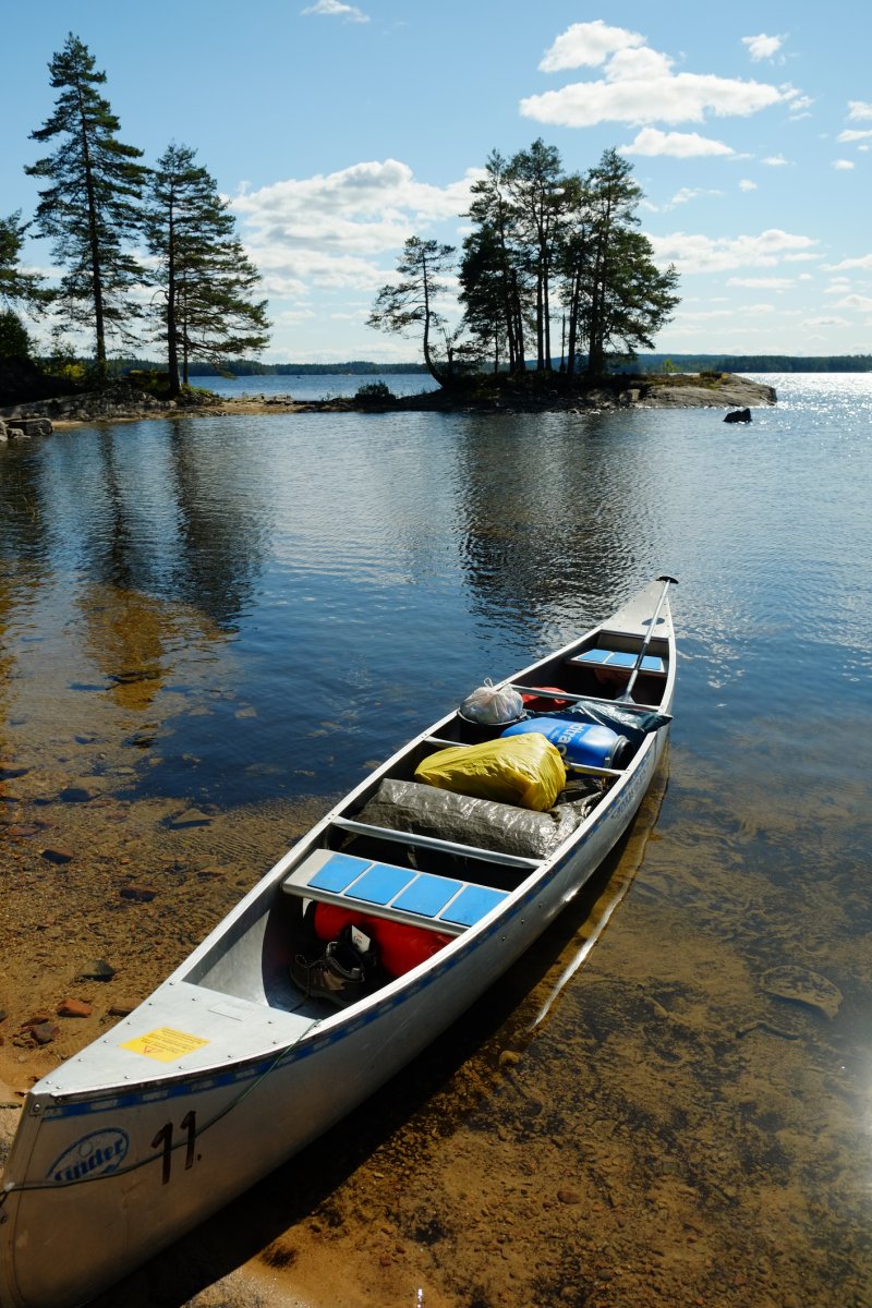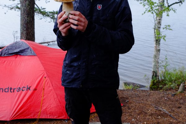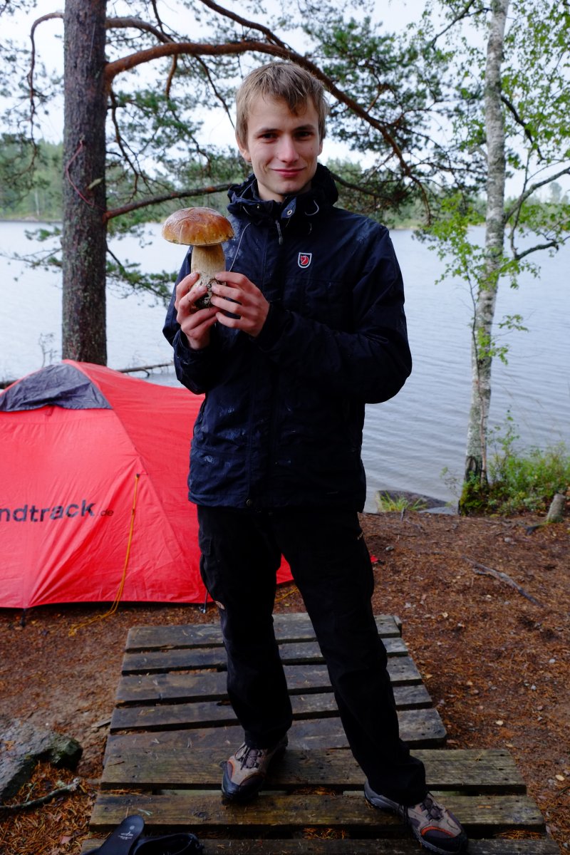 Sehr schnell wurde mir, dem unerfahrenen Paddler in unserer kleinen Reisegruppe, klar wie anstrengend Paddeln und wie schön das Entspannen in der Sonne danach sein kann. Sich bei einem guten Buch die Sonne auf dem Pelz scheinen lassen und die Ruhe des schwedischen Waldes genießen – ein wunderschöner Start in den Urlaub, so konnte die Woche gern weiter gehen. Und das tat sie. Natürlich lagen wir nicht nur in der Sonne, es gab ja schließlich den Stora Bör zu erkunden. Bei dem ein oder anderen Regentropfen wagten wir unsere erste kleine größere Tour, welche leider nicht mit einem Fischfang gekrönt werden sollte. Und leider blieb das auch die ganze nächste Woche so, trotz inniger Bemühungen. Zum Glück waren wir aber auch ohne eigens Gefangenes sehr gut mit Essen und Rezepten aus unserer Verpflegungstonne versorgt. Ergänzt wurden Nudeln, Reis und Kartoffeln dann aber doch noch durch „selbstgefangene“ Steinpilze – von klein bis doch eher recht groß. Und wir stellten fest: in der Wildnis ist jedes Essen ein kleines Festmahl und schmeckt nochmal besser als daheim gekocht, beachtet man die Zeit und Geduld, die es braucht zu kochen und die Improvisationskünste denen es bedarf, um Gekochtes warm zu halten. Nicht zu vergessen: rechtzeitig mit dem Kochen anzufangen, da es doch recht zeitig dunkel wird. Schneller zumindest, als man erwartet. Aber auch Kochen mit Stirnlampe ist eine Erfahrung.