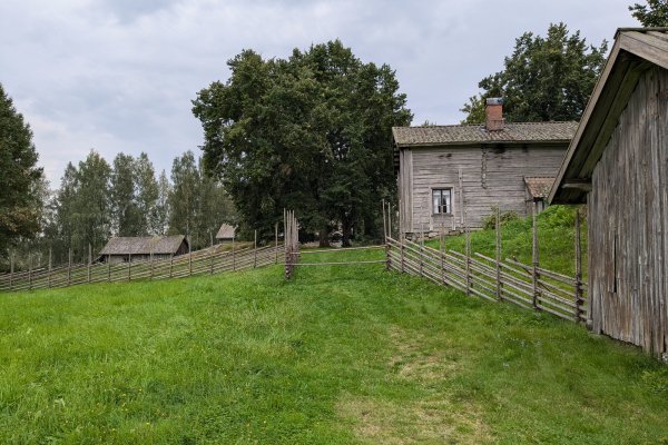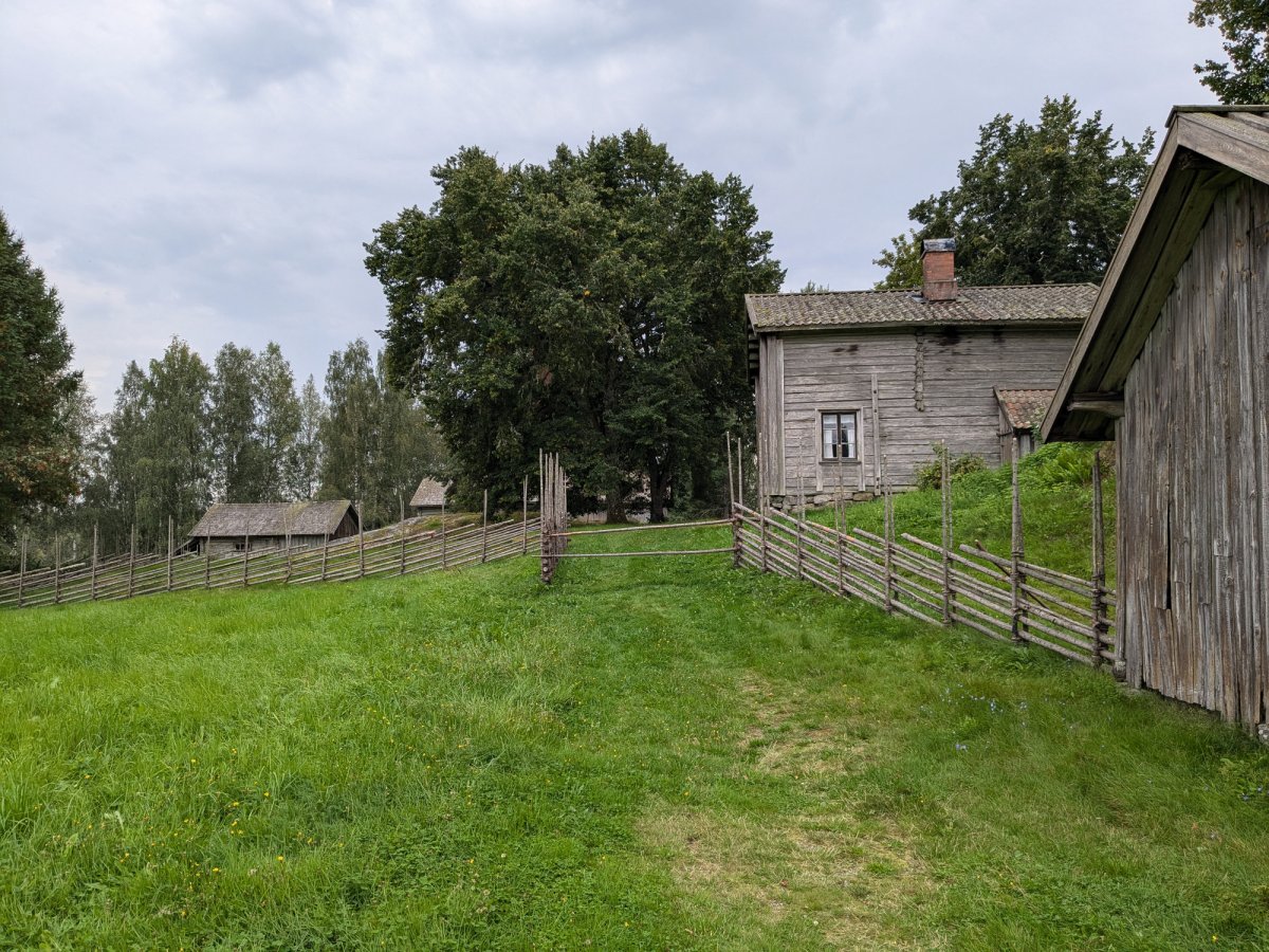 Ganz in der Nähe war auf der Karte eine Sehenswürdigkeit eingezeichnet. Da wollten wir gerne hin. Nachdem wir unser Zelt aufgebaut hatten, schwangen wir uns erneut ins Boot und machten einen Abstecher zur Sehenswürdigkeit – ein alter Bauernhof. Die verschiedenen Häuschen (hauptsächlich Ställe für Viehzucht) waren um einen zentralen Platz angeordnet und stammten teilweise aus dem 18. Jahrhundert. Insgesamt hat sich der kurze Ausflug auf jeden Fall gelohnt.