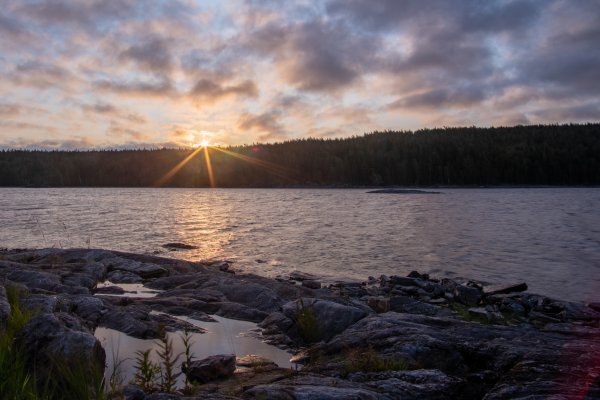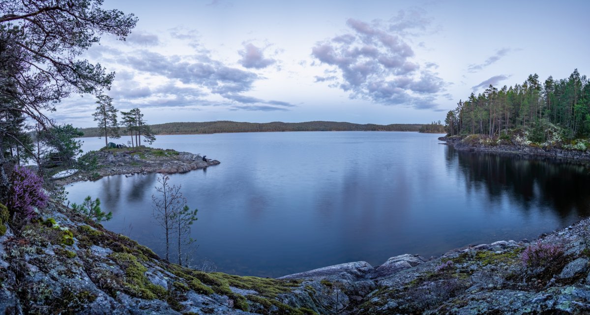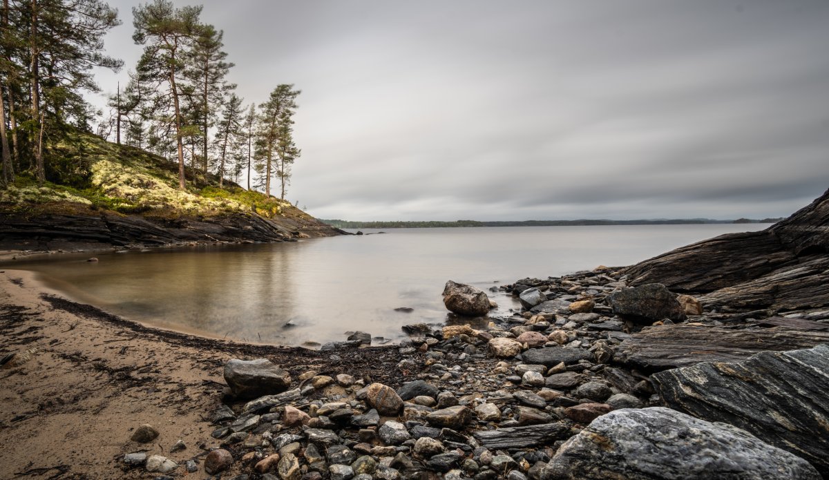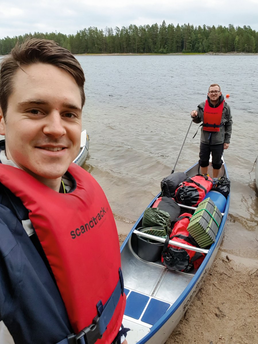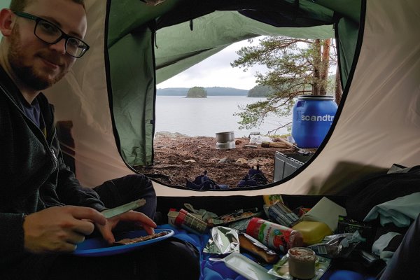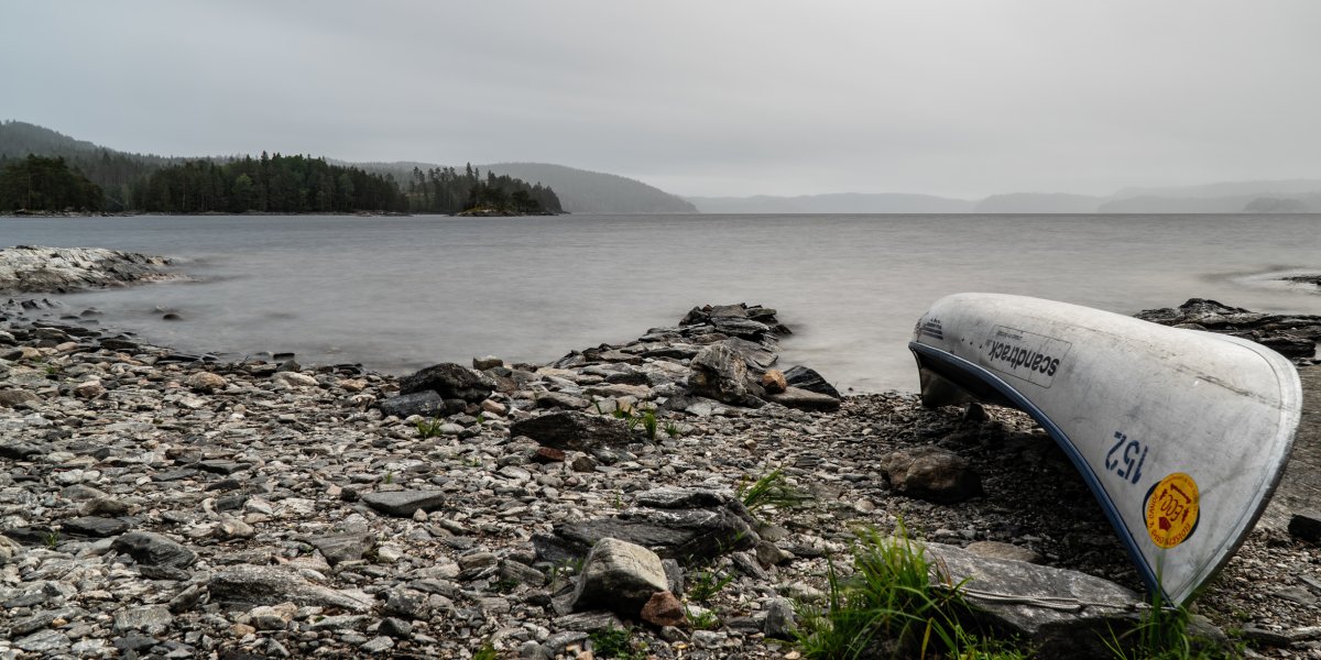 Ihr werdet es nicht glauben: es schien die Sonne! Im Camp gab es zunächst Kaffee zum wach werden, kalte Getränke und einen warmen Snack. Nach einer Verschnaufpause ging es weiter durch einen schmalen Waldweg zu der ca. 600m entfernten Zelt- und Ausrüstungsausgabe. Wer nicht weiß, wie schwer 20 kg Gepäck sind, wird es spätestens danach wissen. In unserem Falle 20 kg schlecht gepacktes Gepäck. Zumindest waren wir froh über unsere wasserdichten Outdoorschuhe. Denn auch wenn aktuell die Sonne schien, war der Weg dorthin sehr uneben und zeitweise auch matschig. Nachdem wir unsere Ausrüstung für die nächsten 7 Tage erhalten haben und unsere Sachen wasserdicht verpackt haben, ging es weiter zum Strand zu den Kanus. Es gab eine kurze Einweisung. Unsere Route hatten wir schon vorher festgelegt. Zum Glück haben wir, bevor es aufs Wasser ging noch einen Mitarbeiter von Scandtrack zu unserer Route befragt. Auf der von uns geplanten Route hätten wir mehrere Male umtragen müssen. Und nach der heutigen Schlepperei stand für uns fest, dass wir das auf keinen Fall wollen. Somit haben wir unserer Route kurzerhand umgeplant. Für uns stand fest, dass wir an Orte wollen, wo möglichst wenig Menschen sind. Also stand fest, dass es in Richtung Norwegen geht. Dann ging es endlich aufs Wasser.
