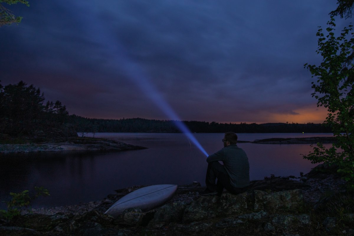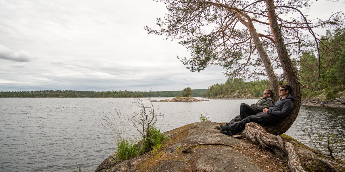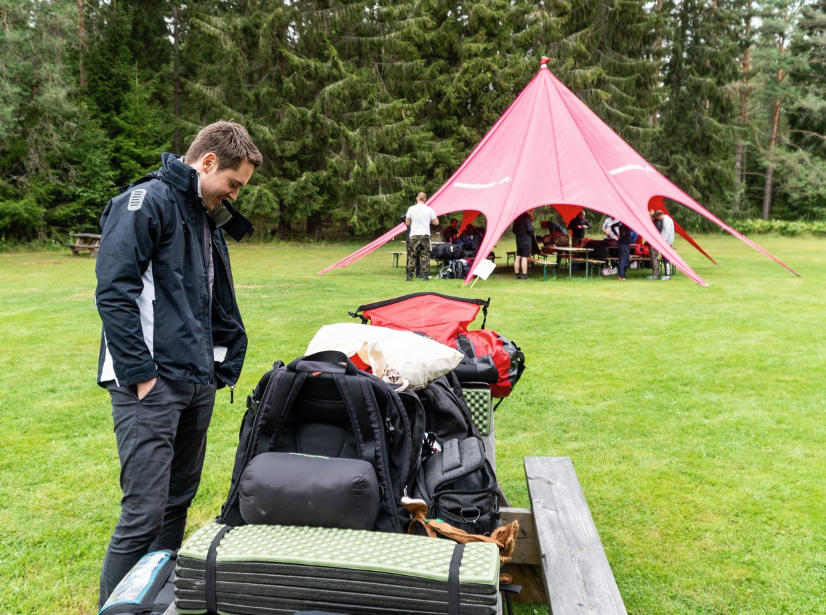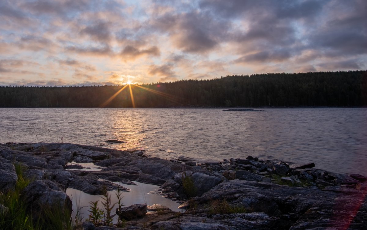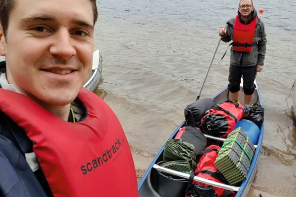 Ihr werdet es nicht glauben: es schien die Sonne! Im Camp gab es zunächst Kaffee zum wach werden, kalte Getränke und einen warmen Snack. Nach einer Verschnaufpause ging es weiter durch einen schmalen Waldweg zu der ca. 600m entfernten Zelt- und Ausrüstungsausgabe. Wer nicht weiß, wie schwer 20 kg Gepäck sind, wird es spätestens danach wissen. In unserem Falle 20 kg schlecht gepacktes Gepäck. Zumindest waren wir froh über unsere wasserdichten Outdoorschuhe. Denn auch wenn aktuell die Sonne schien, war der Weg dorthin sehr uneben und zeitweise auch matschig. Nachdem wir unsere Ausrüstung für die nächsten 7 Tage erhalten haben und unsere Sachen wasserdicht verpackt haben, ging es weiter zum Strand zu den Kanus. Es gab eine kurze Einweisung. Unsere Route hatten wir schon vorher festgelegt. Zum Glück haben wir, bevor es aufs Wasser ging noch einen Mitarbeiter von Scandtrack zu unserer Route befragt. Auf der von uns geplanten Route hätten wir mehrere Male umtragen müssen. Und nach der heutigen Schlepperei stand für uns fest, dass wir das auf keinen Fall wollen. Somit haben wir unserer Route kurzerhand umgeplant. Für uns stand fest, dass wir an Orte wollen, wo möglichst wenig Menschen sind. Also stand fest, dass es in Richtung Norwegen geht. Dann ging es endlich aufs Wasser.