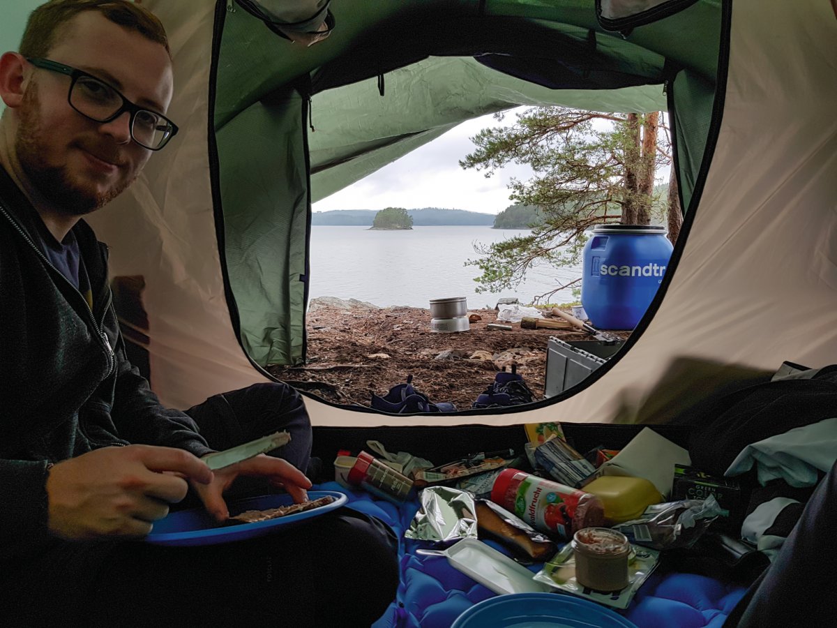Das Erste was, uns nach dem Aufwachen auffiel war, dass es aufgehört hatte zu regnen. Auch das Zelt hatte die stürmische Nacht auch ganz gut überstanden. Ein kleines bisschen Wasser ist rein gekommen, ansonsten war es weitestgehend trocken. Ganz im Gegensatz zu dem Boden. Das Wort Wasserbett bekommt in dem Zusammenhang eine ganz andere Bedeutung. Unter dem Zelt stand ca. 3-4 cm hoch das Wasser. Zum Glück war der Zeltboden aber dicht, sodass kein Wasser rein gekommen ist. Leider lagen nicht alle Sachen unter dem Tarp. Und die graue Scandtreck Kiste ist leider auch nicht wasserfest. Da war vor allem Ausrüstung drin wie Säge, Seile, Beil und leider auch unser Toilettenpapier.