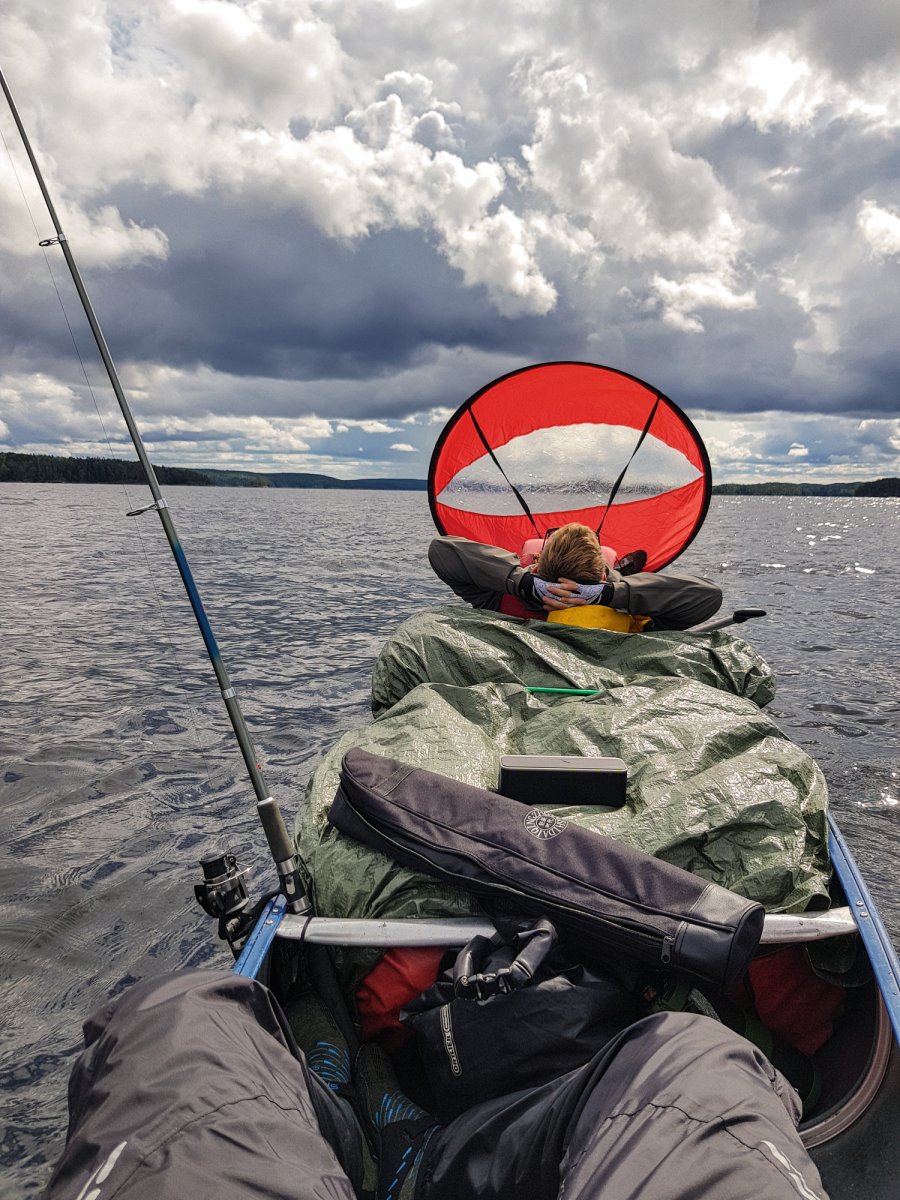 Das frühe Aufstehen hat sich gelohnt. Die Sonne schien und wir hatten ca. 20 °C. Wir machten uns Frühstück und überlegten uns, wo wir hinwollten. Zuerst versuchten wir in Norwegen einen netten Platz zu finden. Während wir ein paar erfolgsversprechende Stellen an, angelten vom Kanu aus. (Dafür nutzen wir Google Maps. Insgesamt hat man hier in der Region fast überall Internet). Leider waren wir nicht sehr erfolgreich. Weder beim Angeln, noch bei der Platzsuche. Also entschlossen wir uns, wieder nach Schweden zu fahren und dort weiter zu suchen. Der Wind, der letzten Tage, hatte zwar etwas nachgelassen, aber das Segel hat uns trotzdem an unseren nächsten und bisher schönsten Lagerplatz gebracht.