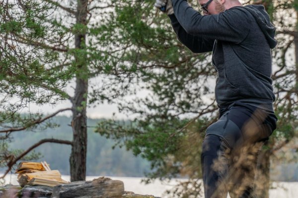 Nachdem wir die Insel erreichten, haben wir uns in dem Dano eingerichtet. Als nächstes ging es ans Feuerholz suchen. Im Nachhinein hätten wir im Camp mehr Feuerholz kaufen sollen, da nicht an jedem Dano Feuerholz vorrätig ist. Wir hatten aber damit gerechnet, dass es einfacher wäre, Holz zu finden, dem war aber nicht so. Wir hatten Glück und zwei etwas feuchte Stämme gefunden, dadurch waren sie schwer zu tragen und auch sehr schwer zu spalten. Das hat ca. 2 Stunden gedauert. Aber dafür wurden wir mit einem schönen, warmen Feuer belohnt.