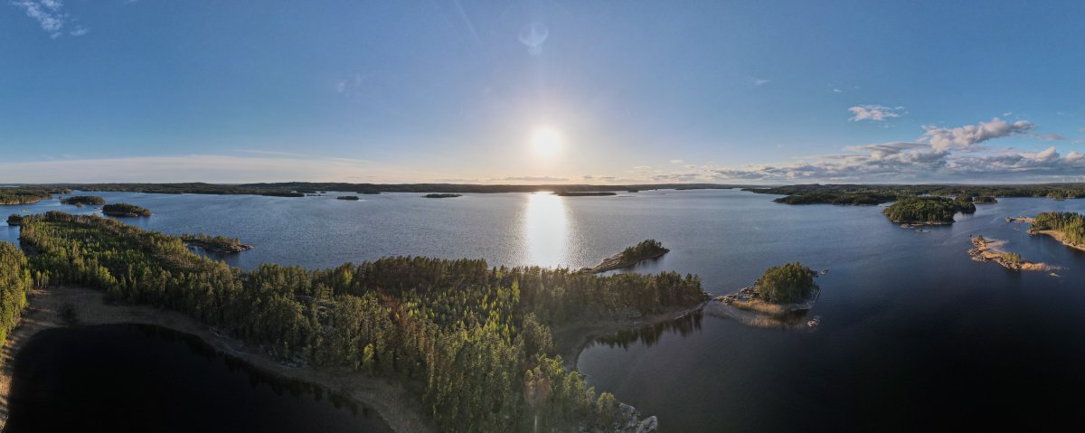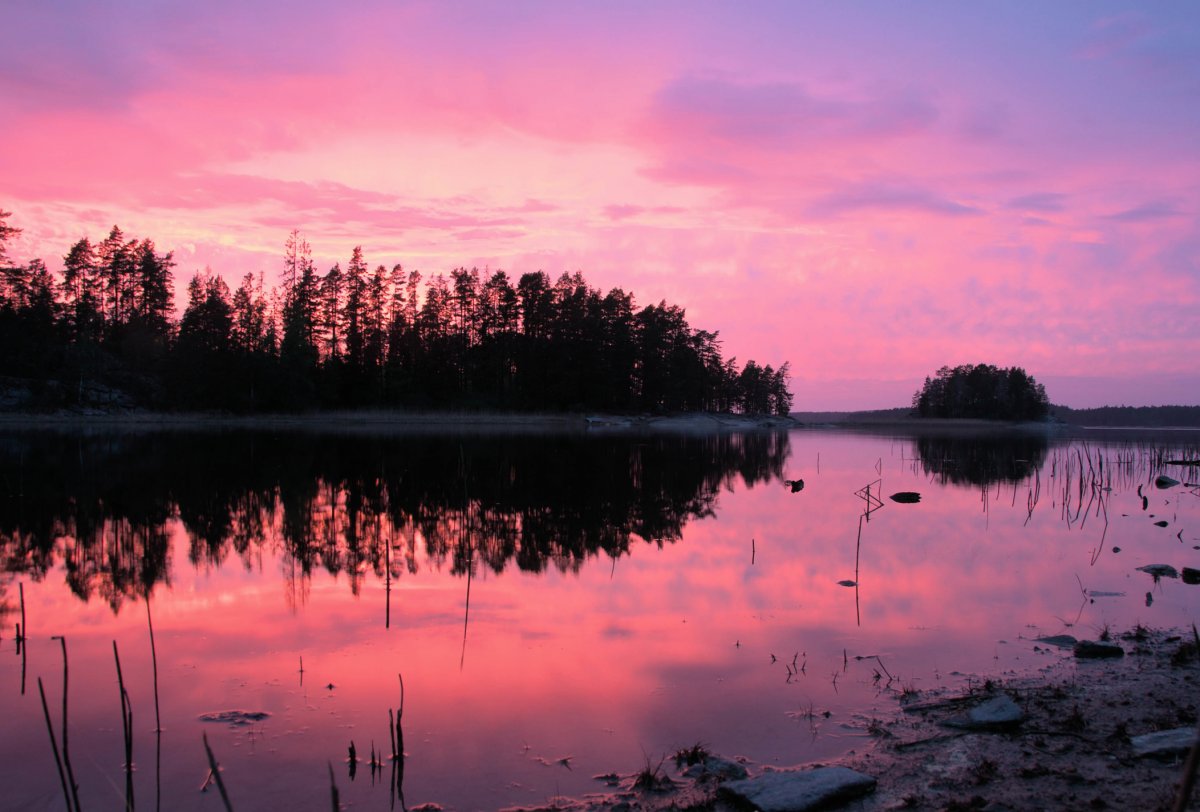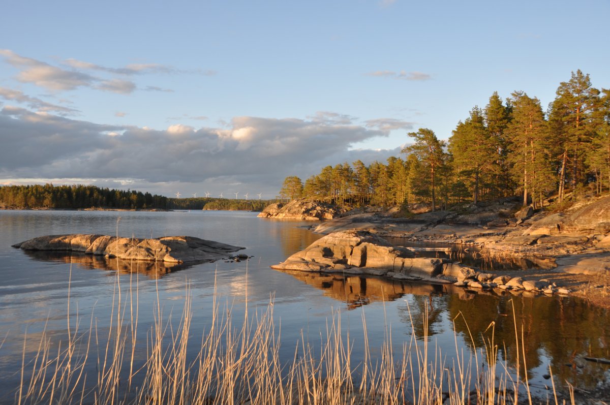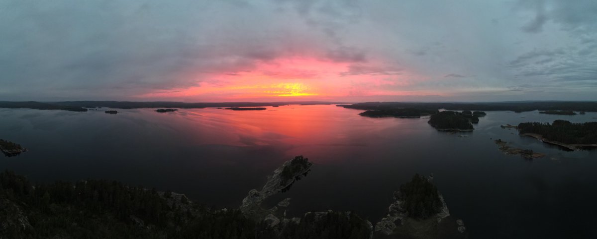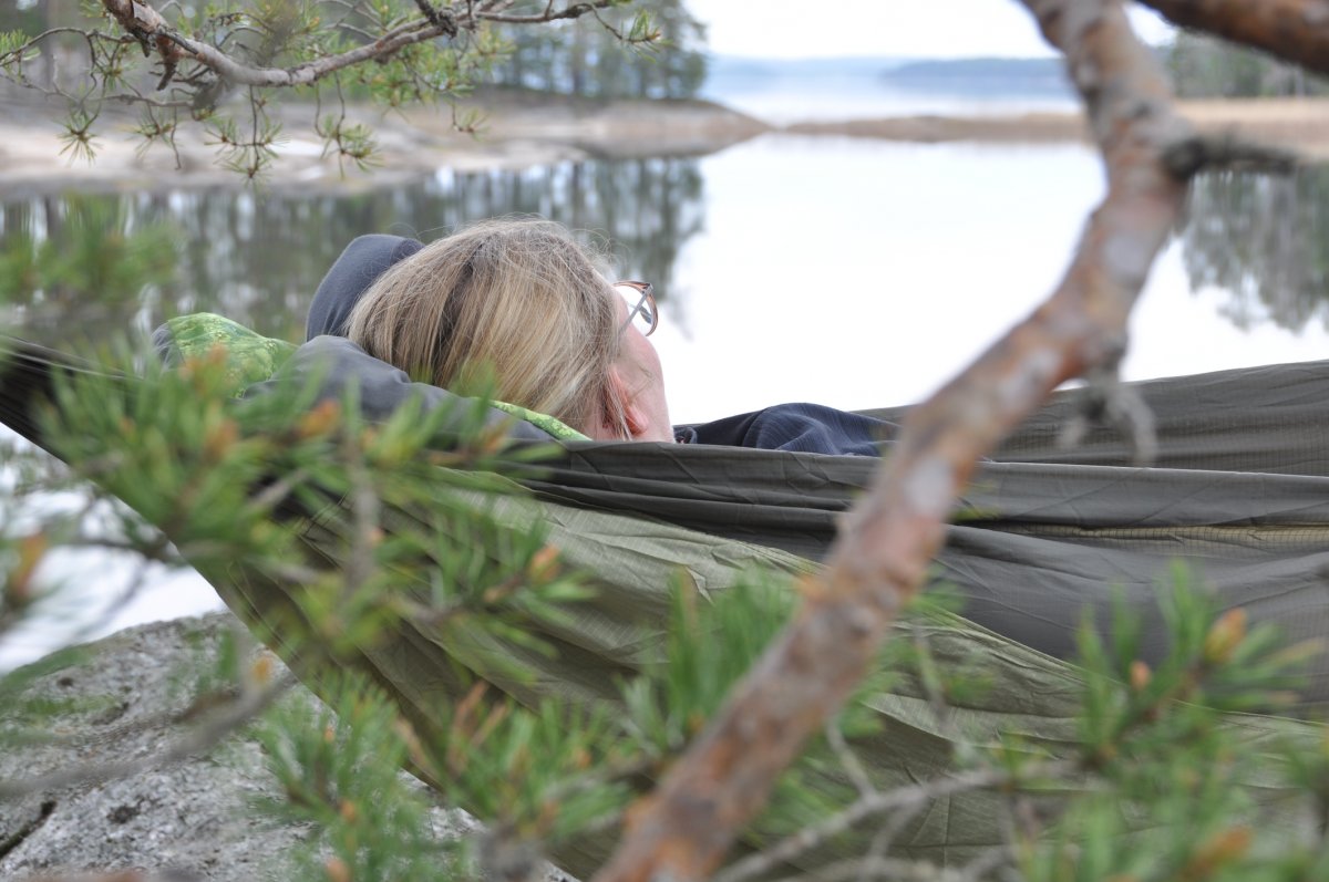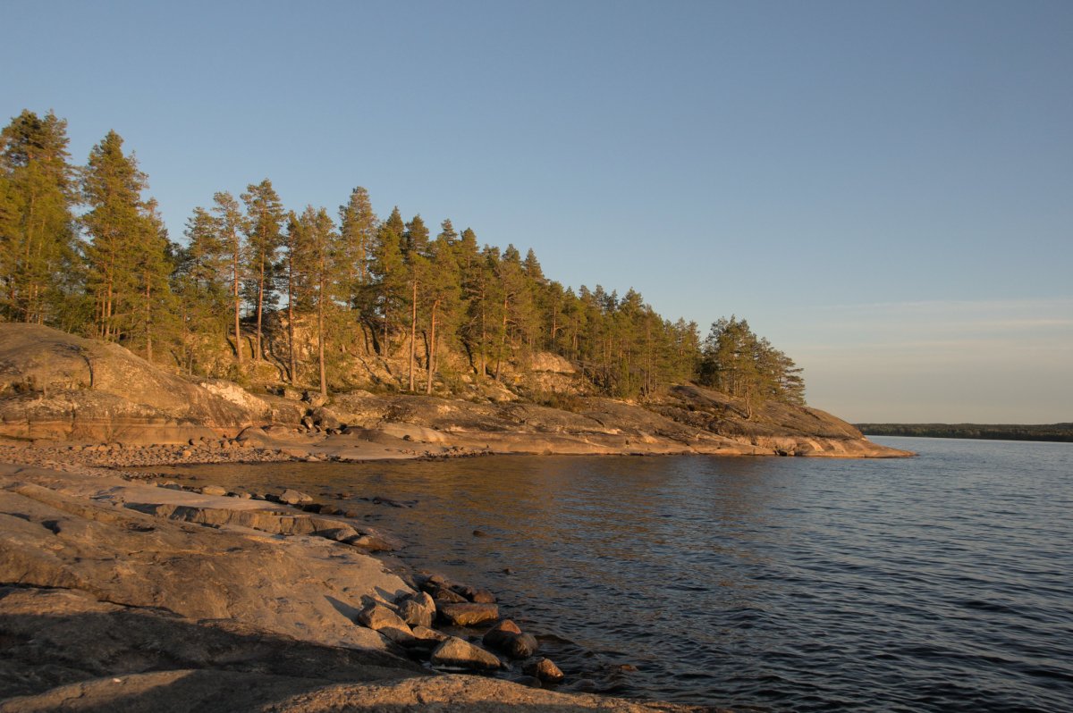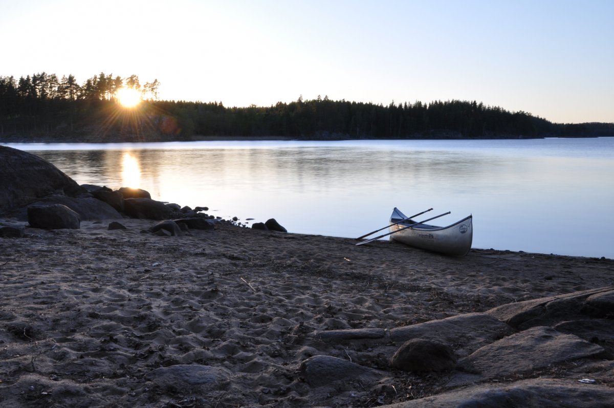 Bereits vor der Abfahrt hatten wir uns ungefähr angeschaut, wie unsere Tour aussehen könnte. Aber es wird schnell klar, daraus wird nichts. Es ist windig, auf dem Foxen ordentlich Wellengang und Sebastian hat Mühe, das Boot zu steuern. Auch die anderen Paddler rings um uns kämpfen mit Wind und Wellen. Gefühlt noch in Sichtweite vom Camp finden wir eine kleine windgeschützte Bucht. Aus „lass uns mal kurz Pause machen“ wird rasch „schön hier, lass uns bleiben“. Der Platz ist kein offizielles Dano aber wir finden eine Feuerstelle und jede Menge trockenes Holz. Das Zelt ist schnell aufgebaut, die Hängematte zwischen zwei Bäumen gespannt und dann wird erstmal geschaut, was die „Fresstonne“ so hergibt. Bei unserer Planung haben wir uns komplett auf den Inhalt der Tonne verlassen, also auch kein Bier auf der Fähre gekauft und die Option, unterwegs einen Supermarkt anzusteuern haben wir auch gar nicht erst in Betracht gezogen. Aber es ist alles da was unser Herz begehrt und am Abend brutzeln Bratkartoffeln mit Speck in unserer Pfanne und dazu ein frischer Salat. Wir sitzen noch ein bisschen am Feuer, aber der Wind ist doch immer noch recht frisch und mit unserem ersten, wunderbaren Sonnenuntergang gehen wir ins Bett.
