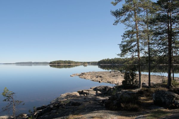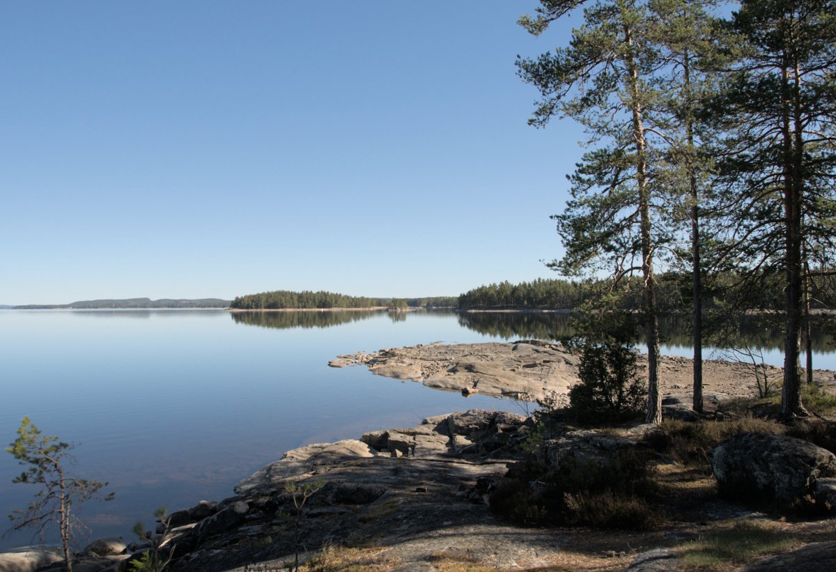 Die Sonne lacht von einem strahlend blauen Himmel und es wird schnell warm. Ich mache schon mal Feuer und bereite das Frühstück vor, während Sebastian heute so gar nicht motiviert ist, aufzustehen – geschweige denn ins Boot zu steigen und zu paddeln. Aber es bleibt ihm nichts anderes übrig und so sitzen wir gegen 11 wieder im Kanu und paddeln gemächlich weiter. Links und rechts tauchen immer wieder hübsche Häuschen auf, dazwischen die bekannten Felsen und Wälder. Eigentlich ist unser Ziel Dano 35. Nach nur zwei Kilometern sehen wir Dano 36 und entscheiden sofort, zu bleiben. Dieses Dano ist einfach traumhaft gelegen, eine kleine Halbinsel bietet einen herrlichen Rundumblick. Nach der kalten Nacht hatten wir entschieden, in jedem Fall wieder im Zelt zu schlafen. Hier stellt sich die Frage nicht, da dies ein „Dano ohne Dano“ ist, das heißt es gibt nur die Feuerstelle und eine Toilette.