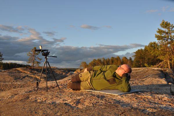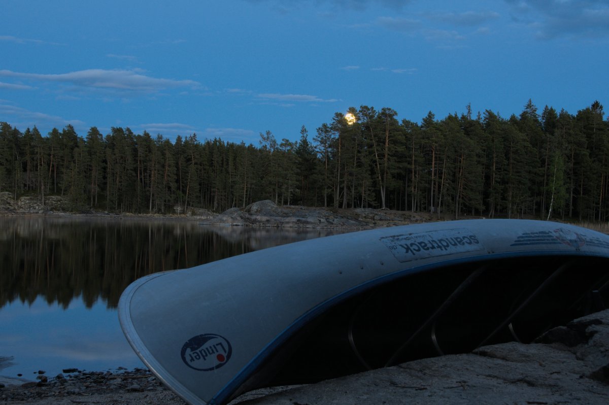 Mich beschäftigt an diesem Nachmittag erst mal meine eigene Unzufriedenheit weil mir die gefahrene km-Zahl eigentlich zu wenig ist, ich bin vorher davon ausgegangen, dass wir eine Runde fahren werden. Aber in unserem Boot sitzen zwei Personen und beide müssen sich wohlfühlen. Also verabschiede ich mich gedanklich von der Runde und entscheide, es so zu genießen, wie es kommt. Bei der herrlichen Landschaft, Sonne und Begleitung ist das auch ziemlich einfach. Der Nachmittag ist gefüllt mit Holz sägen und hacken. Sebastian zeigt mir, worauf ich achten muss. An einem Baum klebt ganz viel Harz, das sammle ich, um das nächste Feuer besser in Gang zu bringen. Zum Abendessen gibt es die Dose gefüllte Paprika, dazu Kartoffeln und Gemüse. Als der Tag langsam zu Ende geht, laufen wir nochmal ein Stückchen auf die andere Seite der Insel zum Sonnenuntergang kucken. Ein absolutes Highlight, denn nach den herrlichen Farben, die die Sonne immer noch am Himmel malt, steht auf der anderen Seite des Himmels ein herrlicher Vollmond. Die Kameras laufen heiß...
