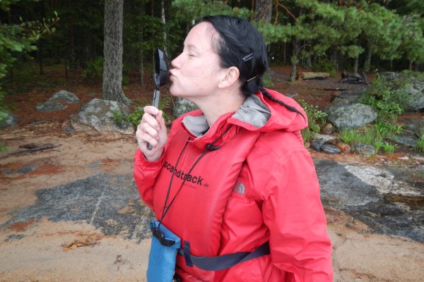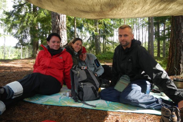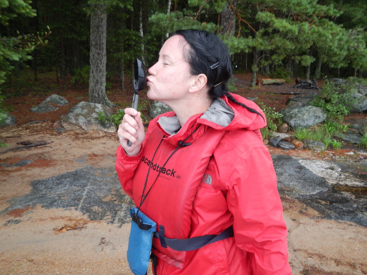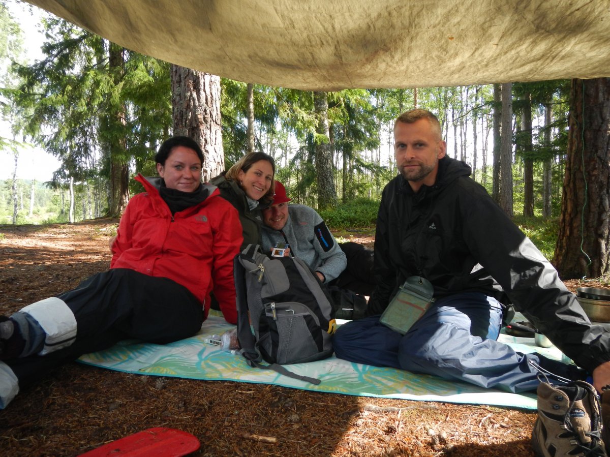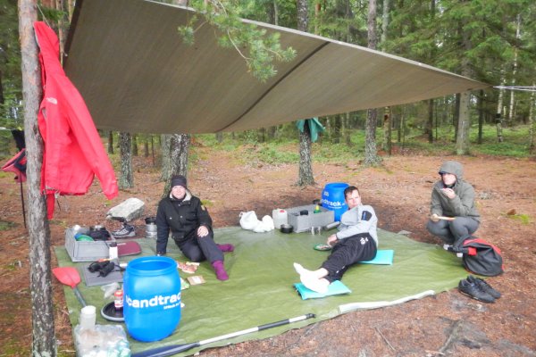 Die Fahrt dorthin glich wieder einer kleinen Wildwasserfahrt :-) Ziemlich windig und nass ... Auf Tröllon gibt es zwei Danos... Beide waren voll mit vielen Personen. Egal, wir legten trotzdem erstmal am Dano 8 (das nördlichere der beiden Danos) an. Hier waren 5 Personen im Dano. Es regnete gerade sehr stark. Wir luden trotzdem aus und bastelten uns aus dem Tarp einen Unterschlupf. Das andere Tarp legten wir auf den Boden, eine Picknickdecke darüber und setzten uns in den Regen. Durch das Tarp wurden wir aber nicht nass. Es war irgendwie gemütlich... Tee und Kekse schmeckten auch wieder besonders gut :-)
