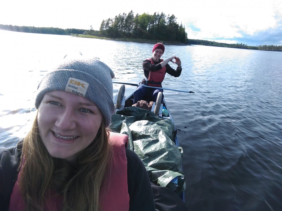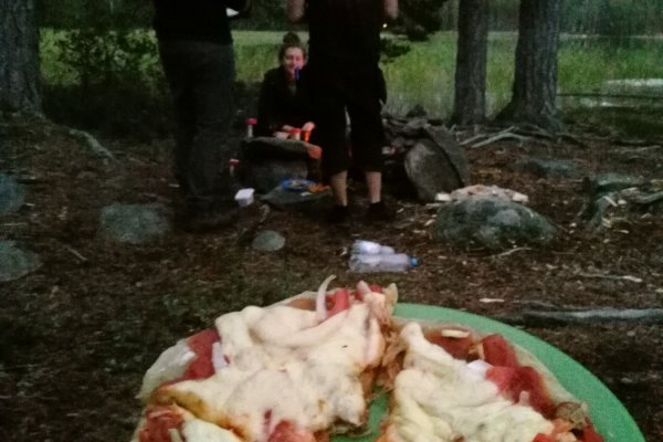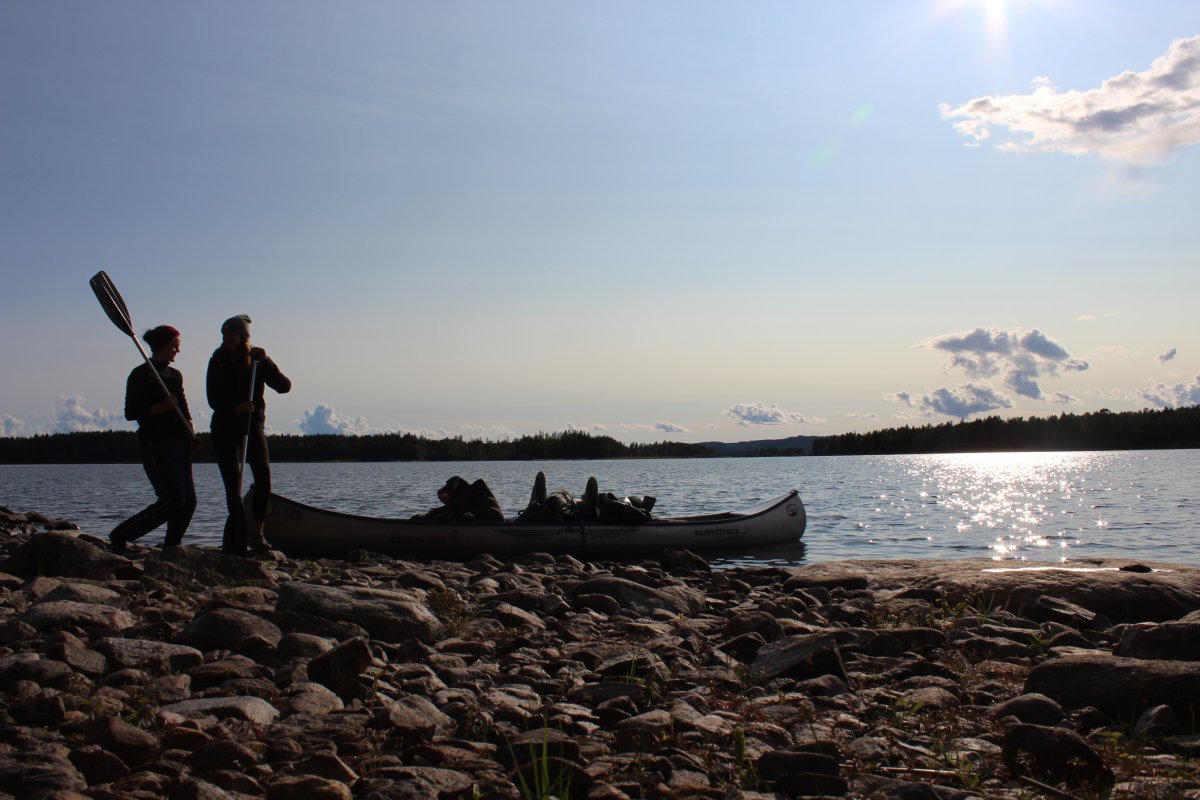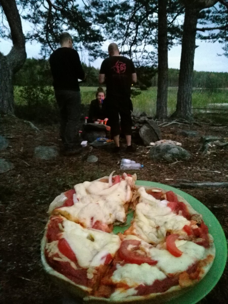 Für den nächsten Morgen stellten wir zum ersten Mal den Wecker, um im Laufe des Tages eine ordentliche Strecke zurückzulegen. Der Regen machte uns aber einen Strich durch die Rechnung. Kletschnass werden oder weiterschlafen? Definitiv weiterschlafen! Das war auf jeden Fall die richtige Entscheidung. Beim zweiten Aufwachen lachte uns die Sonne an. Anders als der Vortag, war dieser durch Erfolgserlebnisse geprägt. So mussten wir beim Umsetzen nicht einmal unser Kanu ausräumen. Da soll uns noch einmal jemand sagen, zwei Mädels alleine würden das Umpacken nicht schaffen. Um den Gegenwind auszublenden, begannen wir wieder mal zu singen. Mittlerweile waren wir schon bei den Liedern unserer Kindheit und Jugend angelangt. In der Ferne ließ sich eine Person erkennen, die uns durchaus bekannt vorkam. Kaum zu glauben, trafen wir erneut unsere alten Bekannten und entschlossen uns dazu, den vorletzten Abend mit ihnen zu verbringen. Mittlerweile waren wir ein eingespieltes Team. Während die einen angelten, bereiteten die anderen den Pizzaofen vor. Arbeitsteilung und handwerkliches Geschick ermöglichten uns ein Festmahl. Am Lagerfeuer und mit Blick auf einen klaren Sternenhimmel genossen wir unsere Pizzen und die gemeinsame Zeit.