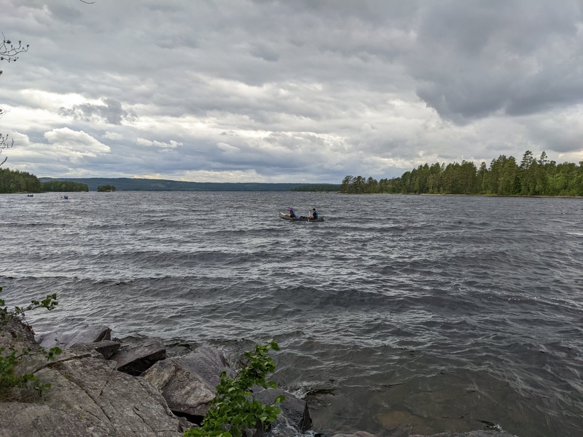 Am Morgen war es noch windig, und für mich war es wieder eine Mutprobe, die Bucht von Glava Glasbruk zu durchqueren. Wegen des Wellenganges hatten wir uns vorgenommen, nur die Bucht zu überqueren und unser Lager an der Schutzhütte 16 aufzubauen. Doch die Suche nach Platz 16 wurde zur Odyssee. Zuerst versuchten wir den Platz durch die Bucht Stockviken zu erreichen. Der Wind trieb die Wellen genau in die schmale Bucht und wir wurden abenteuerlich mit dem Wind im Rücken mitgetragen. Der Wasserweg, der auf der Karte eingezeichnet war, war allerdings komplett zugewachsen, also beschloss ich, an Land zu gehen und zu schauen, ob man eventuell den Platz zu Fuß erreichen kann, während Christian im Boot auf mich wartete. Das Gelände war unübersichtlich und im Unterholz fand ich den auf der Karte eingezeichneten Weg zum Lagerplatz nicht. Als ich zum Boot zurückkehrte, stellte ich mit Entsetzen fest, dass ich unsere Karte im Unterholz verloren hatte. Wir machten das Boot an Land fest und mussten nun beide im Unterholz nach der verlorenen Karte suchen. Ich versuchte meinen Weg durch das Gebüsch zu rekonstruieren, so gut es ging. Panik stieg in mir auf. Woher sollten wir eine neue Karte bekommen? Auf die Handys war auch nicht zu einhundert Prozent verlass, da auf Maps die Rastplätze nicht eingezeichnet waren. Christian war in seinen leichten Laufschuhen unterwegs und zog sich noch eine Schürfwunde am Knöchel zu. Und dann plötzlich sah er die Karte. Wir waren gerettet und wurschtelten uns durchs Unterholz zurück zum Kanu. Nach dem Ausflug ans Land hatte der Wind nachgelassen. Auf der Suche nach einem Nachtlagerplatz fuhren wir um die Inseln Halvarsnäs und Märrholmen herum. Diese waren jedoch komplett zugewachsen mit Heidelbeersträuchern und so nutzten wir das gute Wetter am Nachmittag und überquerten den Stora Gla von Ost nach West mit dem Scandtrack Basislager Trångstadviken als Ziel. Am Nachmittag besuchten wir das Café Carl und gönnten uns je ein Wienerbröd (schwedisches Gebäck), Kaffee und Tee. Abends gingen wir noch zum Campingplatz von Lenungshammar um zu duschen. Das war ein schöner Abschluss des Tages.
