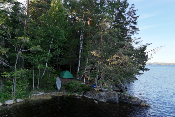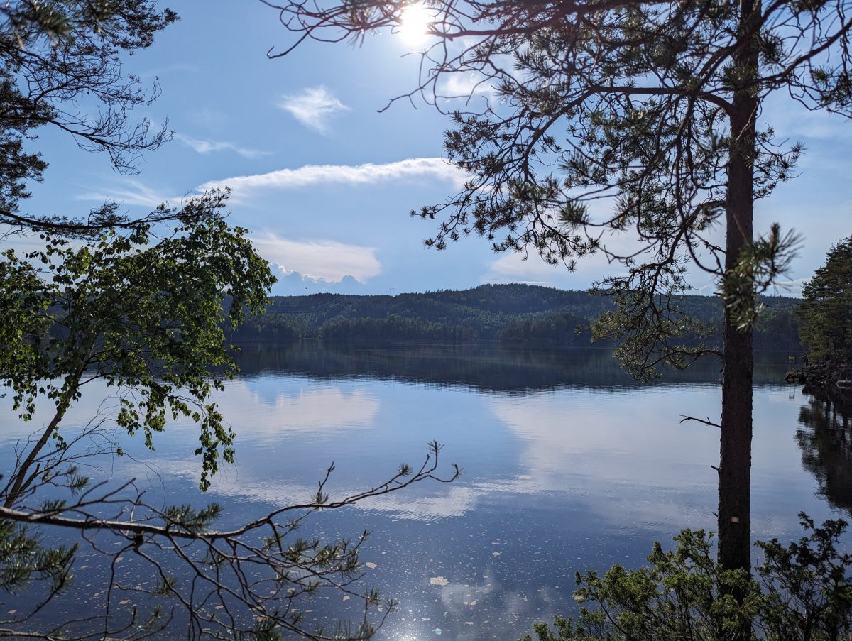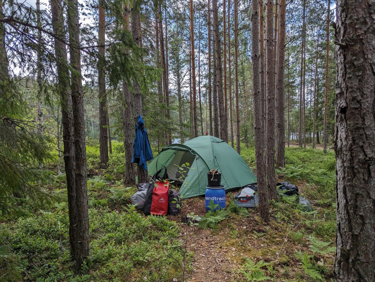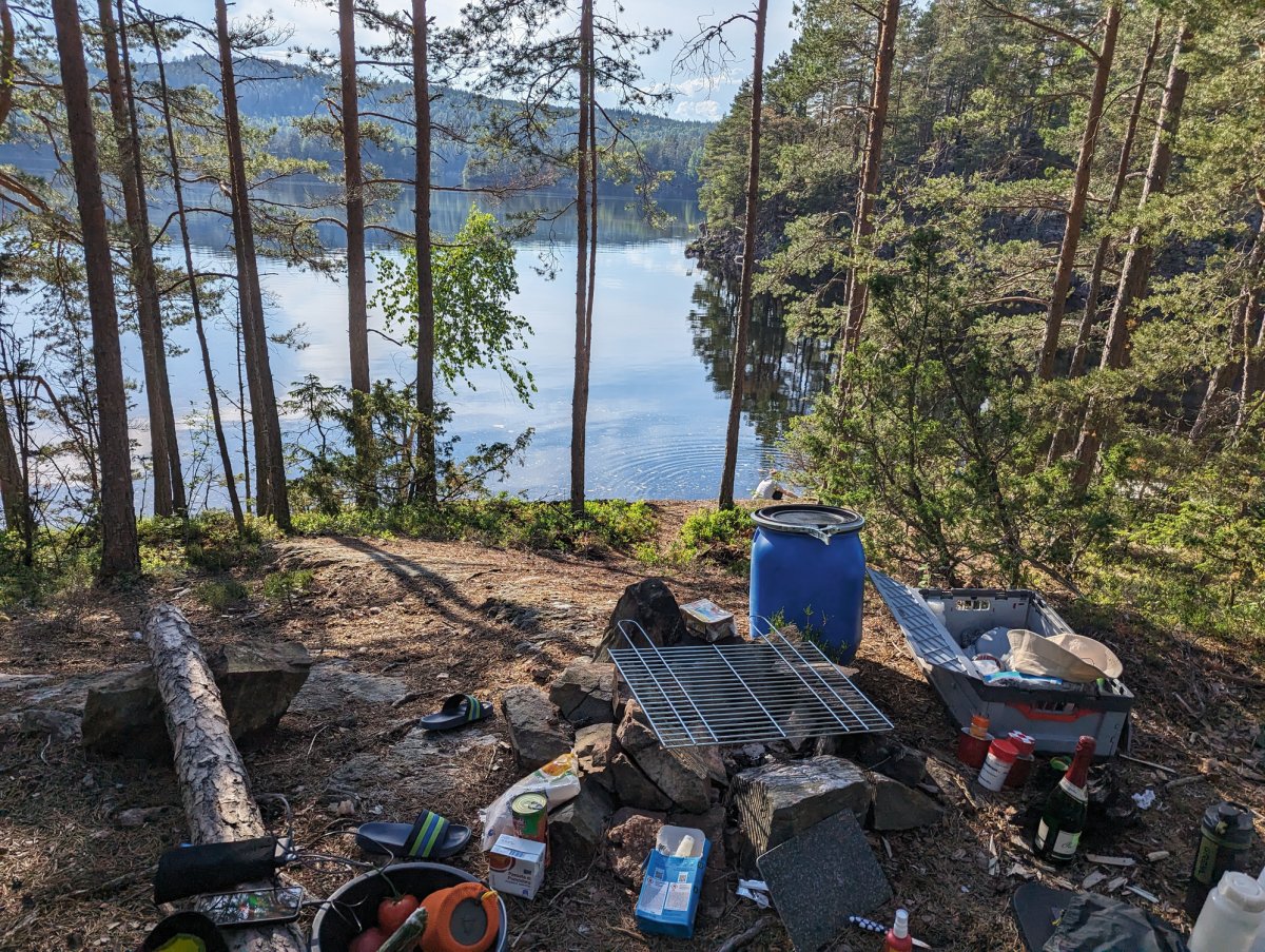 Zurück an unserem Lagerplatz bemerkten wir schnell unsere neuen Nachbarn. Auch an diesem Platz hatten wir tierische Mitbewohner. In der Nähe war eine kleine Vogelschutzinsel und dort befand sich ein Nest inkl. lautstarkem Vogelbaby. Wir haben das Konzert des Vögelchens dennoch sehr genossen. Am Abend packten wir unsere Angel einmal aus und versuchten ein fangfrisches Abendessen an Land zu holen, dies war aber leider nicht erfolgreich. Dank des umfangreichen Verpflegungspakets von Scandtrack konnten wir uns dann aber doch noch mit Tortellini verpflegen. So gingen wir nicht mit leerem Magen ins Zelt, sondern tiefenentspannt vom abendlichen Angeln.