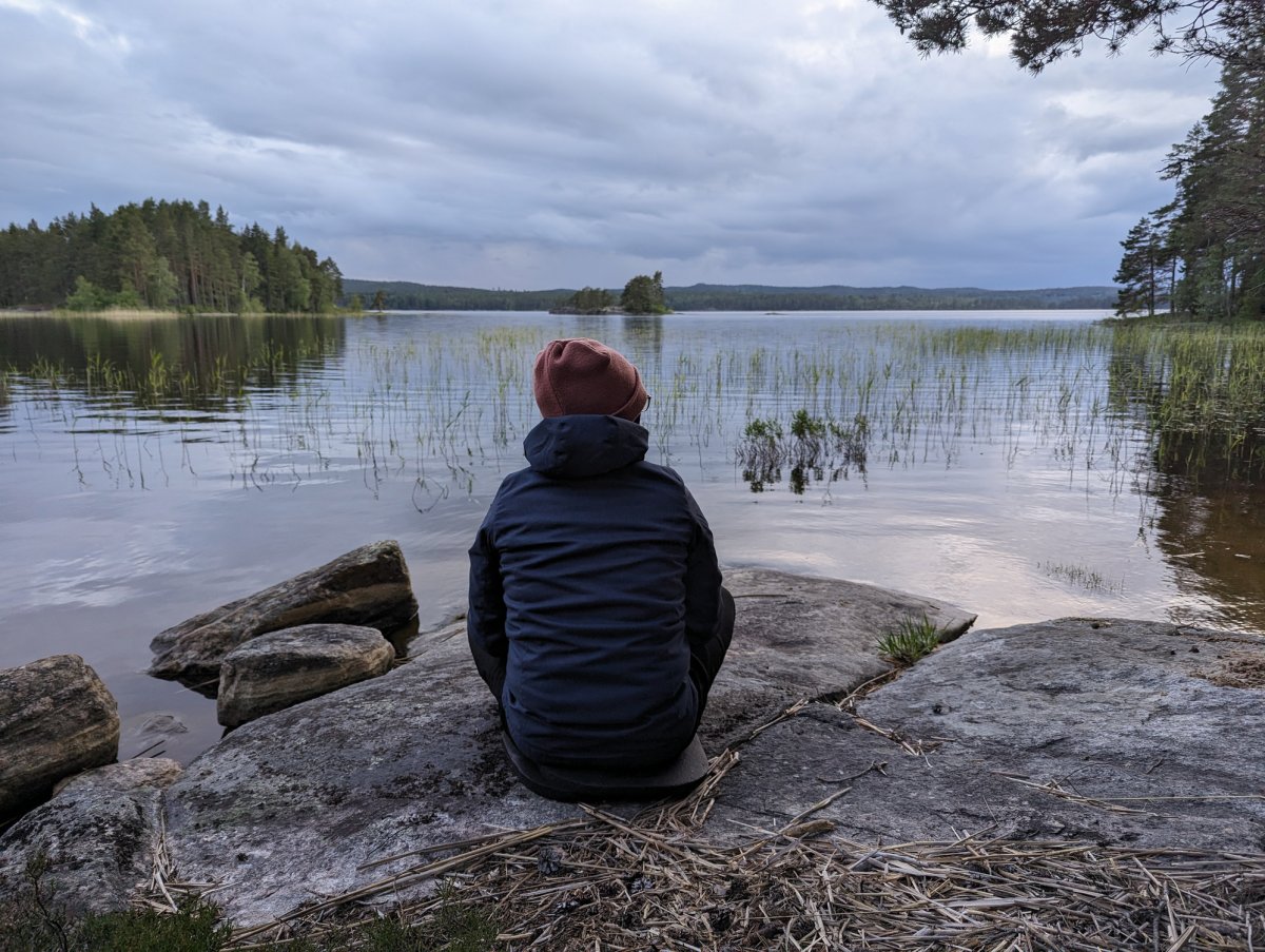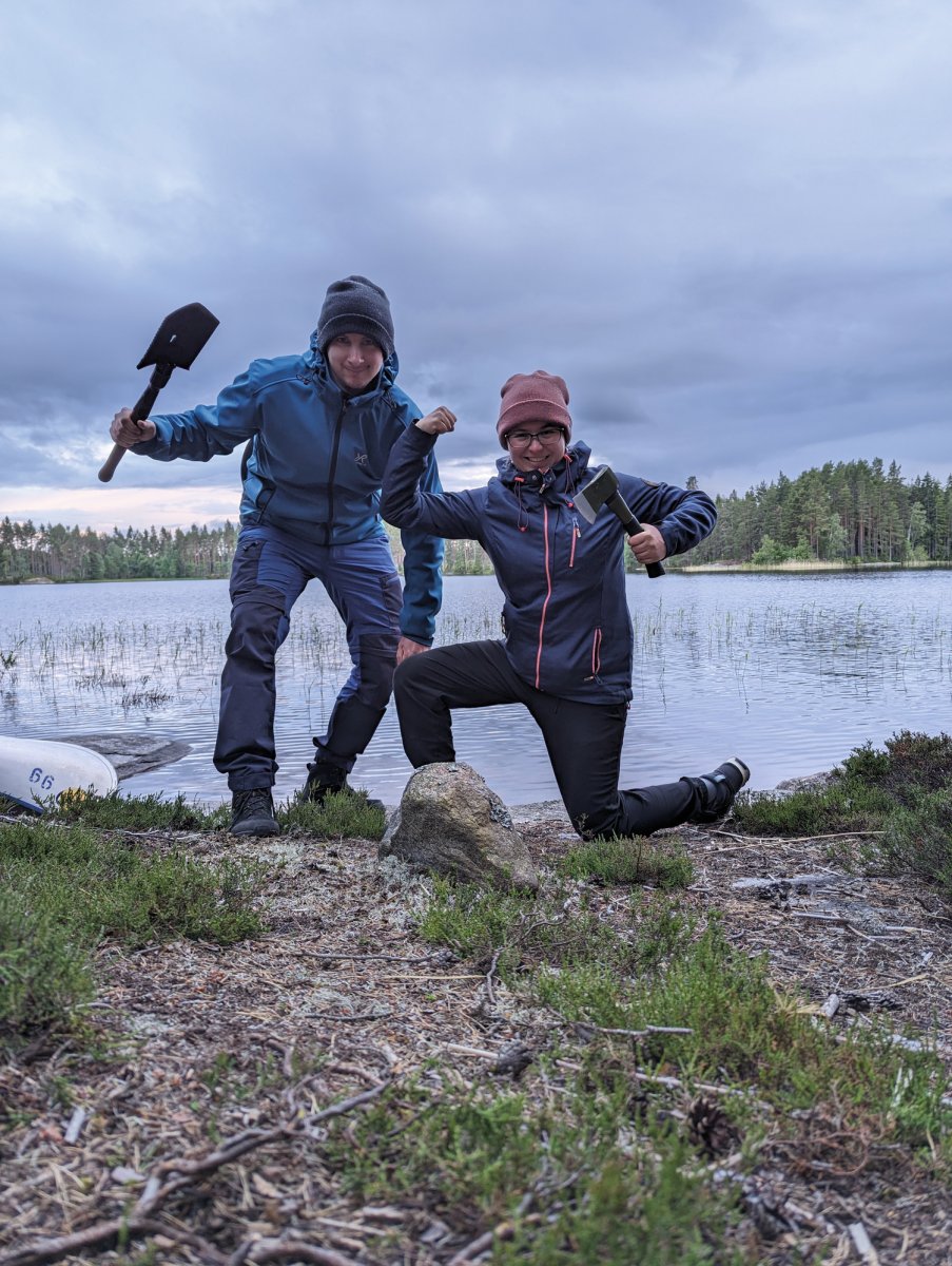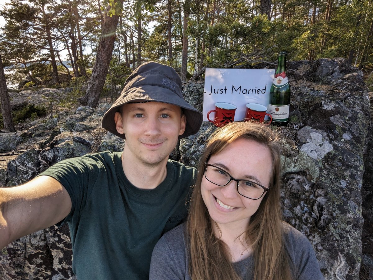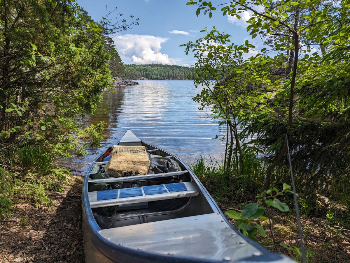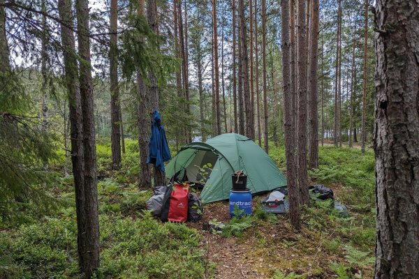 Das Abenteuer begann Anfang Juni nicht auf dem Wasser, sondern im Bus. Eine gemütliche 24-Stunden-Fahrt von Köln nach Schweden. Über Hamburg, Hannover und mit zwei Fährüberfahrten landeten wir in Lennartsfors. Unsere erste Erkenntnis: Auch der skandinavische Sommer ist nicht frei von Regen. Aber hey, es ist unsere Hochzeitsreise – da lassen wir uns von ein bisschen Regen doch nicht die Laune verderben! Nach der Ankunft ging es mit geballter Muskelkraft über Wiesen und Pfade zum Ausrüstungsverleih. Hier wurden wir vom Scandtrack-Team herzlich empfangen und mit einer Flasche Sekt und Scandtrack-Bechern zur Hochzeitsreise beschenkt, worüber wir uns sehr gefreut hatten. Vielen Dank nochmal! Wir packten unsere und die erhaltene Ausrüstung in wasserdichte Säcke und schon ging es los zu unserem Gefährt für die nächsten Tage, unserem Kanu. Nach ein paar Paddelschlägen kam auch wieder die Sonne raus und wir wussten: Das wird legendär. Wir machten Kurs zu unserem ersten Spot und bauten unser Lager für die Nacht auf. Der Aufbau unseres ersten Shelters klappte besser als gedacht. Die Aussicht von “unserem” kleinen Hügel war magisch. Hier befand sich leider direkt eine wilde Feuerstelle, die wir aufgrund der geltenden Regelung aber nicht nutzten. Nach getaner Arbeit gab es dann noch ein köstliches Abendessen bei Sonnenuntergang, die Tonne mit der Verpflegung bietet hier genug Auswahl für jeden.