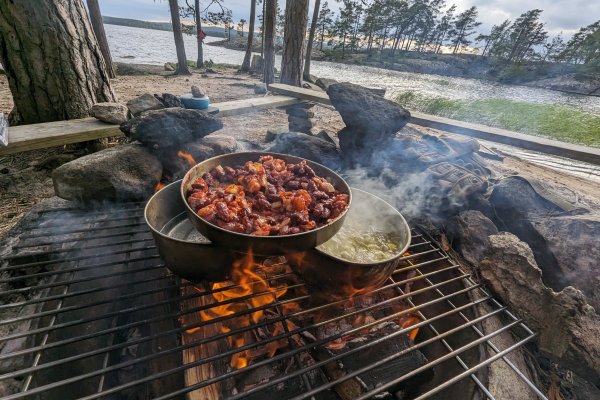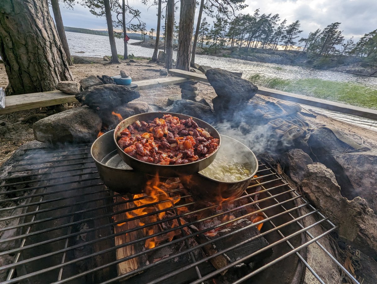 Der fünfte Tag und somit Halbzeit. Wie schnell die Tage bisher verflogen sind. Auch am fünften Tag erwartete uns keine Langeweile, im Gegenteil! Tag 5 brachte Wind. Viel Wind! Wir hatten uns angewöhnt, mindestens zweimal täglich die Wettervorhersage zu prüfen und wussten, dass die perfekten Sommertage erstmal etwas rauem Wetter Platz machen würden. Von Scandtrack per SMS vorgewarnt, unsere Route mit Bedacht zu planen, studierten wir am Morgen nochmal unseren Plan und machten uns auf den Weg. Das war ein anderes Fahrerlebnis als die letzten sonnigen Tage. Das Paddeln war anstrengender und die Wellen wurden höher. Angedacht war nach Osten zu fahren und in einem Flussarm vor dem kommenden Sturm Schutz zu suchen, aber die Wellen machten unser Vorankommen auf dem Wasser irgendwann fast unmöglich. Wir entschieden uns, auf Nummer sicher zu gehen, und haben mit DANO14 zum ersten Mal einen offiziellen Platz angefahren, damit wir dort unser zusätzlich erworbenes Feuerholz zum Wärmen nutzen können. Die Windböen mit 70 km/h am Nachmittag waren dann aber doch nochmal heftiger als wir es uns vorgestellt haben. Einen Großteil der Kraft an diesem Tag haben wir dafür aufgewendet, den Windschutz für unseren Lagerplatz zu verbessern, Holz zu hacken und die Wasserreserven (Wasserfilter!) aufzufüllen. Öl, das wir beim Kochen verwendeten, flog durch den Wind einfach zur Seite weg und erreichte nicht einmal mehr die Pfanne. Nachdem am Abend der Hunger und Durst gestillt und das Lager wetterfest gebaut war, fühlten wir uns, als hätten wir einen epischen Kampf mit der Natur gewonnen. Die Wärmflasche wurde in der Nacht unser bester Freund.