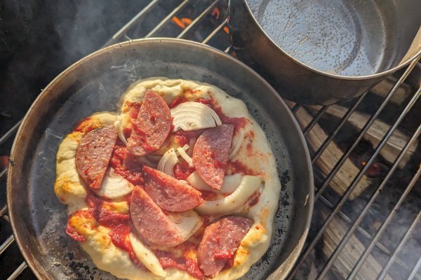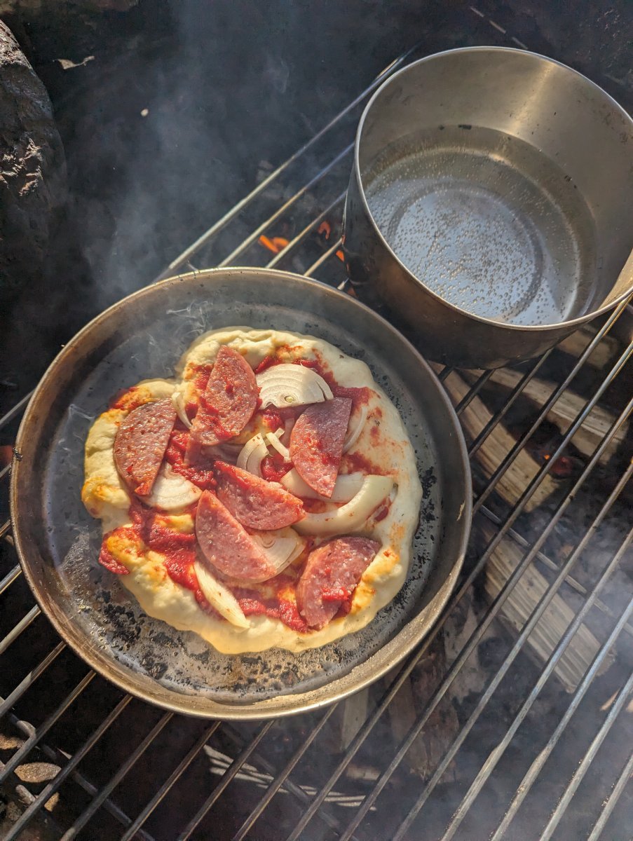 Der Sturm blieb die ganze Nacht und auch über den nächsten Tag. Nach Vorhersage sollte es erst am Morgen von Tag 7 wieder besser werden. An Weiterpaddeln oder Umziehen war nicht zu denken, hier zählt für uns vor allem “Sicherheit geht vor”. Vor allem, da wir erneut von Scandtrack per SMS gewarnt wurden. Am Tag verbesserten wir erstmal den Windschutz bei unserem Zelt noch weiter. Überraschenderweise kam morgens eine kleine Gruppe von Abenteuern über den Landweg zu uns (Das erste Mal wieder Menschenkontakt!). Die Gruppe hatte auf der anderen Seite der Insel wegen des Sturms notlanden müssen und suchte nach einem geeigneten Lagerplatz. Da DANO14 zwei Feuerstellen besitzt, beschloss die Gruppe zu ihren Booten zurückzukehren und vorsichtig zu uns rüberzufahren, allerdings kam diese Gruppe nicht mehr bei uns an. Gegen Abend haben wir dann auch erfahren warum: Es kam tatsächlich nochmal eine weitere Gruppe über den Landweg an unserem Platz vorbei. Im Gespräch stellte sich heraus, dass mehrere Teams auf der Insel Schutz gesucht hatten und dass die Gruppe vom Morgen auf dem Weg zu uns gekentert und von den anderen aus dem Wasser gezogen wurde. Es zeigte sich, die Natur sollte man niemals unterschätzen! Nach einem kurzen Erfahrungsaustausch machten wir uns noch eine Pizza am Lagerfeuer. Richtig gelesen: Pizza. Am Lagerfeuer. Sie schmeckte lecker, und wir waren überrascht, wie kreativ man in der Wildnis mit Essen umgehen kann (das Outdoor-Kochbuch ist klasse!). In Summe ein echter Wildnis-Tag, der uns Demut lehrte und uns zeigte, wie stark die Natur sein kann – und wie klein der Mensch daneben ist.