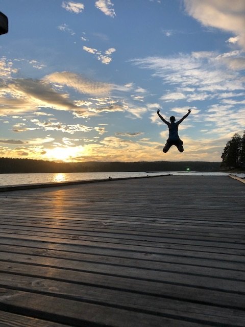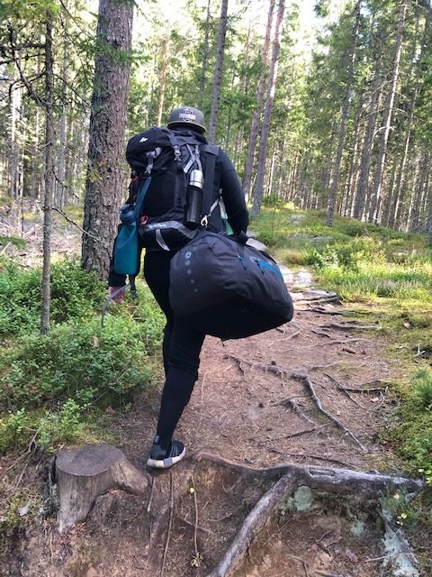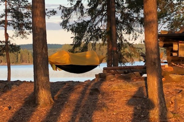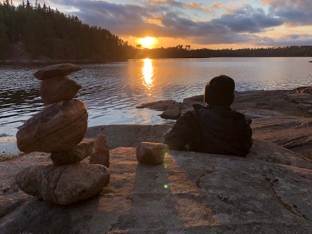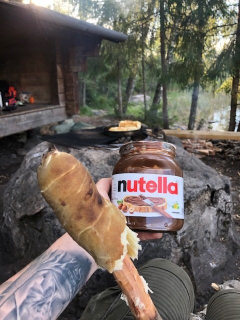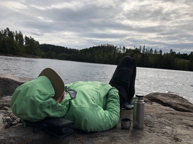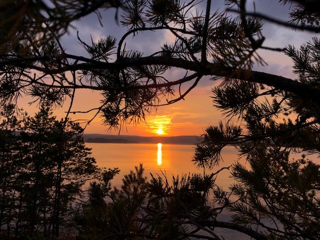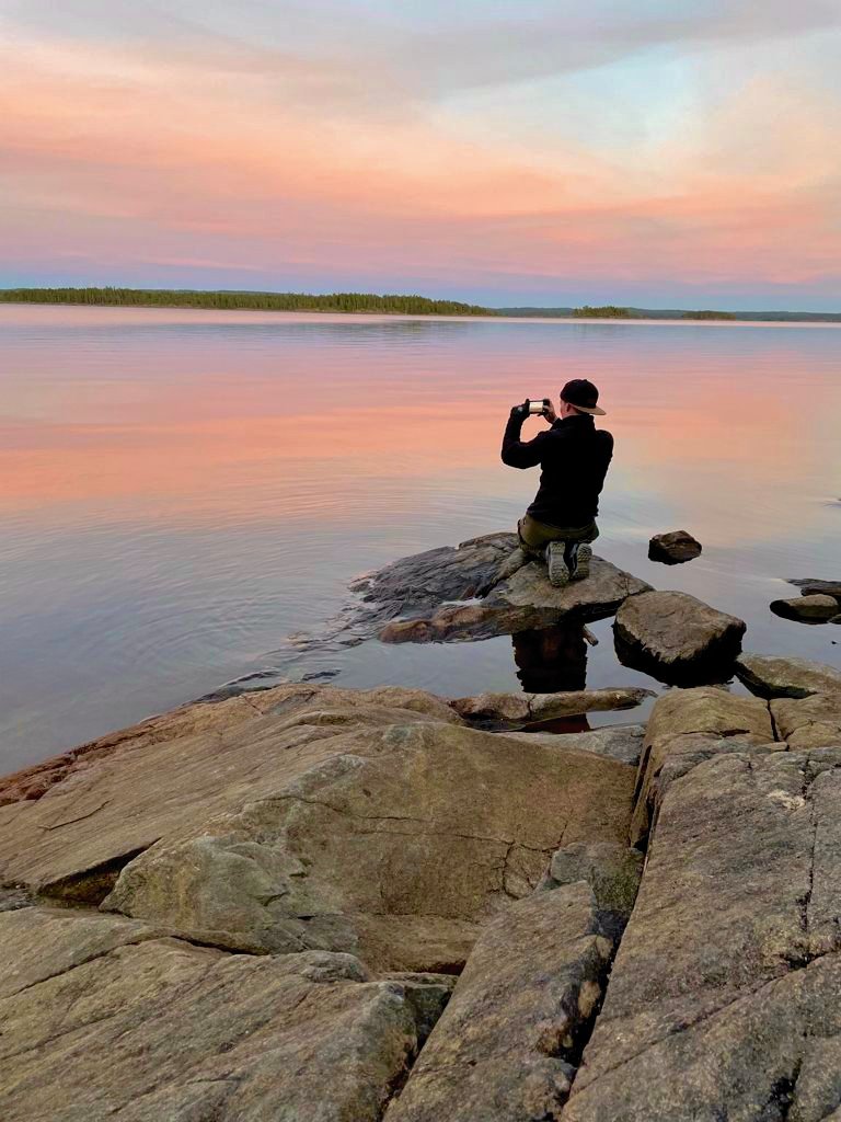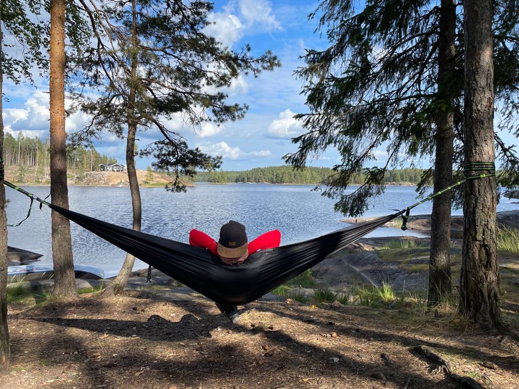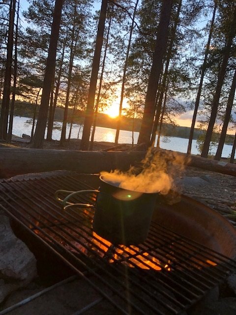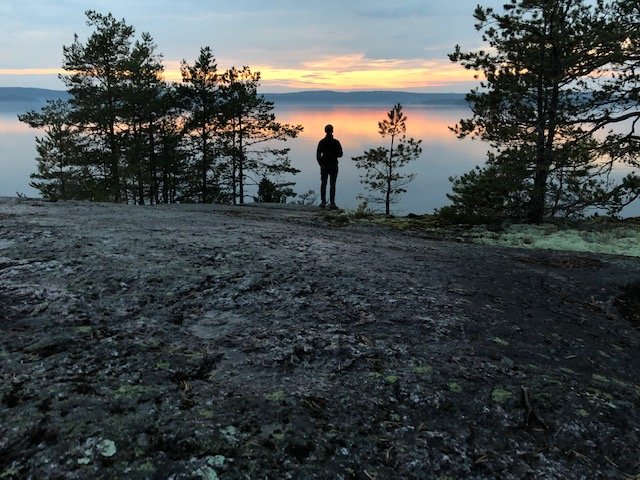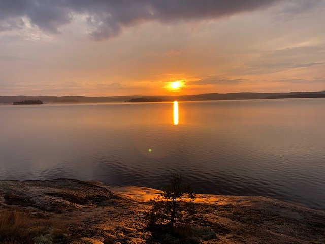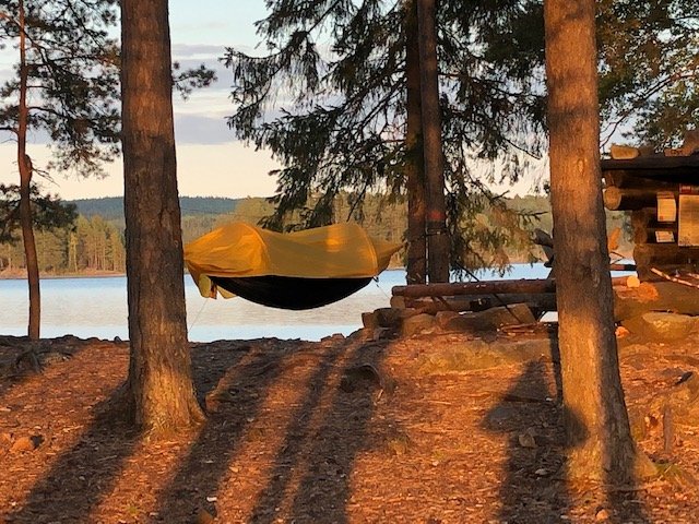 Nachdem wir dann gefrühstückt haben, packten wir zusammen und machten uns auf zum zweiten Spot. Ich weiß nicht was da mit uns los war, aber wir sind 15 KM gepaddelt. Ok vermutlich denken sich jetzt die Muskelmänner und super Athleten unter euch…“HA 15 Km…das ist ja nichts“ für uns war es echt ein Etappenziel und wir waren super glücklich nach den KM endlich an Spot 2 angelangt zu sein☺Es folgte das tägliche ausladen und aufbauen des Lagers, sowie Holz sägen und hacken. Da ich auch eigene Ausrüstung dabei hatte (ein Hängematten Zelt) wollte ich das natürlich auch ausprobieren. Im Nu war dann die Hängematte aufgehangen (ok ich gebe zu der Wind hat mich kurzzeitig zum verzweifeln gebracht xD aber alles in allem ging der Aufbau schnell). Der Tag neigte sich langsam dem Ende und zum ersten mal konnten wir einen superschönen Schweden Sonnenuntergang sehen….ich kann da gar nicht viel zu sagen außer…seht selbst ☺