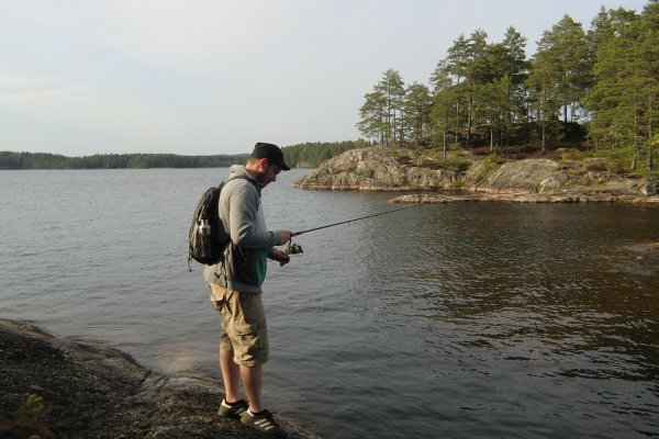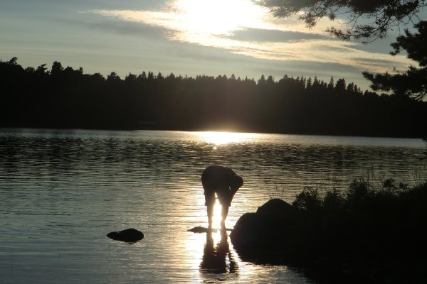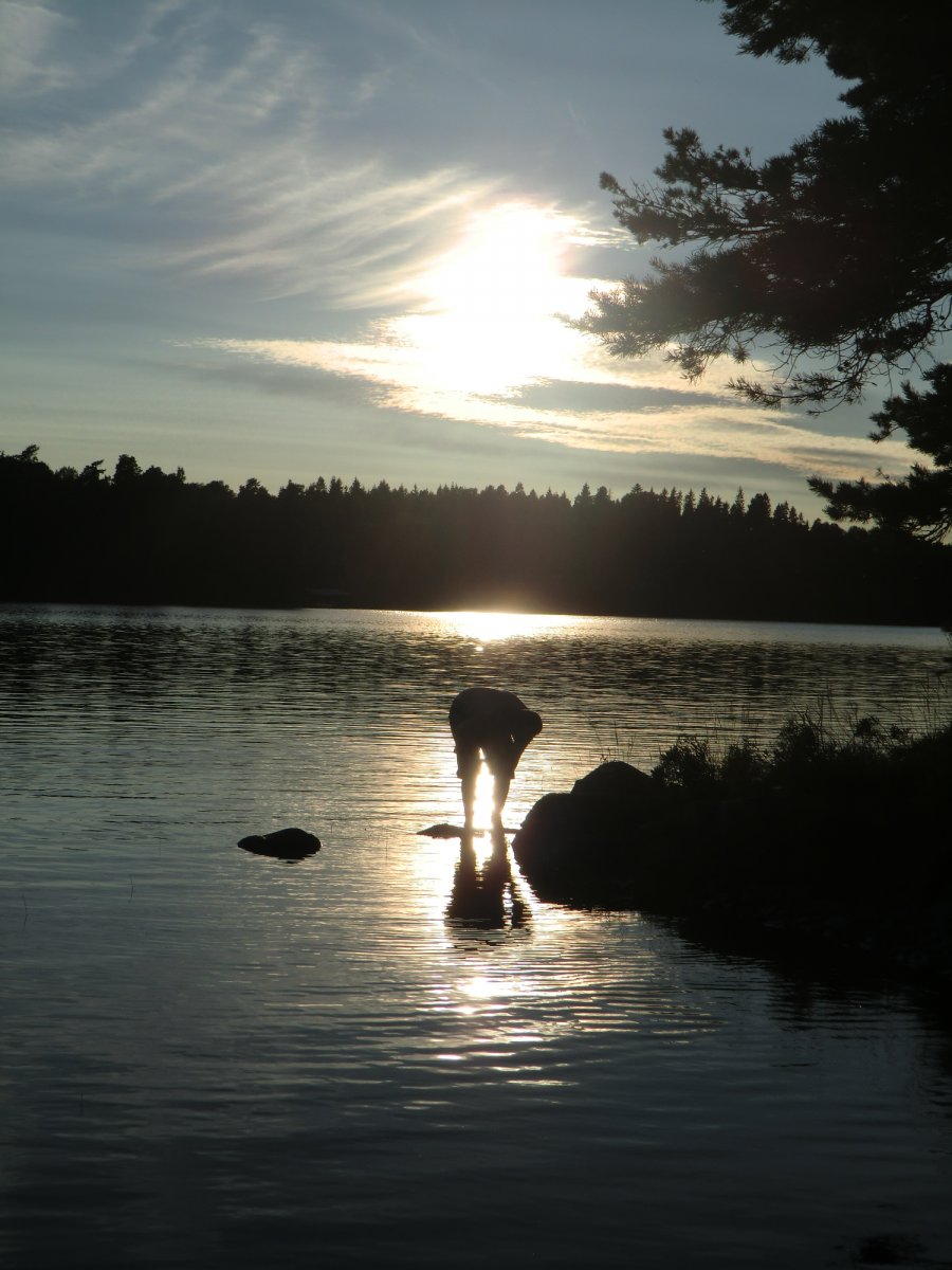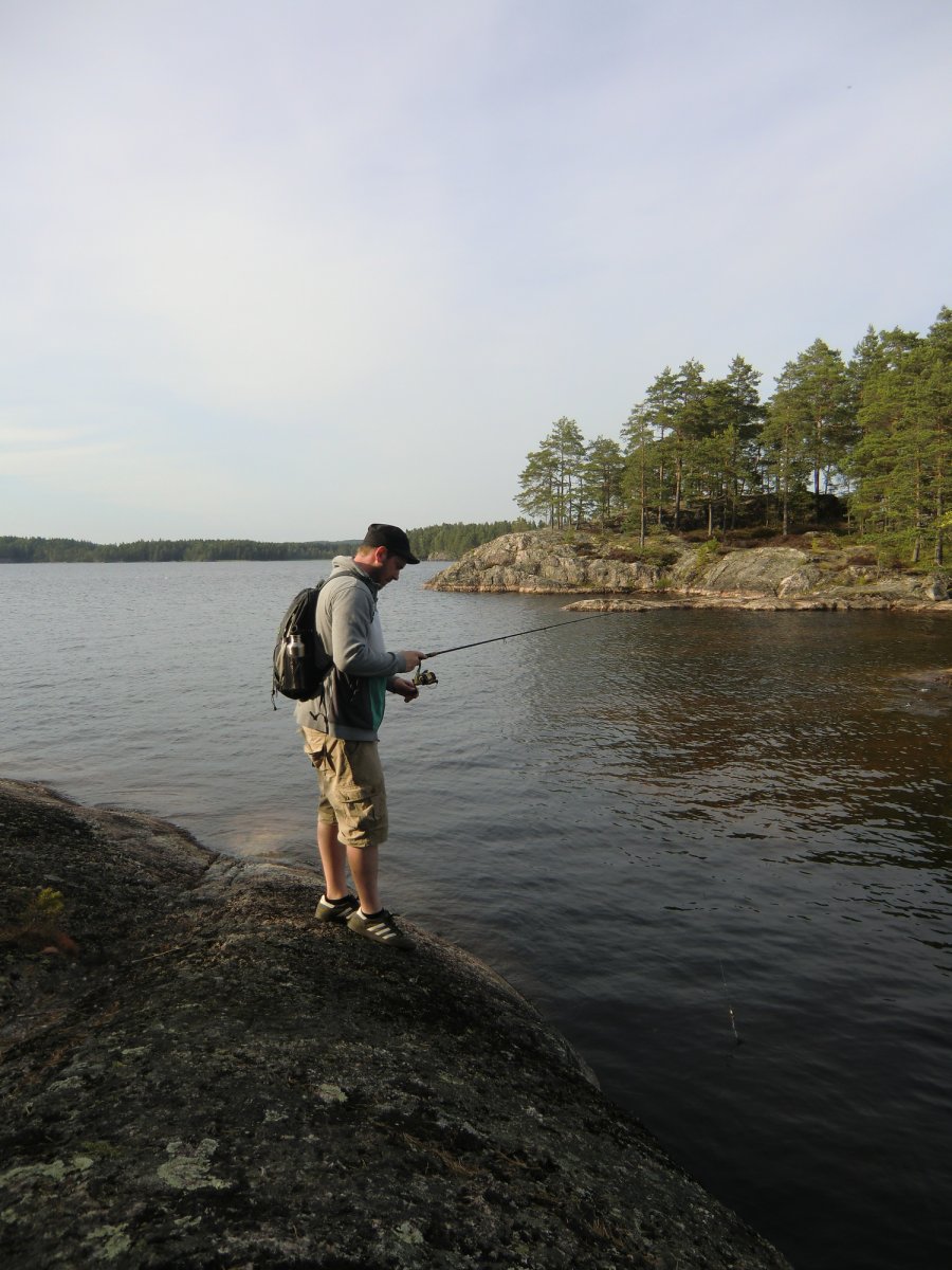 Meine Freundin erkundigt die Insel und sammelt dabei eine große Schale voll Heidelbeeren: die Sammlerin. Ich halte mich am Ufer und gehe mit meiner Spinnrute auf jagt: der Jäger. Zack... ein Biss... direkt vor dem Schilf steigt der erste Hecht ein. Ich freue mich wie ein kleines Kind. Meine Freundin ist alles andere als begeistert als ich den Fisch nach üblicher Methode den gar aus mache und ihn Küchenfertig präpariere. Der Hecht war nicht der größte aber zum satt werden für eine Person genau richtig.