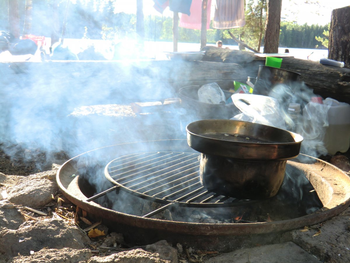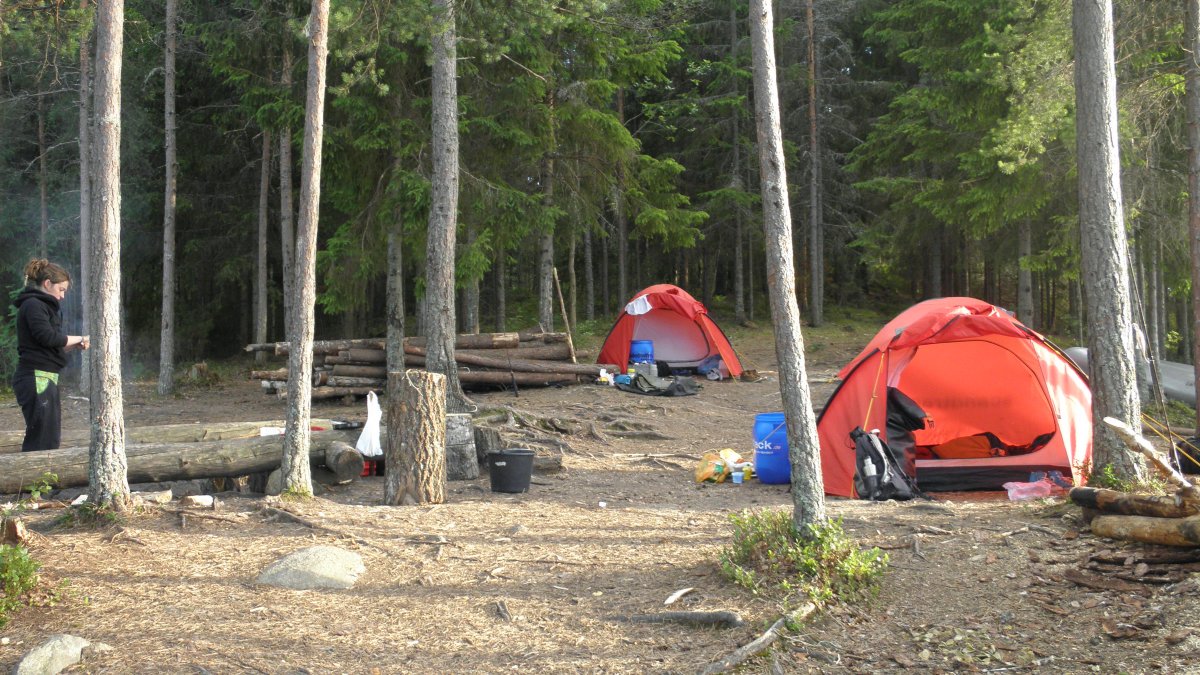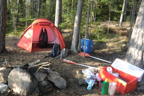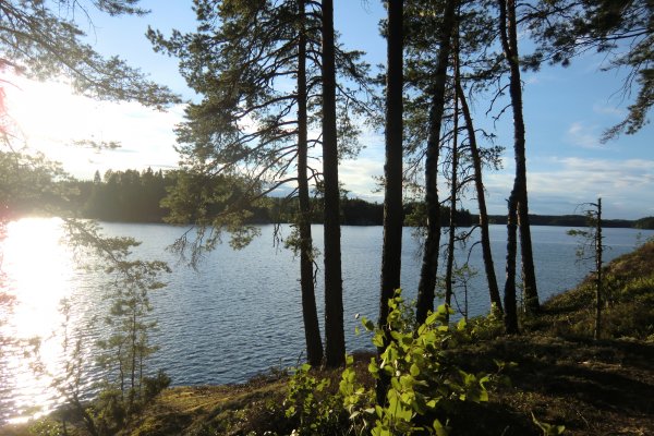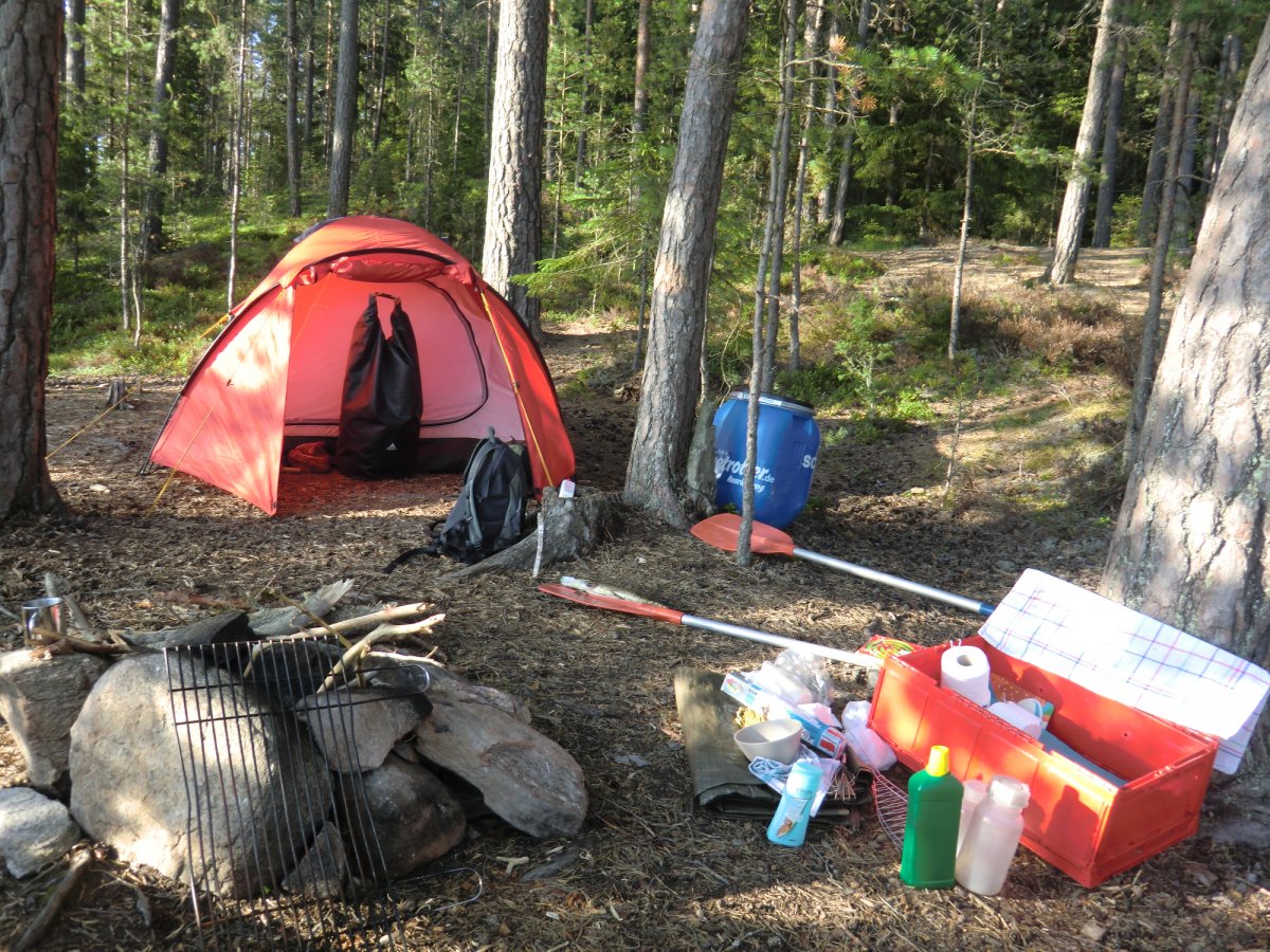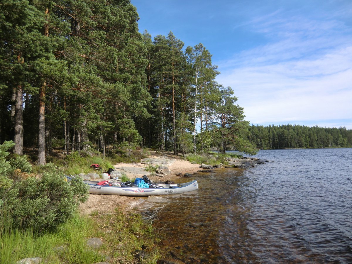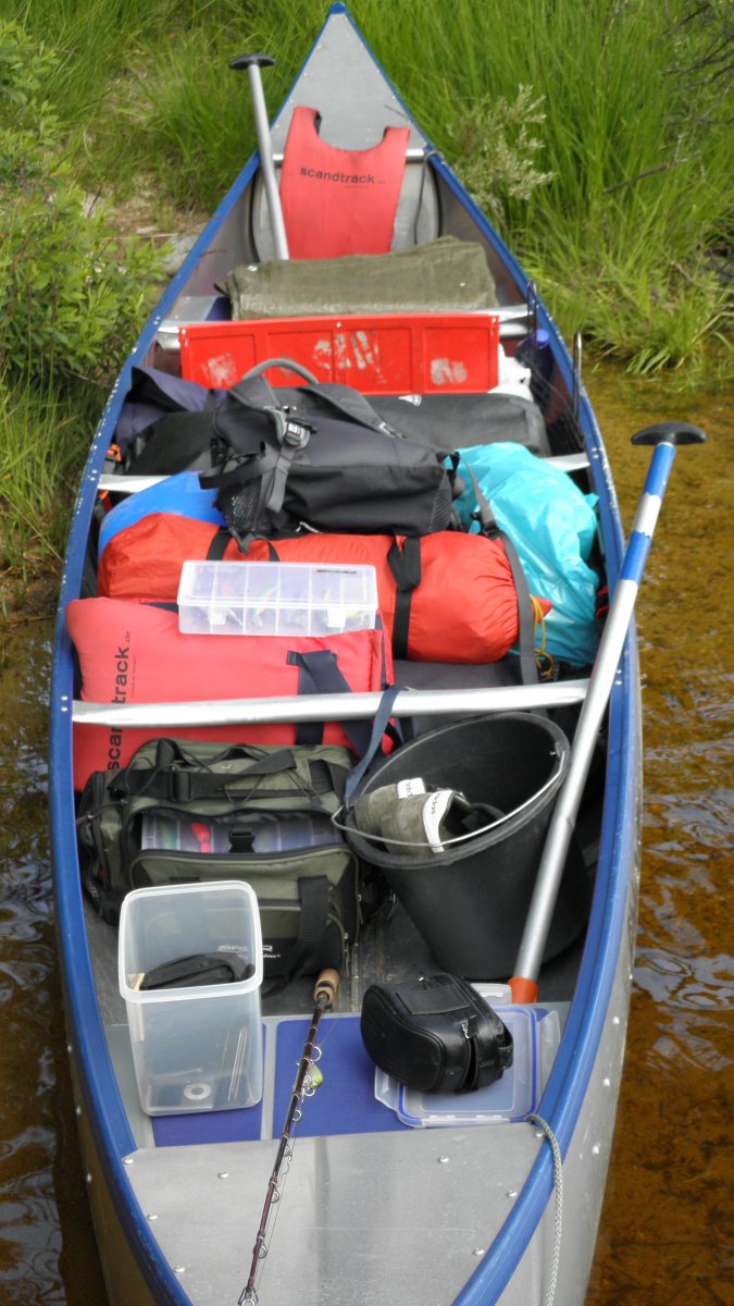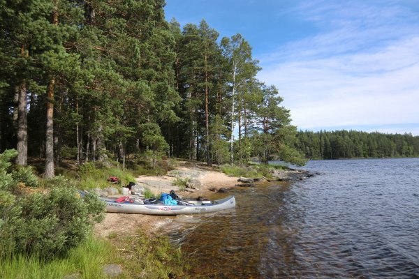 Nach einem 10 minütigen Marsch samt Gepäck sind wir an den Materialausgabestellen angekommen. Hier werden die Lebensmitteltonnen sowie sämtliche Hardware ausgeteilt. Jeder hat die Möglichkeit nach seinem eigenen Tempo das Equipment zu sichten, seine Kleidung zu verstauen......Mit großer Euphorie sind die 200m Fußweg zum Steg schnell gemeistert. Das Kanu Nr. 96 ist unseres. Alles läuft Schlag auf Schlag. Lange Wartezeiten: Fehlanzeige. Nach einer kurzen Kanueinweisung steht unserer Expedition nichts mehr im Weg. Das Wetter ist der absolute Hit. Es braucht etwas Übung sich an der Gewässerkarte zu orientieren. Wir einigen uns darauf vorerst gen Norden zu starten. Unser erster Stop ist direkt gegenüber des Anlegestegs. Hier heißt es direkt erstmal Sun Protection auftragen und, ganz klar, die Rute aufbauen. Hierfür wird selbst in Schweden eine Angellizens benötigt die ganz mühelos im Scandtrack Paket mitgebucht werden kann. Die ersten Eindrücke sind überwältigend. Das Panorama ist unbeschreiblich. Man kann es in Worten nicht wiedergeben wie natürlich und ursprünglich diese Kulisse auf uns wirkt. Der Foxen ist viel größer als es auf der Gewässerkarte scheint. In einer kleinen Bucht machen wir Rast und nehmen uns die Zeit die Lebensmitteltonne auf ihre Bestandteile zu untersuchen. Wir haben im Vorfeld ein Vegetarier Verpflegungspaket bestellt und freuen uns über die Bio-Brotaufstriche. Das Paket scheint überaus reichhaltig zu sein also beschließen wir erstmal unseren Hunger zu stillen. Hmmmmm.....lecker diese Nudeln mit Tomatensoße. Der Kocher ist simpel zu bedienen und funktioniert sogar bei Windstärke 10 einwandfrei.