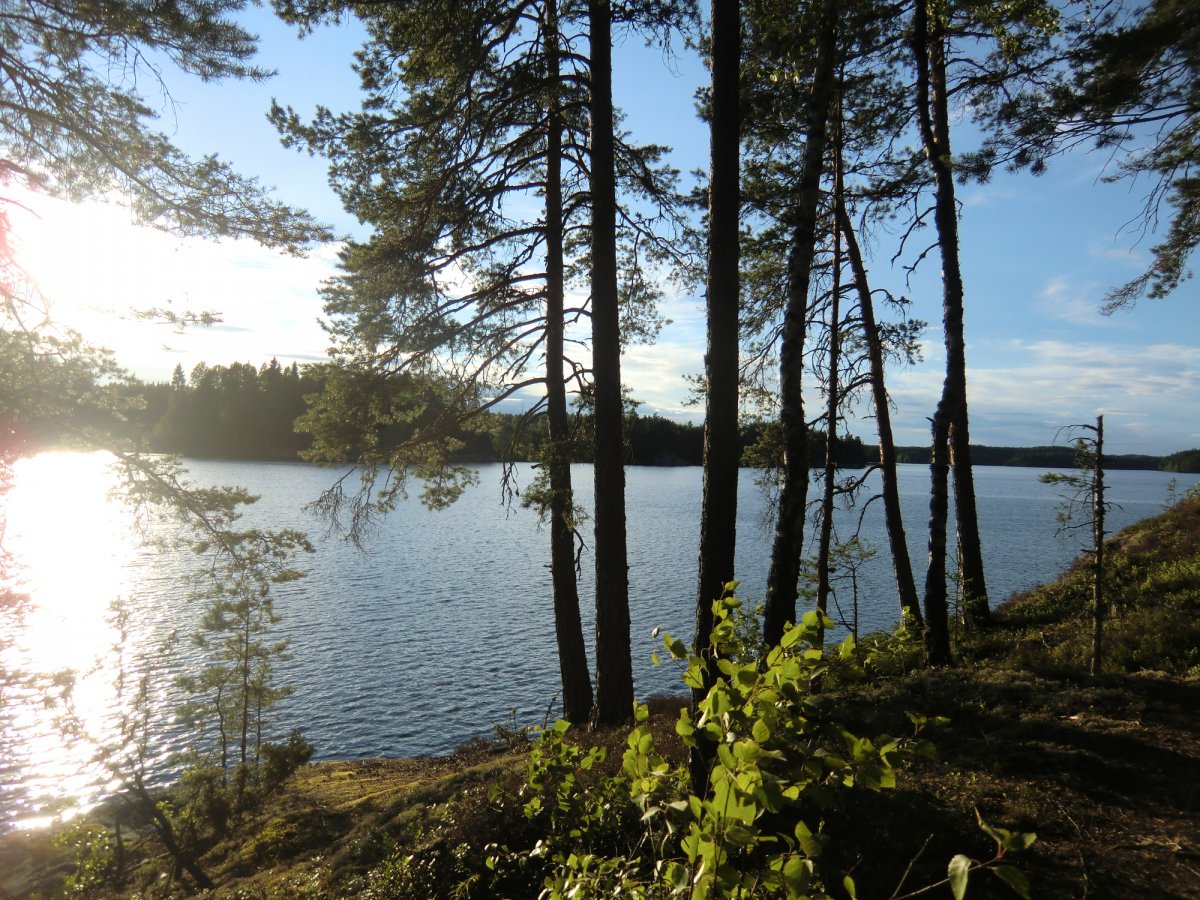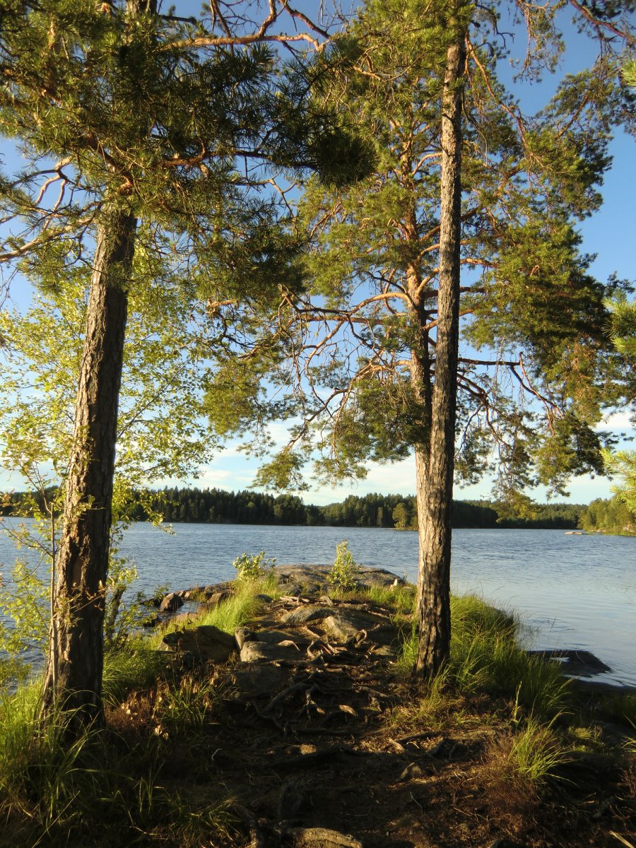 Am nächsten Morgen gibt es als erstes den obligatorischen Kaffee, der sein muss bevor irgendeine andere Aktivität möglich ist. Wir einigen uns darauf keine Hektik aufkommen zu lassen und generell den Fokus auf Erholung zu legen und nicht wie verrückt jeden Tag Strecke machen zu wollen. Unser Ziel ist der Übertrageplatz am Stora Le. Wir lassen uns viel Zeit mit frühstücken und erkunden den Rest der Insel. Überall wachsen kleine Heidelbeersträucher. Die Sonne die durch die Bäume in den Wald scheint ergibt ein einmaliges Schauspiel von Licht und Schatten. Moose und Flechten überall. Sie fühlen sich an als wären sie künstlich hergestellt von einer Firma für 7-Zonen Kaltschaummatratzen. Da...ein großer Haufen kleiner, eierförmiger Köddel. Wir spekulieren von welchem Tier sie kommen. Es musste etwas Großes gewesen sein. auf dem Rückweg zum Camp begegnen wir einer etwa 1 Meter großen Schlange die sich direkt auf den kleinen Pfad entlang schlängelt. Die sieht gefährlich aus mit ihrem grünlichen Kopf und ihrem dunkelgrauen Körper. Wir bleiben in sicherer Entfernung. Genauso habe ich mir dieses Erlebnis gewünscht. Dieses Ursprüngliche, diese Verbundenheit mit der Natur. Ich fühle mich wie "der letzte Trapper".