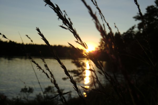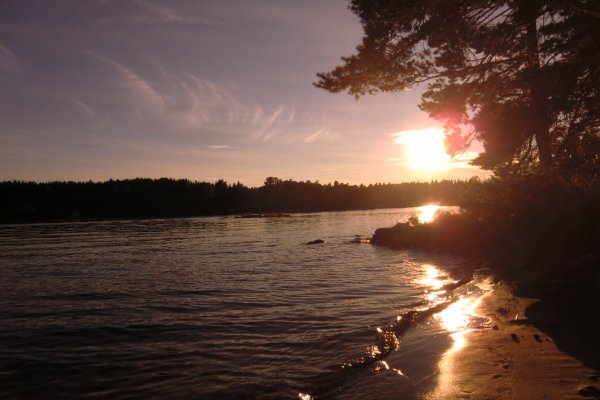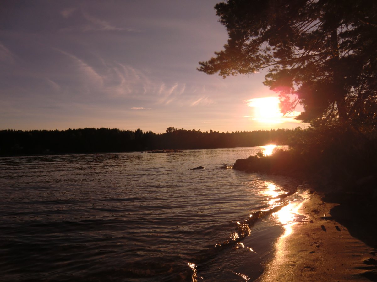 Nach 2-3 Stunden paddeln beschließen wir uns einen Zeltplatz für die Nacht zu suchen. Auf vielen offiziellen Campingplätzen sind schon Zelte aufgeschlagen. Also campen wir wild. Der Platz ist sehr windig, das hat Vor und Nachteile: wenig Mücken, dafür nicht so idyllisch wie eine windgeschützte Bucht. Am Abend leeren wir unsere mitgebrachte Flasche Wein. Die Busfahrt und der erste Tag sitzen uns in den Knochen. Es ist ein angenehmes Gefühl der Erholung, dennoch wird uns bewusst, dass wir das Paddeln und die Muskeln die dafür benötigt werden unterschätzt haben.