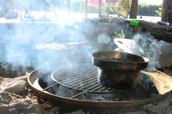 Nach dem anstrengenden gestrigen Tag beschließen wir einstimmig heute wenig Strecke zu machen und uns nochmal hin zu legen. Heute lassen wir es gaaanz, gaaannz ruhig angehen und paddeln langsam Richtung Foxen See zurück. Der erste Rastplatz den wir ansteuern ist bereits belegt. Eine Schweizer Community trocknet gerade die Schuhe über dem Feuer, die durch eine Kenteraktion nass geworden sind (Hahahaha!). Aufgrund ihres Equipments erkenne ich, dass sie gut ausgestattete Angler sind. „Der Profi“ unter ihnen sei noch unterwegs mit Motorboot und Echolot, da er bisher nichts gefangen habe. Im Vergleich zu ihnen habe ich als Einzelperson deutlich besser gefangen als sie. Ich bin stolz!