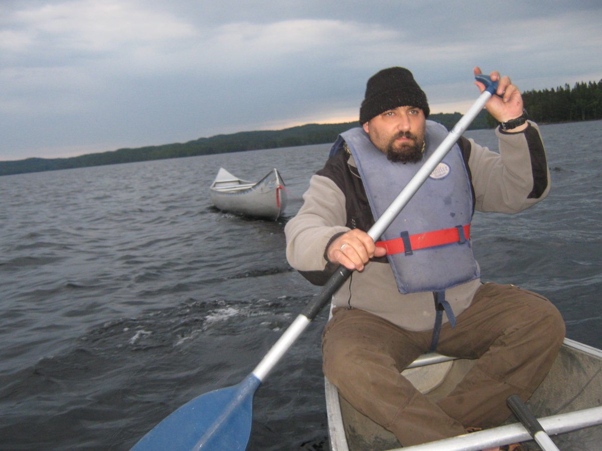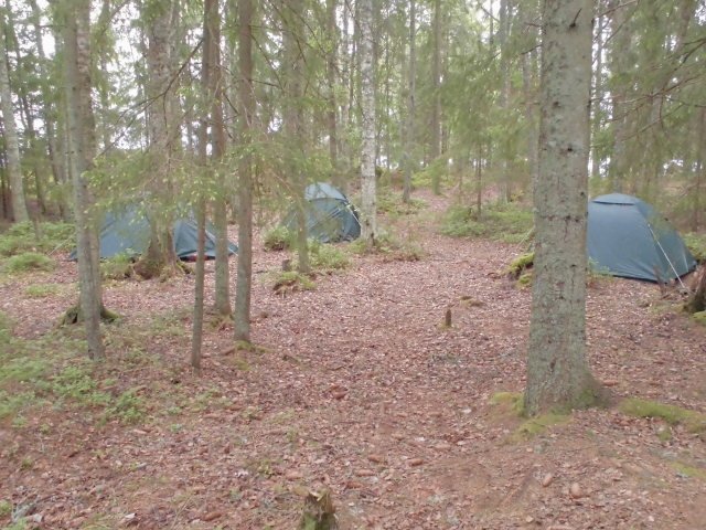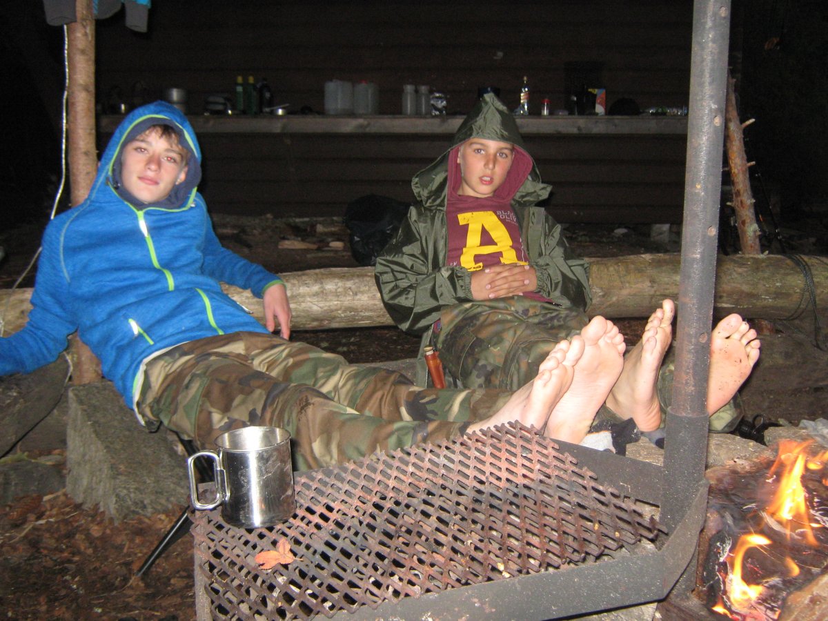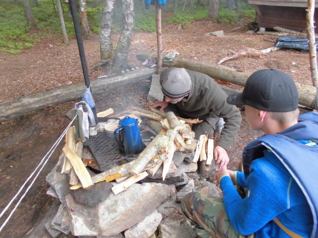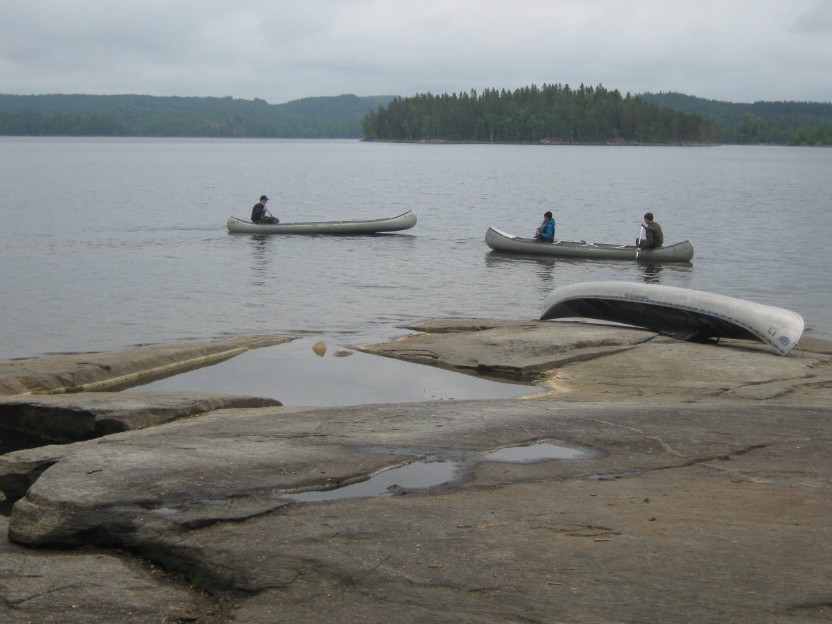Abends kamen dann die Finnenmesser beim schnitzen eines Löffels zum Einsatz, welches den Jungs sehr viel Freude bereitete. Die weiteren Tage verbrachten wir mit Kanu fahren, Fischen, Feuerholz suchen, Faulenzen und einfach mal die Seele baumeln lassen, was Erholung pur war. Ab der Halbzeit hatten wir dann leider 10- 12 Grad Celsius, teilweise Böhen bis 50 Km/h und Regen, wobei uns das nichts ausmachte, es gibt ja kein schlechtes Wetter, sondern nur schlechte Kleidung. Das Kleidungsproblem hatten wir nicht, daher ging der Urlaub ohne Probleme weiter. Mit den bereitgestellten Tarps, bauten wir uns einen Wetterschutz um die Feuerstelle, was das ganze zu einem Couchfeeling mutieren lies. Leider ging dieser Urlaub dann zu Ende und mit viel Wehmut paddelten wir von der Insel zurück an den Campingplatz, wo wir dann die Sanitäranlagen und die warme Dusche ausgiebig und mit vollem Elan bei Rockmusik aus dem Schwedischen Radiosender nutzten. Die Duschen kann man mit 10 schwedischen Kronen füttern und bekommt ca. 5 min. herrliches heißes Wasser.