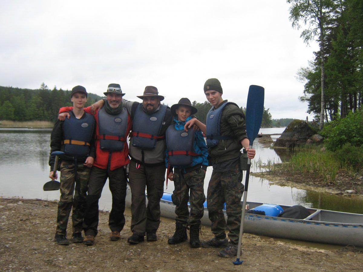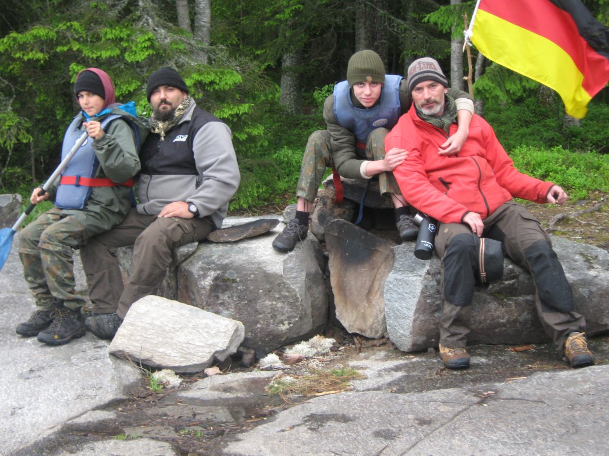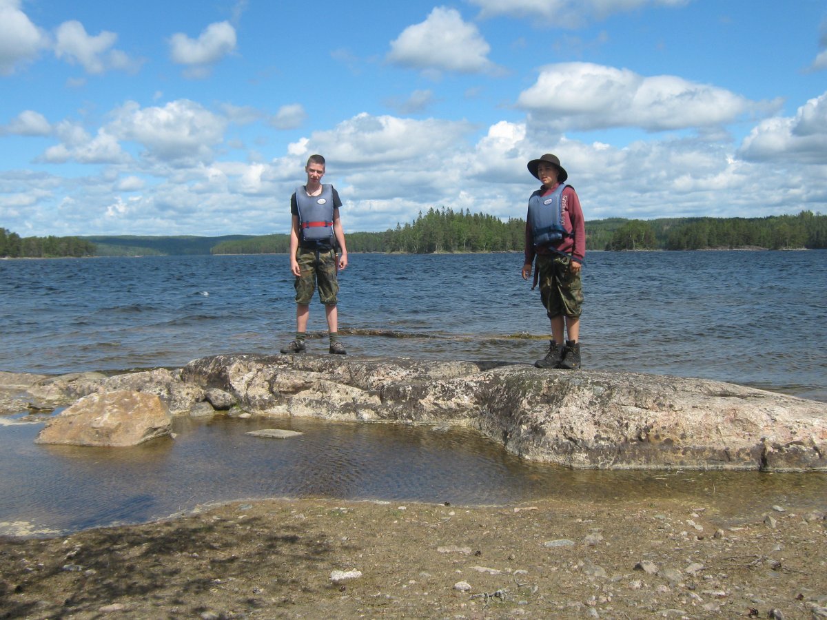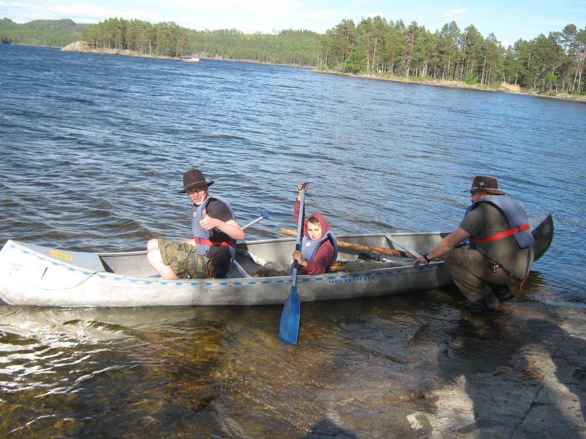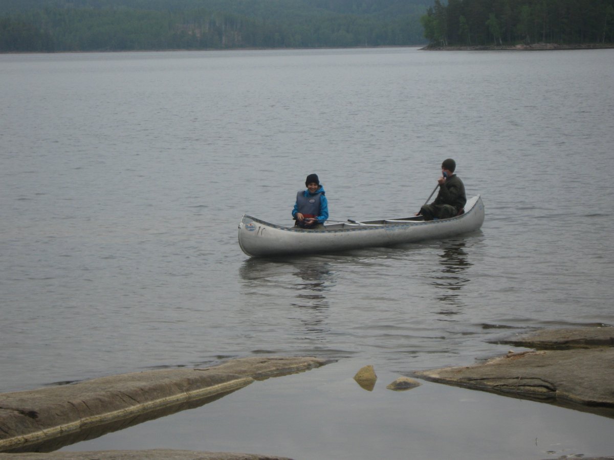 Die Übergabe der Kanus und der Verpflegung und Ausrüstung erfolgte auf dem Campingplatz Grinsby wo alles schon parat zur Verfügung stand. Nach Übernahme der Ausrüstung, Verpflegung und einer kleinen Kanueinweisung ging das Abenteuer endlich los. Unsere Insel war ca. 3-4 Km entfernt. Auf dem Weg zur Insel warfen wir unsere Angeln mit Wobbler raus, wofür wir gleich belohnt wurden. Nach ca. 10 min. hatten wir den ersten Biss mit einem 80 cm Hecht an der Rute. Auf der Insel angekommen luden wir die Kanus aus, verarbeiteten den Fisch und machten erstmal Feuer. Im Anschluß schlugen unsere Zelte im geschützten Wald auf. Da unser Abendessen gesichert war, erkundeten wir die Insel, was der absolute Hammer war. Eine solche Naturschönheit hatten wir bisher selten gesehen. Die ganze Insel ist mit Blaubeerbüschen und Preiselbeerbüschen überzogen, welche aber leider noch nicht reif waren, da wir Anfang Juni dort waren und somit mussten wir auf die leckere von Mutter Natur gespendete Süßspeisse verzichten. Bei der Betrachtung der Lebensmittel, die wir von Scandtrack bekommen hatten, machten wir uns Sorgen, wer das üppige, reichhaltige und gut abgestimmte Verpflegungspacket alles Essen soll.Den Abend verbrachten wir am Lagerfeuer bei lecker gegrilltem Hecht mit Kartoffeln. Da es um diese Jahreszeit nicht richtig Dunkel wird, waren wir etwas überrascht als es 23.30 Uhr war und es noch relativ hell war. Am nächsten Morgen nahmen wir erstmal ein Bad im Stora Bör, welcher sehr erfrischend auf unsere schwäbischen Körper wirkte. Den Tag verbrachten wir mit Kanufahren, Angeln und Kochen und ab und zu faul in unserer mitgebrachten Reisehängematte liegend. Für Naturfreunde ist dieser Trip ein echter Hochgenuss, fernab vom Lärm und Stress, es wird einem nie langweilig, dam man genug zu entdecken hat. Das Kochen über dem offenen Lagerfeuer war für unsere Kinder eine wahre Freude. Wir brachten ihnen das Kochen im traditionellen Bundeswehr Essgeschirr bei, sowie das Fisch räuchern in unserem selber gebauten Räucherofen und das Pizza backen im Steinofen.