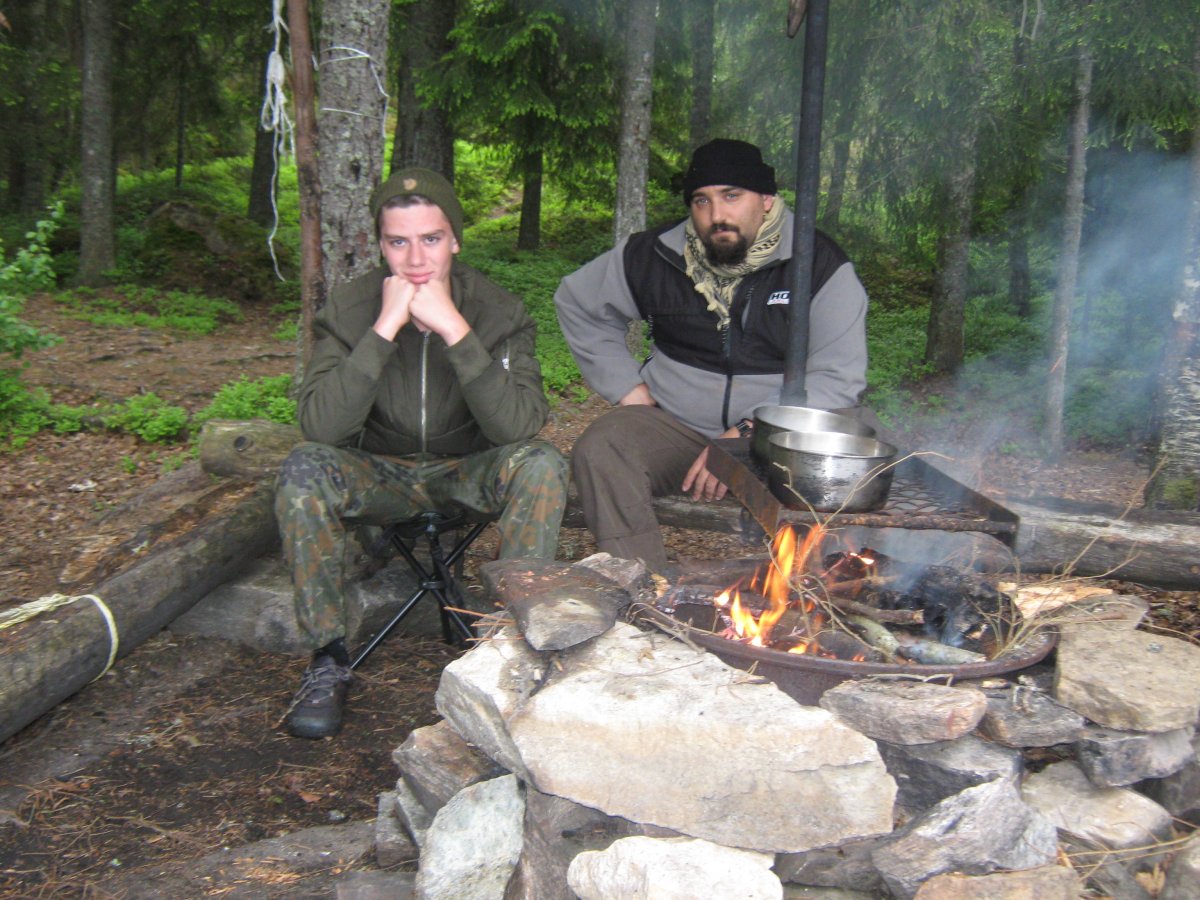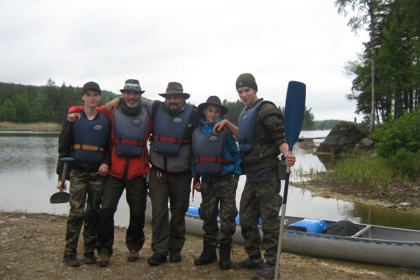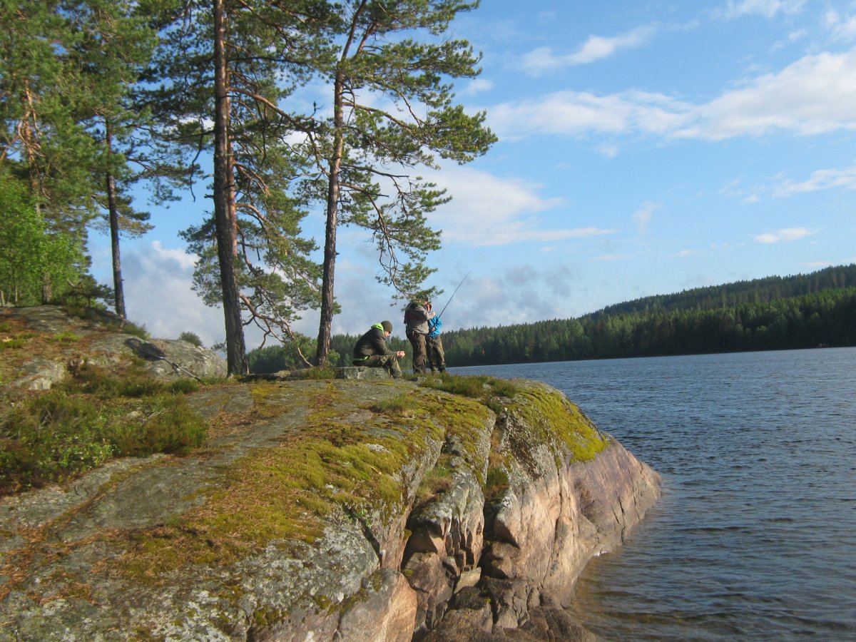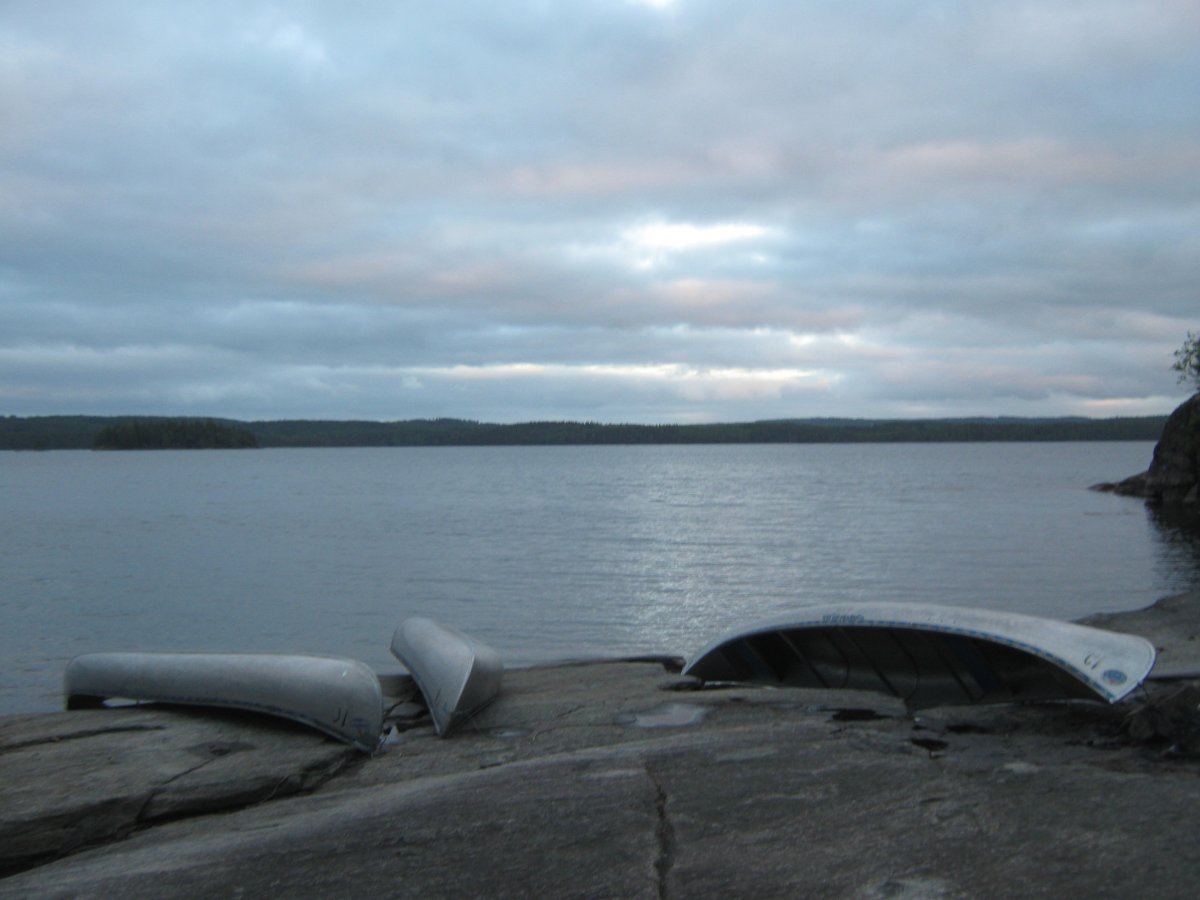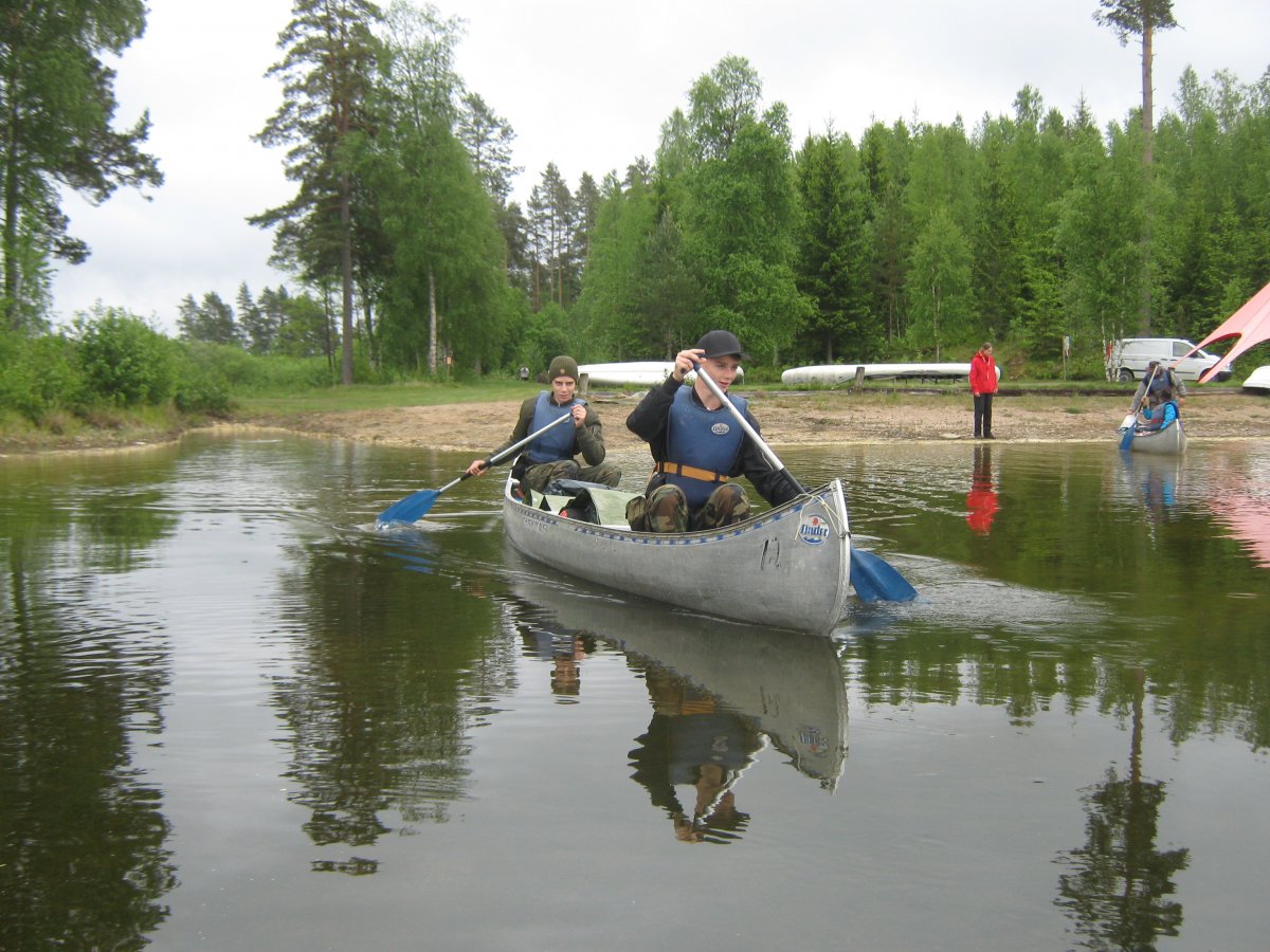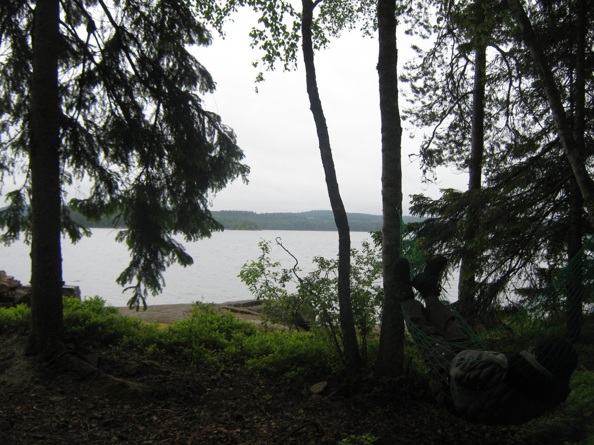 Die Übergabe der Kanus und der Verpflegung und Ausrüstung erfolgte auf dem Campingplatz Grinsby wo alles schon parat zur Verfügung stand. Nach Übernahme der Ausrüstung, Verpflegung und einer kleinen Kanueinweisung ging das Abenteuer endlich los. Unsere Insel war ca. 3-4 Km entfernt. Auf dem Weg zur Insel warfen wir unsere Angeln mit Wobbler raus, wofür wir gleich belohnt wurden. Nach ca. 10 min. hatten wir den ersten Biss mit einem 80 cm Hecht an der Rute. Auf der Insel angekommen luden wir die Kanus aus, verarbeiteten den Fisch und machten erstmal Feuer. Im Anschluß schlugen unsere Zelte im geschützten Wald auf. Da unser Abendessen gesichert war, erkundeten wir die Insel, was der absolute Hammer war. Eine solche Naturschönheit hatten wir bisher selten gesehen. Die ganze Insel ist mit Blaubeerbüschen und Preiselbeerbüschen überzogen, welche aber leider noch nicht reif waren, da wir Anfang Juni dort waren und somit mussten wir auf die leckere von Mutter Natur gespendete Süßspeisse verzichten. Bei der Betrachtung der Lebensmittel, die wir von Scandtrack bekommen hatten, machten wir uns Sorgen, wer das üppige, reichhaltige und gut abgestimmte Verpflegungspacket alles Essen soll.Den Abend verbrachten wir am Lagerfeuer bei lecker gegrilltem Hecht mit Kartoffeln. Da es um diese Jahreszeit nicht richtig Dunkel wird, waren wir etwas überrascht als es 23.30 Uhr war und es noch relativ hell war. Am nächsten Morgen nahmen wir erstmal ein Bad im Stora Bör, welcher sehr erfrischend auf unsere schwäbischen Körper wirkte. Den Tag verbrachten wir mit Kanufahren, Angeln und Kochen und ab und zu faul in unserer mitgebrachten Reisehängematte liegend. Für Naturfreunde ist dieser Trip ein echter Hochgenuss, fernab vom Lärm und Stress, es wird einem nie langweilig, dam man genug zu entdecken hat. Das Kochen über dem offenen Lagerfeuer war für unsere Kinder eine wahre Freude. Wir brachten ihnen das Kochen im traditionellen Bundeswehr Essgeschirr bei, sowie das Fisch räuchern in unserem selber gebauten Räucherofen und das Pizza backen im Steinofen.