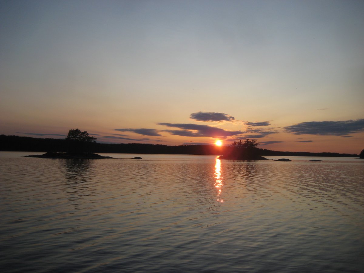 Am ersten Tag starten wir nach dem Ausrüsten hochmotiviert und mit Wind aus Westen. Da wir die Strecke bis zum Stora Le aus den vorangegangenen Jahren bereits kennen, haben wir uns auch ein ordentliches Stück von rund 18km vorgenommen. Südlich des Dano 7 finden wir auf einer Landzunge ein schönes Plätzchen, auf dem wir den ersten Abend verbringen, wie immer das Gepäck und die Essenstonne nochmals gescheit packen und dann auch nach einem schönen Sonnenuntergang die Nacht verbringen.