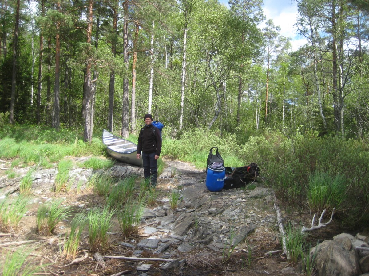 Am Montag legt der Wind nochmals eine kleine Schippe obendrauf. Um die Landzunge von Bokkulen hangeln wir uns von Bucht zu Bucht, um etwas im Windschatten zu bleiben. Doch vor Bormarken sind wir dem Wind voll ausgesetzt. Nun zählt jeder Paddelschlag, um wenigstens einige Zentimeter vorwärtszukommen. Da wir dies aber nicht über die gesamte Bucht durchhalten können, lassen wir uns nach Westen driften und kommen so allmählich in den Windschatten der nächsten Halbinsel. Am Ufer angelangt wärmen wir uns zunächst mit einem Kaffee und überlegen, wie wir um die nächste Landzunge kommen können. Da wir auf einen solchen Ritt auf den Wellen an diesem Tag kein zweites Mal Lust haben, schmieden wir einen gewagten Plan. An der engsten Stelle der Landzunge südlich von Bomarken sind keine Höhenlinie eingezeichnet, von daher kann es dort nicht sonderlich steil sein. Allerdings ist in der Karte auch kein Weg eingezeichnet. Dennoch versuchen wir unser Glück in einer Landportage. Dank eines Forstweges und eines sumpfigen Bereichs mit hohem Gras gelingt es uns das Gepäck und zuletzt auch das leere Boot in die Bucht auf der anderen Seite der Landzunge zu tragen bzw. zu ziehen. Nun können wir unsere Fahrt fortsetzen. Wir fahren die Bucht vor Sten sehr nah am Ufer aus, nutzen den geringeren Wellengang und schaffen es bis auf eine kleine nette Insel vor Laggerud. Trotz aller Eskapaden waren es dann am Abend doch wieder etwas über 20km auf dem Wasser.