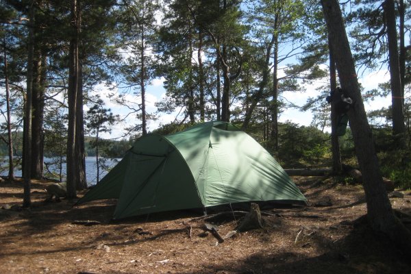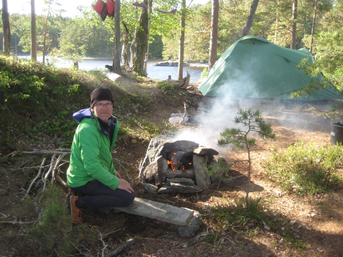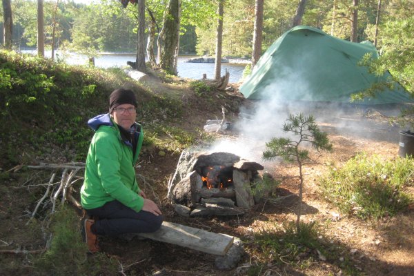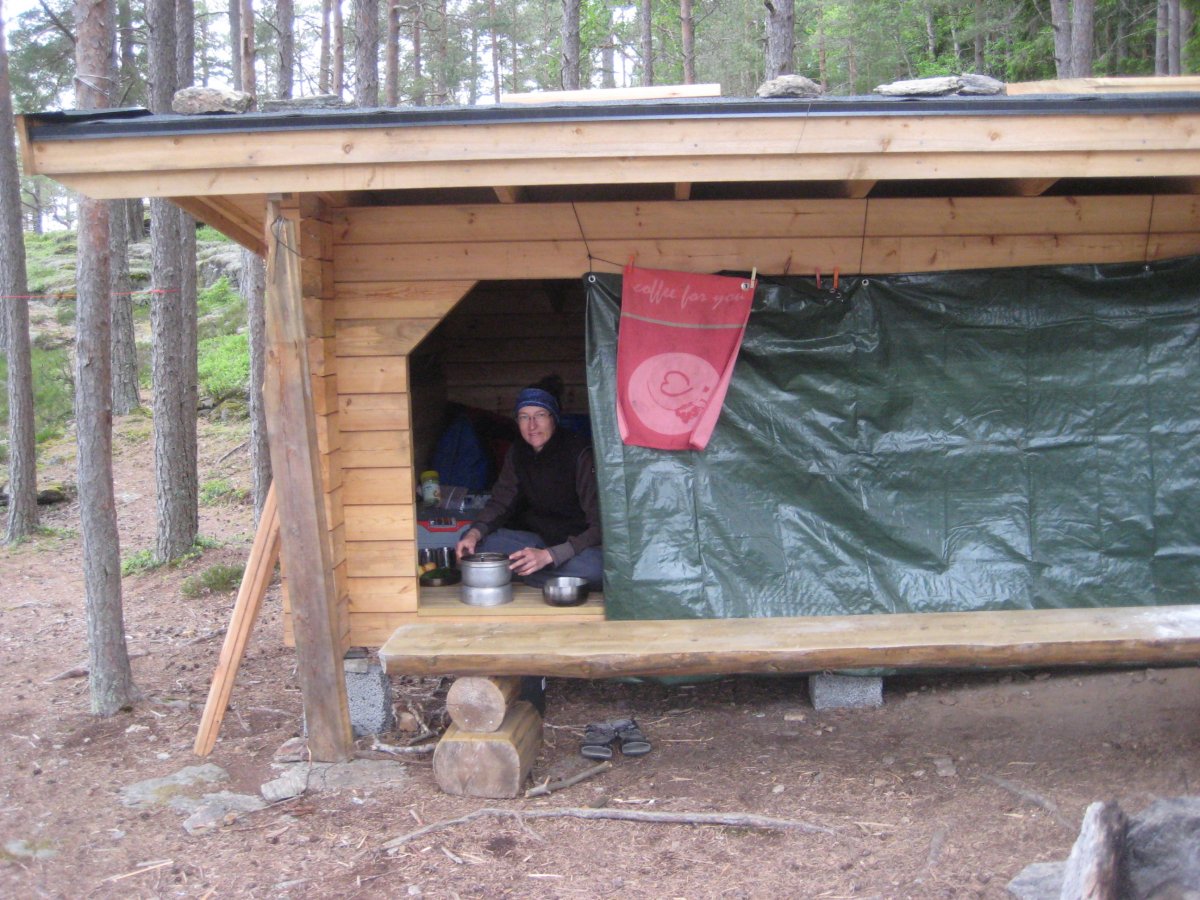 Am Freitag hat der Wind die Richtung geändert. Er kommt nun kräftig aus Nordost und uns damit voll entgegen. Da wir die eineinhalb Kilometer nicht über das offene Wasser fahren wollen fahren wir noch weiter in den Arm des Stora Le hinein, bis wir im Windschatten einer Inselreihe den Arm queren können. Für den Abend und die Nacht sind zahlreiche Schauer und starker Wind angesagt. Daher halten wir nach einem unbesetzten Dano Ausschau. Doch alle Danos, die wir auf der Karte ausmachen können sind bereits oder noch belegt. Da kommt Freund "glücklicher Zufall" um die Ecke. Mit dem Fernglas erblicken wir auf dem Ostufer gegenüber der Insel Trollö einen nigelnagelneuen Dano, der noch nicht einmal in der aktuellen Karte eingezeichnet ist. Es liegen sogar noch Bauhölzer und Säcke mit Beton für die Feuerstelle herum. Sorgsam richten wir uns dort ein und kaum haben wir alles untergestellt kommen auch schon die angekündigten Schauer und der Wind frischt empfindlich auf. Da haben wir nochmals richtig Glück gehabt und verbringen trotz des kräftigen Windes eine recht angenehme Nacht.