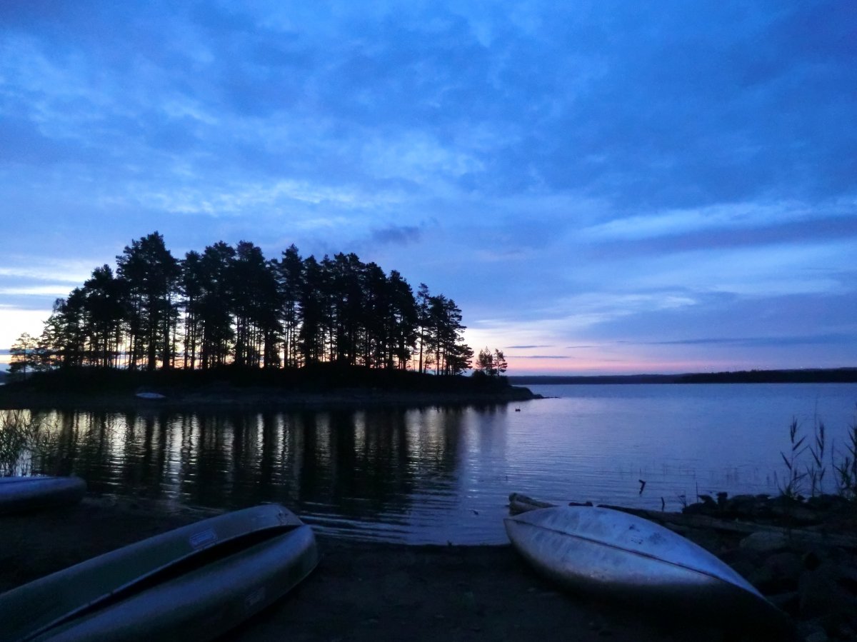 Die Elche durften wir schon bei der Anreise sehen. Während unserer Achterbahnfahrt über die schwedischen Straßen sahen wir sogar acht kleine und große Elche. Da war die lange Fahrt im vollen und diesmal lauten Bus schon fast vergessen. Als wir dann endlich mit den Kanus auf dem Wasser waren, ging der Urlaub so richtig los. Schon am ersten Tag wollten wir weit fahren, um einen gemütlichen, einsamen Rastplatz zu finden und den ersten Tag mit einem Lagerfeuer ausklingen zu lassen.