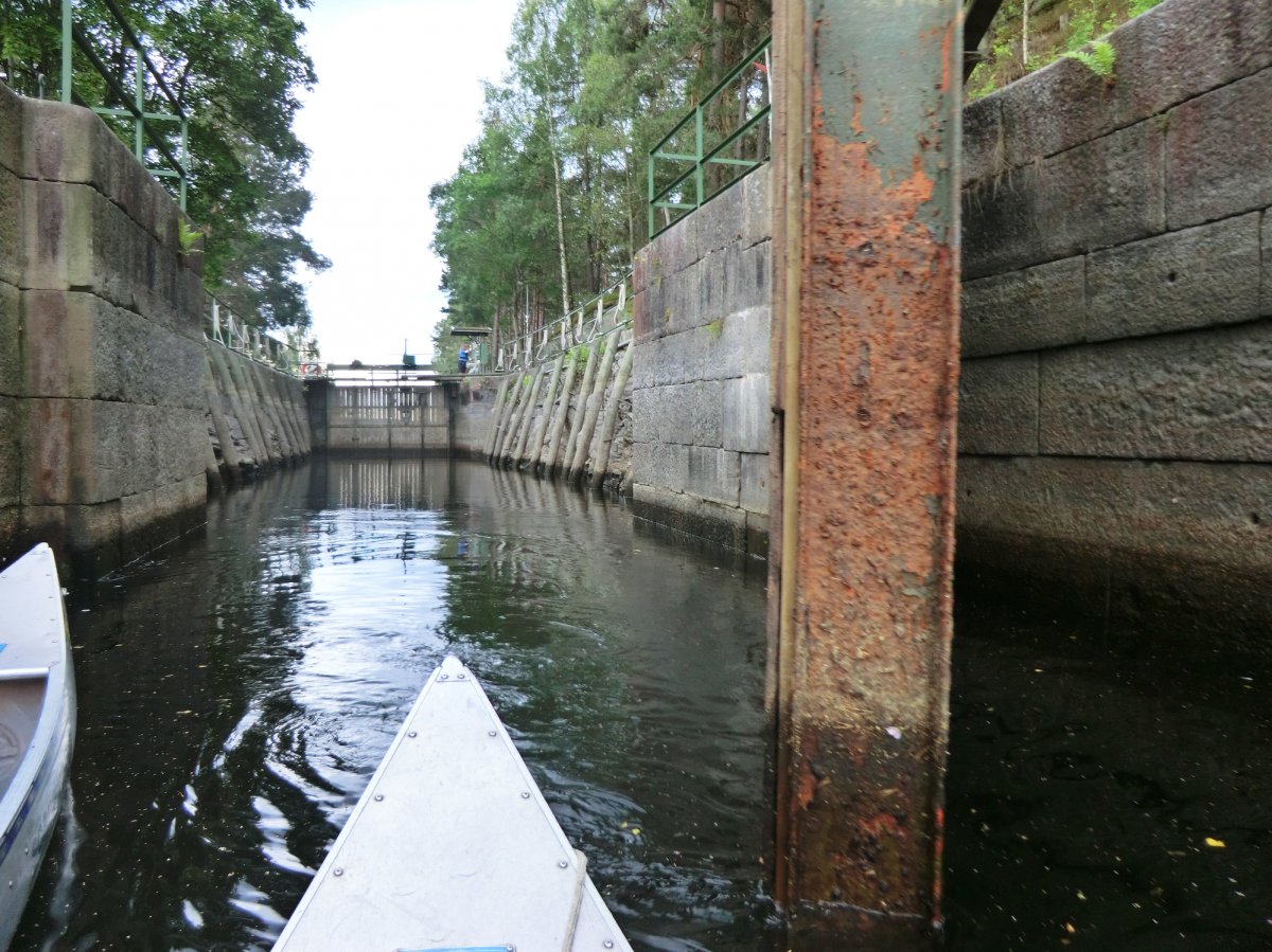 Erst ging es für uns zum Stora Le. Dort sind Landschaft und Rastplätze wunderschön und das Wasser meist sehr ruhig. Wir blieben für eine Nacht an diesem schönen Fleckchen Erde, um am nächsten Tag wieder Richtung Foxen aufzubrechen. Wir hatten schließlich viel vor. Der Insel Bärön mit ihren hohen Felsen und den kleinen Sandstränden mussten wir nämlich auf jeden Fall einen Besuch abstatten. Der Blick über den Foxen und die Sonnenuntergänge sind einfach unvergleichlich schön. Von da aus fuhren wir Richtung Norden, Richtung Töcksfors. Hinter der großen, blauen Brücke sah die Landschaft tatsächlich ganz anders aus. Hier hatten wir wieder das Glück einen Rastplatz für uns zu haben. Der perfekte Tag für den Bau eines Steinofens und Pizza. Am nächsten Tag ging es schon wieder Richtung Süden. Schließlich wollten wir nochmal viel mehr von der Gegend rund um den Foxen sehen. Wir wollten entlang des westlichen Ufers des Foxens bis zur Insel Trollön in Norwegen fahren. Auf dem Weg zu unserer nächsten Übernachtung auf einem Rastplatz in der Nähe vom Autofriedhof in Båstnäs mussten wir eine Pause einlegen, weil die Wellen immer höher wurden, auch das hatten wir noch nicht erlebt. Schnell legten wir am Ufer an und entluden das Kanu. Dort warteten wir 1,5 Stunden. Weil das zweite Kanu unserer Abenteurergruppe noch ein Stück weiter gefahren war, begaben wir uns durchs Unterholz auf die Suche nach ihnen. Minutenlang liefen wir durchs Unterholz, aber die anderen konnten wir nicht finden. Dafür einen riesigen Ameisenhügel. Nach diesem Abenteuer kamen wir zum Glück recht schnell an unserem geplanten Rastplatz an. Am nächsten Tag ging es weiter Richtung Norwegen. Wie im vergangenen Jahr entdeckten wir auf einer kleinen Insel ein Greifvogeljunges. Dann ging es weiter nach Norwegen. Trollön kann man auch super zu Fuß erkunden und in kürzester Zeit von Schweden nach Norwegen und umgekehrt gelangen. Am nächsten Tag machten wir einen Zwischenstopp im Basiscamp. Unsere grünen Kanus waren leider schon von Anfang an nicht ganz dicht und es bildete sich nach kürzester Zeit auf dem Wasser eine Pfütze im Kanu. Dort bekamen wir sofort zwei neue Alukanus, mit denen wir noch schneller durchs Wasser gleiten konnten. Dann konnte es endlich wieder weiter Richtung Süden gehen. Wir wollten noch Orte erkunden, in denen wir in den letzten Jahren nicht waren. Das bedeutete Umtragen oder durch die Schleuse fahren. Keine schwere Entscheidung. Voller Vorfreude fuhren wir den Kanal zur Schleuse entlang. Schon in der dritten Schleusenkammer eröffnet sich ein toller Ausblick auf den See Lelång. Nach 1,5 Stunden hatten wir die Schleuse in Lennartsfors passiert und befanden uns auf dem See direkt vor einer ziemlich dunklen Regenwolke. Uns blieb keine Wahl, da mussten wir durch. Aber das Fahren durch einen frischen Sommerregen hat auch irgendwie Spaß gemacht. Leider regnete es auch den Rest des Tages, sodass wir nochmal unsere Unterstandbaukünste, die wir auf unserer ersten Reise entwickelten, einsetzen durften. Am nächsten Tag wurden wir vom Sonnenschein geweckt und wagten uns noch ein paar Kilometer weiter Richtung Süden. Die beste Entscheidung überhaupt. Endlich hatten wir nochmal eine Feuerstelle und konnten den letzten Abend in der Wildnis am Lagerfeuer, mit Stockbrot und in der Hängematte verbringen. Und auch am Abreisetag ließ uns das Wetter nicht im Stich. Beil tollstem Wetter traten wir den Rückweg zum Basiscamp an. Wieder ging es durch die Schleuse in Lennartsfors und da war unser Abenteuer Wildnis auch schon fast vorbei.