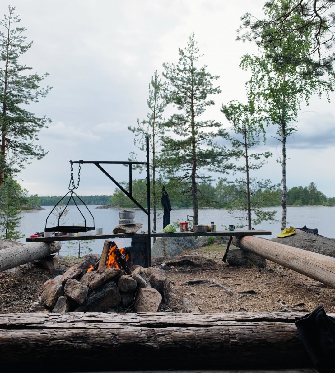 Hier gab es erstmal eine ausgiebige Außendusche mit wunderschöner Aussicht auf den ruhiges See und ein knisterndes Feuer.