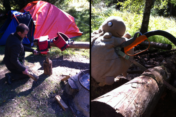 wir hatten eh überlegt hier zwei Nächte zu bleiben. Auf dem Kocher machten wir uns ein paar Nudel und Würstchen zum Abendessen. Nachdem wir die Zelte aufgeschlagen haben, waren wir so müde und ich entschloss ein kurzes Nickerchen zu machen. Die halbe Stunde Schlaf hat gut getan und der Lärm des Rasenmähers von der Anliegenden Insel wurde dank Ohrstöpsel verdrängt. Nachdem ich aufgestanden war weckte ich Marc und machte mich daran ein paar Baumstämme zu sägen und zu spalten um für den Abend ein Lagerfeuer zu machen. Der Hunger war jedoch immer noch nicht vollkommen besiegt und wir entschieden uns noch was zu Essen zu machen. Marc hatte den perfekten Plan. Stockbrot. Er bereitete den Teig aus Mehl und Backpulver so wie Wasser vor, während ich in mühseliger Arbeit den Speck in kleine Würfel verarbeitet. Marc war bereits fertig als ich gerade mal die Hälfte des Specks zubereitet hatte. Also hat er sich ums Feuer gekümmert. Glorreich überreichte ich Marc die Speck-Würfel und ließ mich neben dem Feuer nieder. Da Marc noch mit dem Teig beschäftigt war, hatte ich Zeit um eine Zigarette zu rauchen. Mit Stöcken rösteten wir den Teig über dem Feuer. Nach einigen Fehlversuchen hatten wir auch dann den Trick raus und nahmen nicht mehr soviel Teig auf den Stock. Als Nachtisch gab es Marshmallows. Ich zog mich nach dem Essen in mein Zelt zurück um noch einige Zeilen in mein Reisebuch einzutragen.