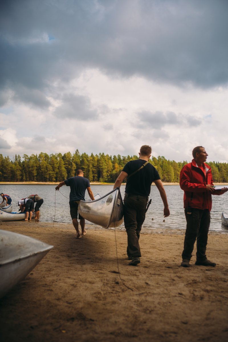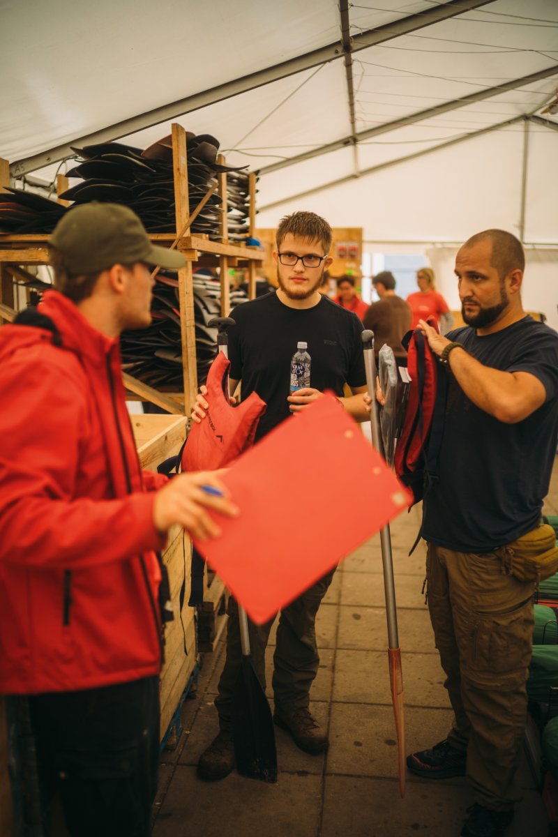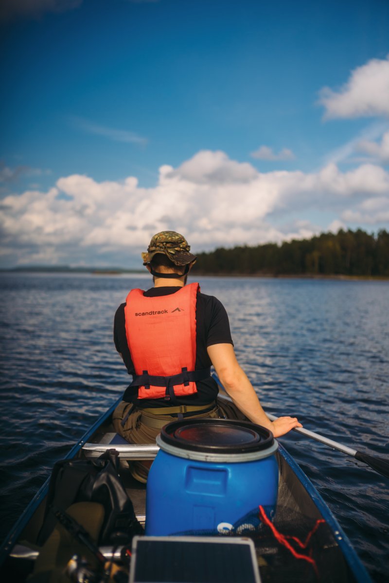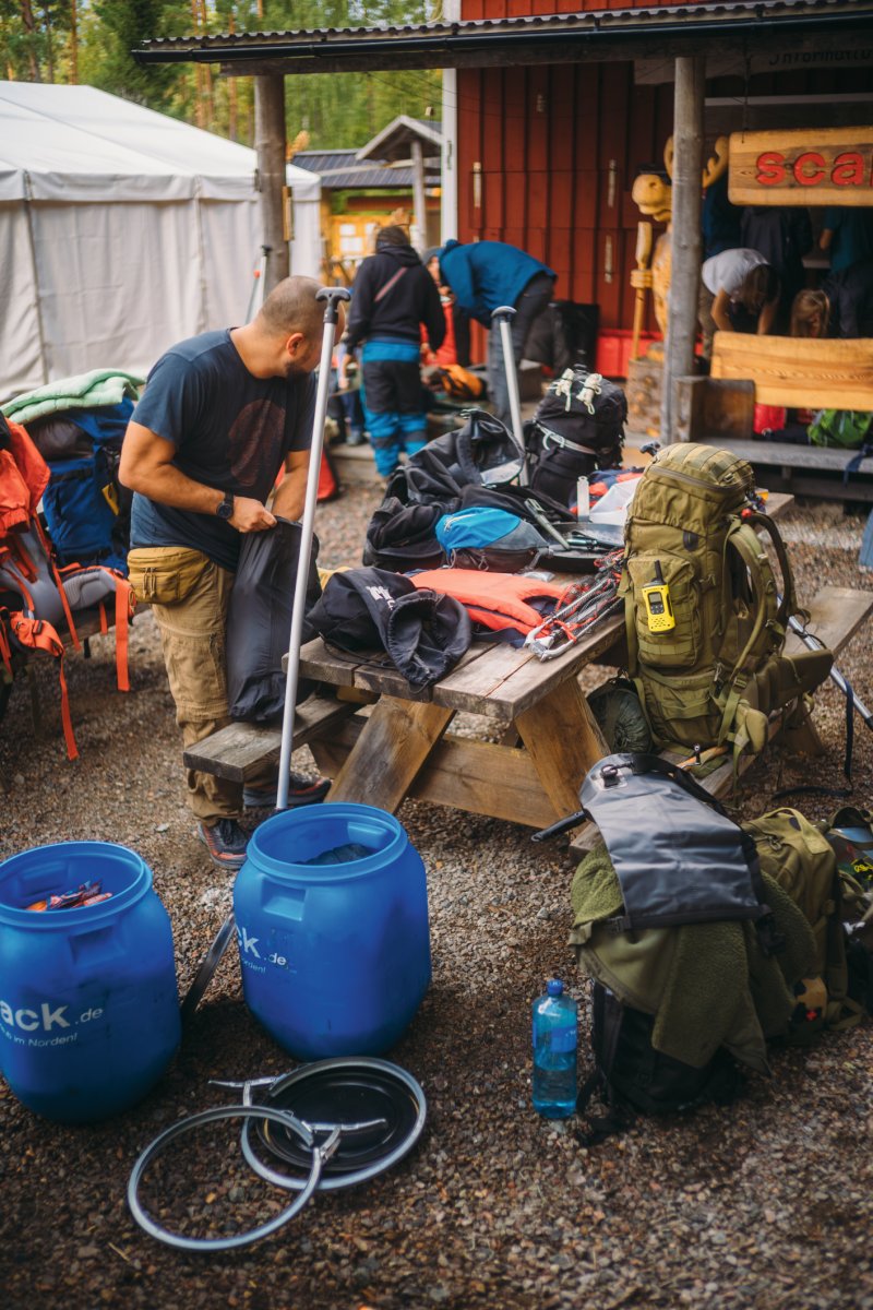 Wir erhielten unser gebuchtes "Light"-Paket, welches im Wesentlichen aus zwei Kanus und zwei geräumigen, wasserdichten Containern bestand. Einer davon war leer und wartete auf unser Gepäck, der andere war bereits mit nützlichen Utensilien wie einem Spaten, Müllsäcken und Klopapier gefüllt. Anschließend begann das große Umpacken. Unsere Wechselkleidung für die Rückreise und alles, was definitiv nicht nass werden durfte und nicht unmittelbar gebraucht wurde, wanderte in den ersten Container. Der zweite wurde zu unserer mobilen Speisekammer, gefüllt mit Proviant wie Trockenmilch- und Volleipulver, Mehl, Spaghetti mit Tomatensauce, diversen Tütengerichten, Speck, Beef Jerky, Energieriegeln, Knäckebrot, Marmelade, Ghee, Gänsefett, Kaffee und verschiedenen Tütensuppen. Parallel dazu bereiteten wir unsere beiden Angeln vor, für die wir zusätzlich Angelkarten gebucht hatten. Die Stahlvorfächer wurden montiert und die Köderboxen griffbereit verstaut – wir waren bereit.
