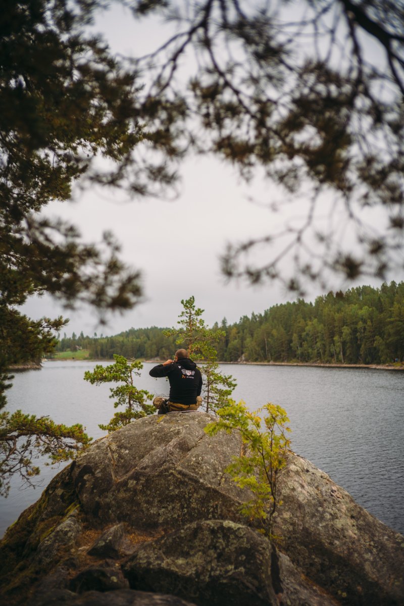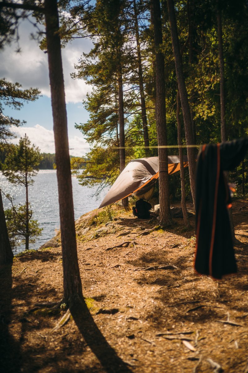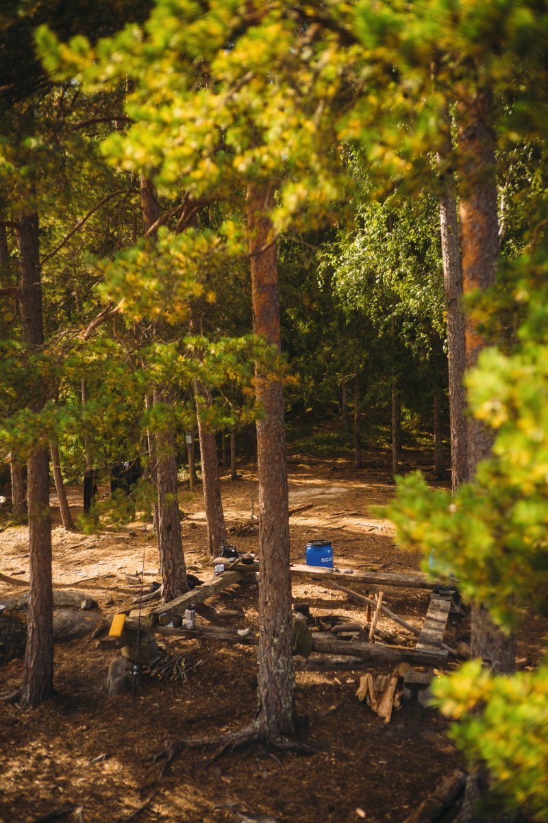 Einen kurzen Moment später fanden seine Schuhe jedoch unter Wasser Halt, und er konnte sich langsam aus eigener Kraft aus der Misere ziehen. Er schaute mich völlig entsetzt an, als wäre nun die gesamte Reise mit ihm wortwörtlich ins Wasser gefallen, und ich fing vor lauter Erleichterung an, lauthals zu lachen. Das steckte auch Thore an, und wir lachten gemeinsam über die absurde Situation, als wir uns beide dabei erwischten, wie uns abermals Mattins Worte in den Sinn kamen: "Einfach mal was Schönes machen". Als die Sorgen dann endgültig abgeschüttelt waren, zog Thore seine komplett durchnässte Regenkleidung aus und hing sie zum Abtropfen in das verlassene Camp, welches sich uns dort wie eine unverhoffte Fügung offenbarte. Am Ende des großen Felsvorsprungs befand sich nämlich ein kleines Waldstück mit einer fürstlichen Feuerstelle und gerade so viel Platz, um unsere drei Tarps und Hängematten aufzuhängen. "Die Natur hat entschieden: Wir bleiben heute hier", sagte ich. "Wir müssen nur noch Michael davon überzeugen." Ich fuhr mit der Beschaffung des Mittagessens – dem Fischen – fort, während Thore schnurstracks, routiniert, aber noch etwas nachdenklich über das, was eben passiert war, sein Lager aufbaute.
