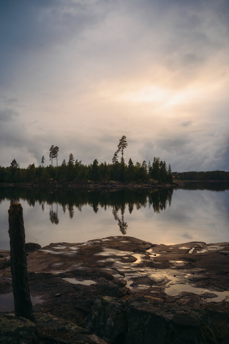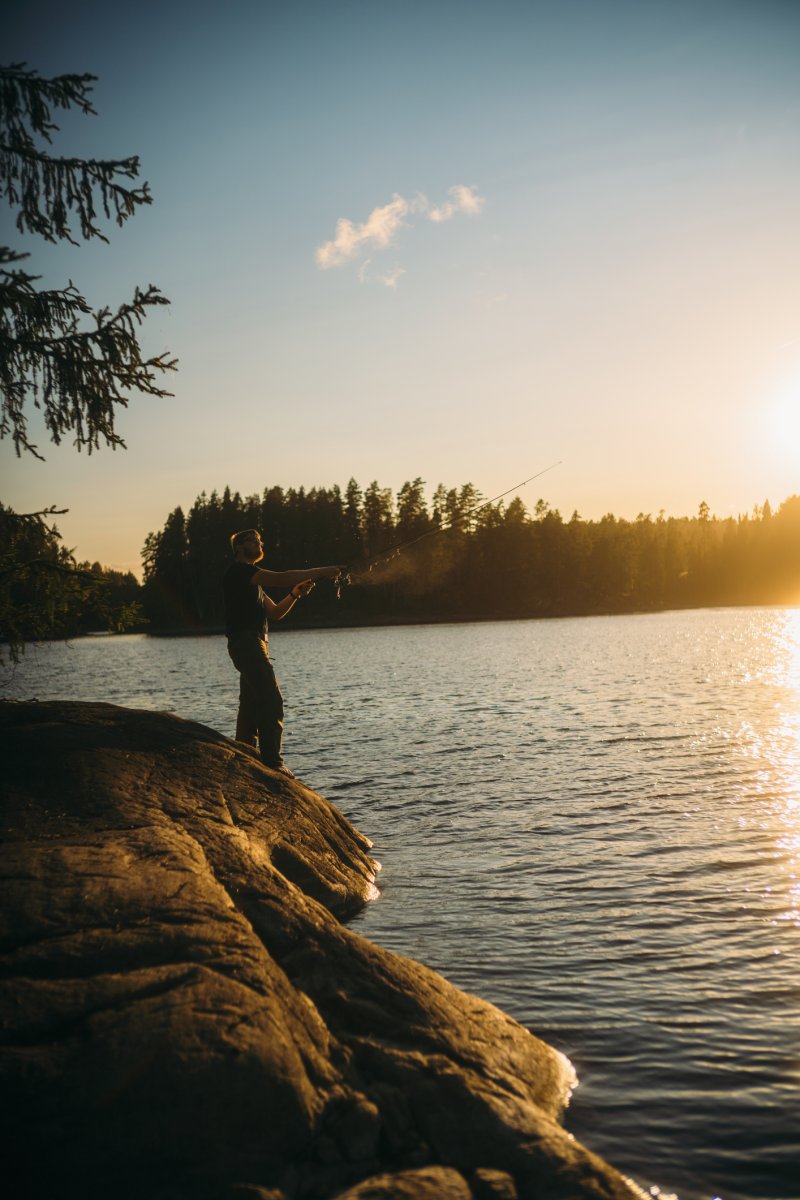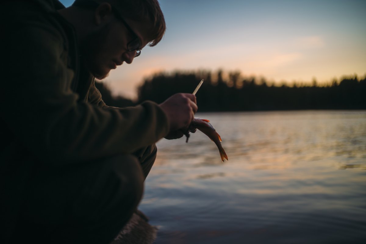 Michael filetierte den letzten Fisch unserer Reise auf den Felsen vor einer Kulisse, die nur schwer in Worte zu fassen ist. Die Regenwolken des Tages brachen zum Sonnenuntergang hin auf, und einzelne Sonnenstrahlen durchstießen sie wie riesige Laser, die einige Wald- und Wasserflächen in gleißendes Licht tauchten. Der Kontrast des grauen Himmels und der Abendröte sah aus, als würde in der Ferne eine große Stadt lichterloh brennen. Währenddessen hatte Michael drei Rotlicht-Taschenlampen und seine Kopflampe um das Schneidebrett drapiert und eine perfekte, fast chirurgische Ausleuchtung für den Hecht geschaffen. Das Filetieren war für ihn zu einem routinierten Handwerk geworden. Mir blieb nichts anderes übrig, als meine Kamera zu zücken und so viele Fotos von der Szenerie zu machen, wie ich konnte.