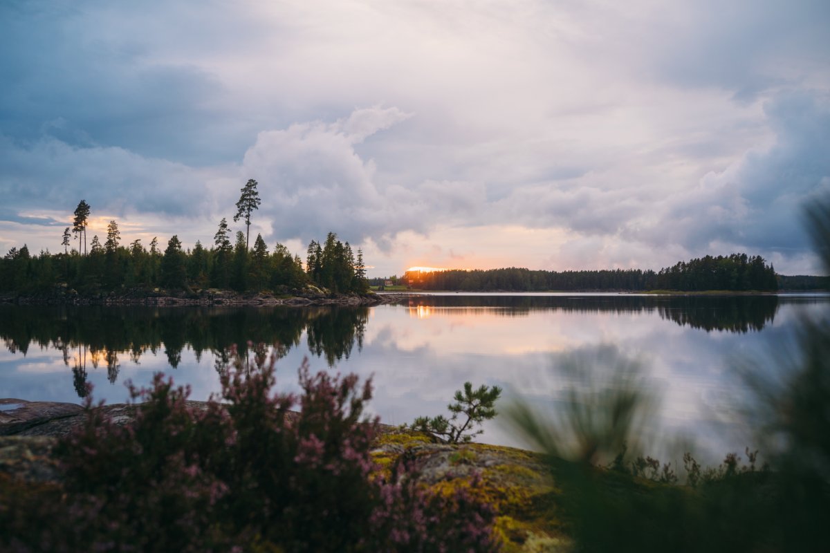 Kurz bevor die Sonne unterging – das war in etwa um 19:30 Uhr (denn um 20:15 Uhr sollte sie hinter dem Horizont verschwinden) – wurden wir in unserem Angelvorhaben etwas ernsthafter, auch weil der Magen sich langsam wieder mahnend und ächzend zu Wort meldete. Wir wussten, dass die Fische jetzt besser beißen. Wir fokussierten also verdächtige Buchten mit Schilf und Seerosen, warfen unsere Gummifischköder wieder und wieder aus, bis es plötzlich den ersten Schlag in der Rute gab. Eilig kurbelte ich an der Rolle, die unter dem Widerstand immer wieder mit ihrer Bremse nachgab. Es war ein kurzes Hin und Her, und wir sicherten den ersten Hecht des Abends mit knapp 55 cm per Kescher. Ich verlor keine Zeit, warf denselben Köder direkt wieder aus und – boom – direkt der nächste Biss. Das konnte doch nicht sein. Stellen die Fische ihre Uhr so sorgfältig wie die Deutschen ihre für den Tatort? Ich zog den zweiten Hecht mit etwas kleineren Maßen heraus, löste den Haken und ließ den Köder wie gewohnt neben mir ins Wasser fallen. Plötzlich zog es an meiner Rute, während ich noch dabei war, den Hecht rasch durch einen Herzstich von seinen Leiden zu erlösen. Fast wäre sie ins Wasser gefallen, und ich konnte sie gerade noch packen. Es hing tatsächlich ein weiterer Hecht am Köder, der anscheinend derart hungrig war, dass er selbst auf ein lebloses Fischimitat direkt neben einem geschäftig rumpelnden Kanu biss. Leider schüttelte er sich im selben Moment, als ich die Rute ergriff, mit einem majestätischen Sprung aus dem Wasser und löste so den Haken. Das war verrückt. Wir konnten es kaum glauben. Nach dieser für mich sehr intensiven Sequenz zog Thore noch einen Barsch heraus, bevor die Sonne sich hinter dem Horizont verneigte und das ganze Spektakel so abrupt endete, wie es begonnen hatte. Nichts biss mehr. Nichts bewegte sich mehr im Wasser. Eine halbe Stunde Zeitfenster, in dem die Fische wie angestochen auf alles reagierten, was sich bewegt – oder, wie sich zeigte, auch nicht bewegt.
