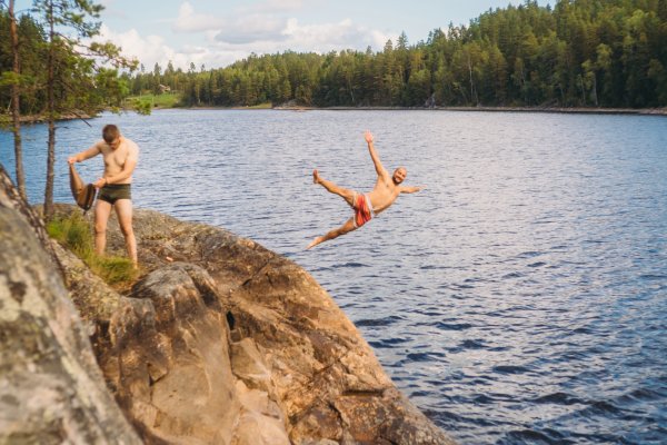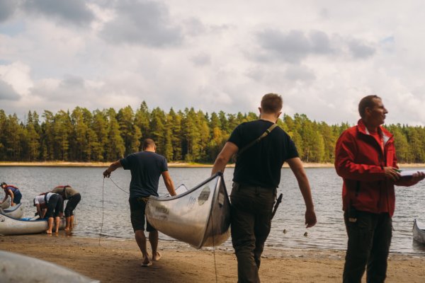 Noch bevor er sich in seine trockenen Ersatzklamotten werfen konnte, kam Michael zurückgepaddelt. Ich fragte ihn über den See rufend, ob er sich vorstellen könne, warum Thore bei dem Wetter nur in Unterhose herumlaufe. Wie aus der Pistole geschossen erwiderte er: "Das kann nur zwei Gründe haben: Entweder kommt er gleich nackt und schreiend auf mich zu und bewirft mich mit brennenden Tannenzapfen, oder aber er ist ins Wasser gefallen." Es ist wohl nötig, diesen Insider für die Lesenden zu erklären. Als ich am Vortag mit Michael zusammen auf dem Kanu unterwegs war, um unser Mittag- und Abendessen zu angeln, kam uns eine große Gruppe von Kanus entgegen. Es waren bestimmt acht bis zehn Personen. Michael nahm geistesgegenwärtig sein Handy in die Hand und begann zu tippen, stoppte aber sofort wieder gedankenversunken. "Wie schreibe ich ihm das möglichst lustig?", fragte er mich. "Er soll sich wie ein Urmensch an die Felsen stellen und sie verjagen", sagte ich. "Genau, ich schreibe ihm: 'Zieh dich nackt aus und mach die brennenden Tannenzapfen bereit, es kommt eine große Truppe an Kanus auf dich zu'." Wir lachten einige Minuten. Natürlich meinten wir das nicht ernst. Aber einen guten Witz lässt man nicht einfach so ungenutzt liegen.