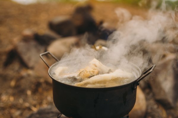 Thore, der andere mit Angelkarte, schloss sich mir an, während Michael indes die bereits vorhandene Feuerstelle aufbereitete, die augenscheinlich schon von vielen anderen Gruppen genutzt, aber aufgrund der vielen lose aufeinander gestapelten Steine individuell umgebaut werden konnte. Nach knapp zwei Stunden erfolglosen Abklapperns von Schilf- und Seerosengebieten mit dem Kanu und dem ständigen Wechsel der Köder von Gummifisch auf Blinker/Spinner und zurück machte ich meinen ersten Fang dieser Reise: einen stolzen, ca. 60 cm großen Hecht (messen konnten wir ihn nicht, da wir kein Maßband dabei hatten). Thore holte ihn mit dem Kescher ein und erlöste ihn unmittelbar und waidgerecht von seinem Kampf. Dieser Moment war für mich in zweierlei Hinsicht bedeutend: Zum einen hatte ich die Erkenntnis "Ja, hier kann man Fische fangen und die Woche überstehen", zum anderen war es der erste Fisch, den ich seit 25 Jahren geangelt habe (ich bin 39). "Okay, es klappt noch, es ist tatsächlich Muscle Memory. Vertraue darauf." Thore zog noch einen mittelgroßen Barsch heraus, und wir fuhren mit anbrechender Dunkelheit zurück in unser Lager, wo wir bereits mit dem ersten Feuer in Empfang genommen wurden. Wir nahmen die beiden Fische aus, entschuppten und filetierten sie, und aus ihren Resten kochten wir eine köstliche Fischsuppe. Alle drei wurden satt und wir gingen, so wie von nun an jeden Abend, um kurz nach Mitternacht ins Bett.