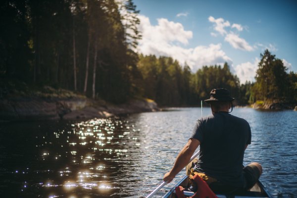 Nach zwanzig Minuten auf dem Wasser öffnete der Himmel endgültig seine Schleusen und wir zogen uns unsere Regen-Outfits über. Der Plan war, dass Thore und ich eine vielversprechende Bucht zum Angeln ansteuern, während Michael noch einmal zurück zu unserem ersten Camp paddeln wollte, um ein paar Fischhalter zu retten, die er selbst geschnitzt und dort vergessen hatte.