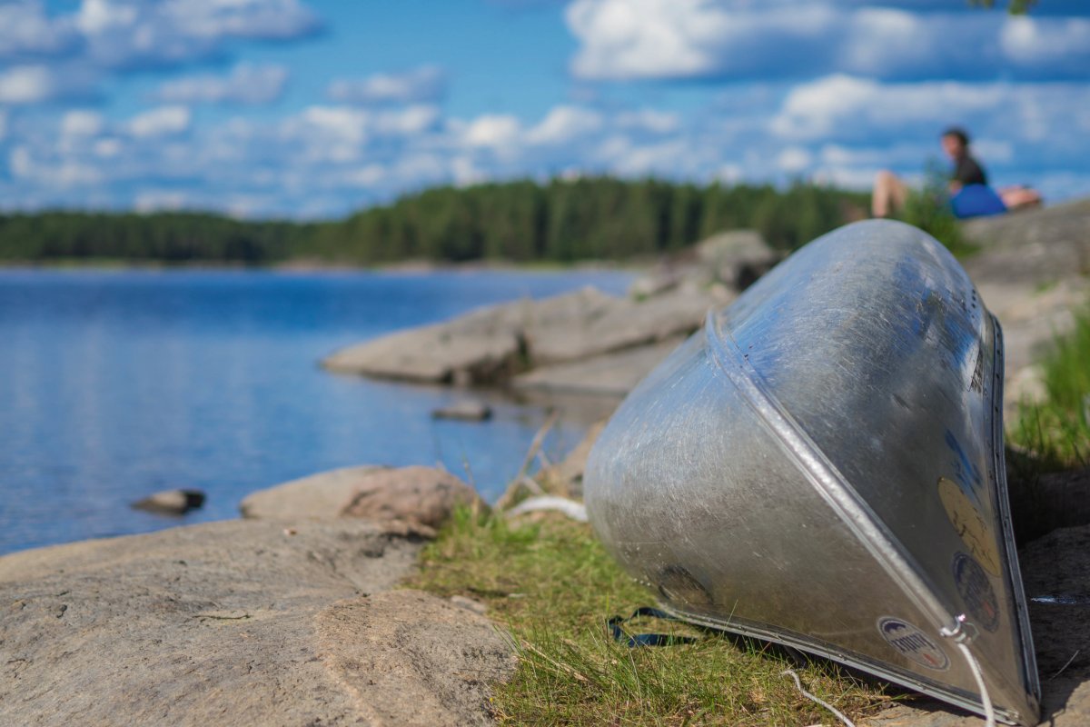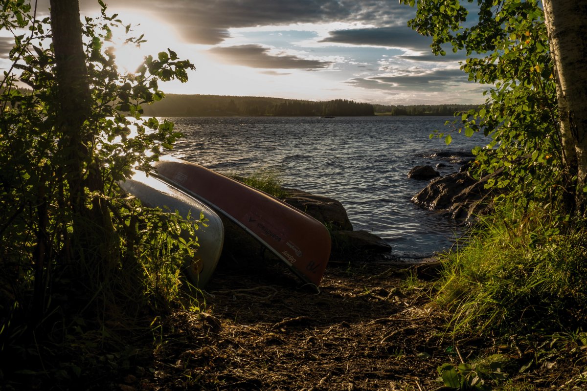 Mit fünf Bussen kommen wir in Schweden an. Dank perfekter Organisation und sicherlich einer gewissen Routine, ist ein Chaos ausgeblieben. Nach einem von Scantrack bereitgestellten Snack, Kaffee und Eistee, konnte die Zusammenstellung der Ausrüstung beginnen. Paddel und Weste wurden je nach Person vergeben. Verpflegungstonnen, Werkzeug, Kochgeschirr und Zelten standen für unsere Gruppe bereits parat. Nach einem kurzen Gegencheck auf die Vollständigkeit des Equipments, machten wir uns voll beladen auf dem Weg zu unserem Fortbewegungsmittel für die kommende Woche. Eine kurze Einführung zu Ruderschlägen und dem Verhalten beim Kentern, gaben uns die nötige Sicherheit und das Knowhow und in See zu stechen. Zwei Zweier- und ein Dreier-Kanu, oder auch die Pärchen- und das Junggesellenboot genannt, wurden beladen.