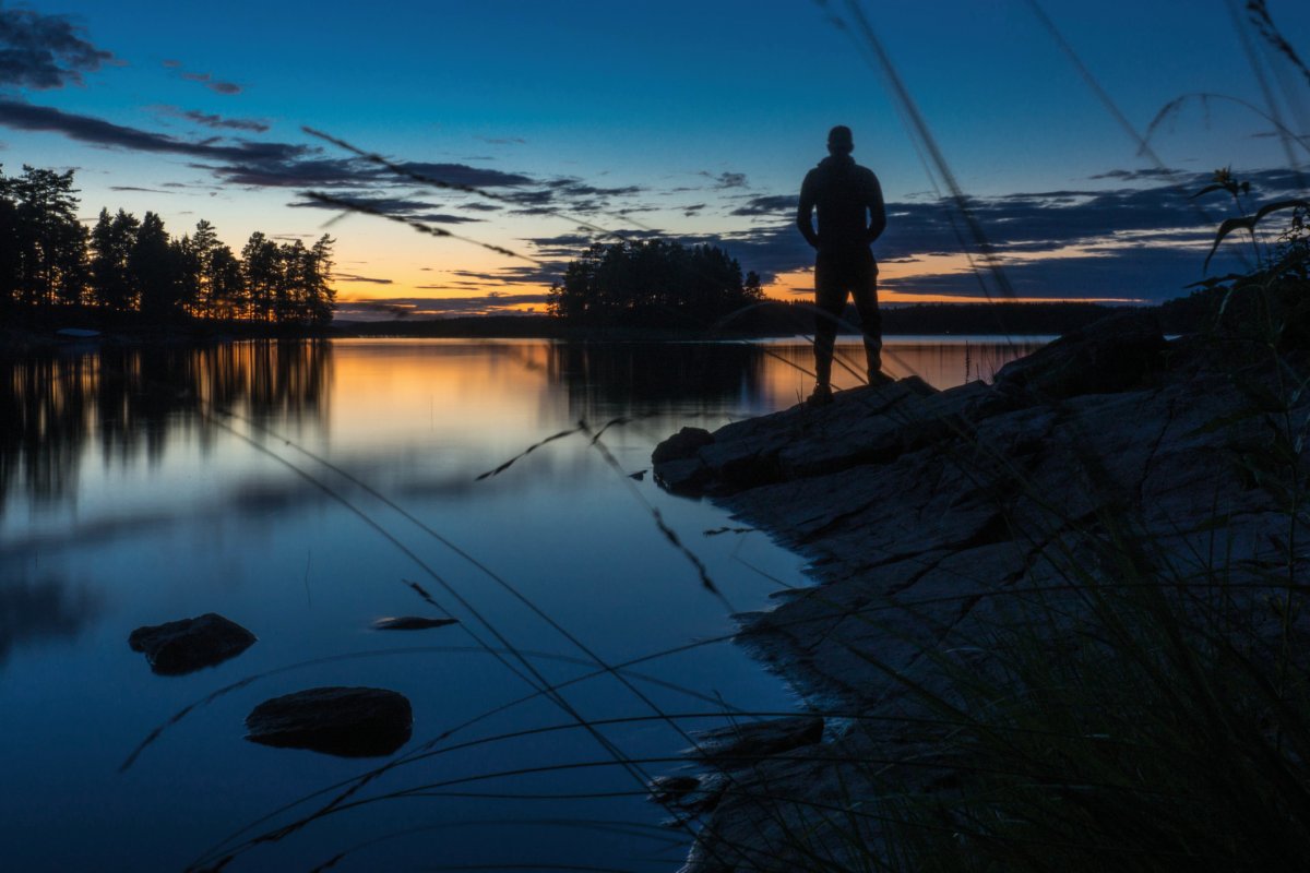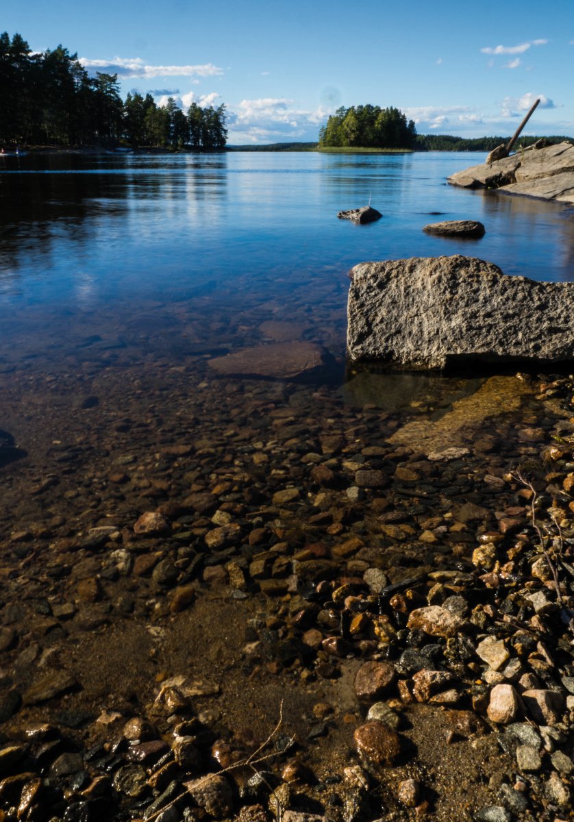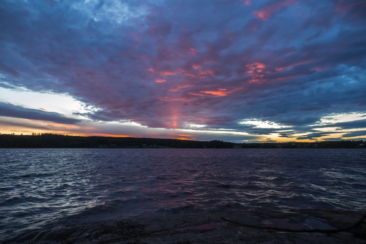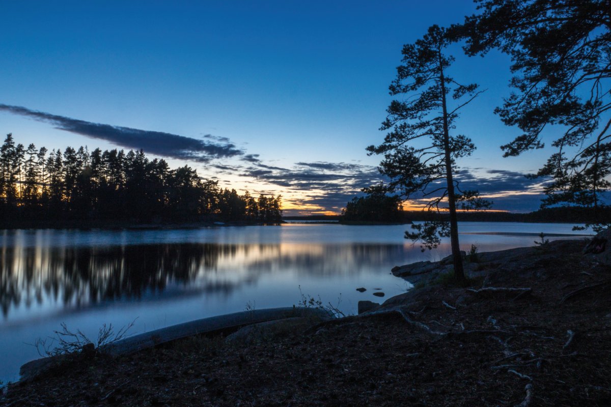 Nachdem wir mit fünf Bussen zeitgleich im Scantrack-Camp angekommen waren, hatte sich die Menschenmenge soweit verteilt, das wir wenige Stunden später gefühlt alleine auf dem Wasser Ausschau nach unserer „Bleibe“ für die erste Nacht hielten. Eine Insel in der Nähe, oder für Eingeweihte Nr. 17, sollte es werden. Das Gepäck wurde an Land gebracht, die Zelte aufgebaut und hinein ging es in die Fluten, um die Spuren der letzten Nacht im Wasser zu lassen. Frisch gebadet und warm eingepackt wurde auf dem Lagerfeuer ein Abendessen gebrutzelt. Der Nachtisch bestand aus Blaubeeren, frisch gepflückt natürlich. So viel frische Luft körperliche Ertüchtigung machen müde und damit endete der Tag früh im Schlafsack.