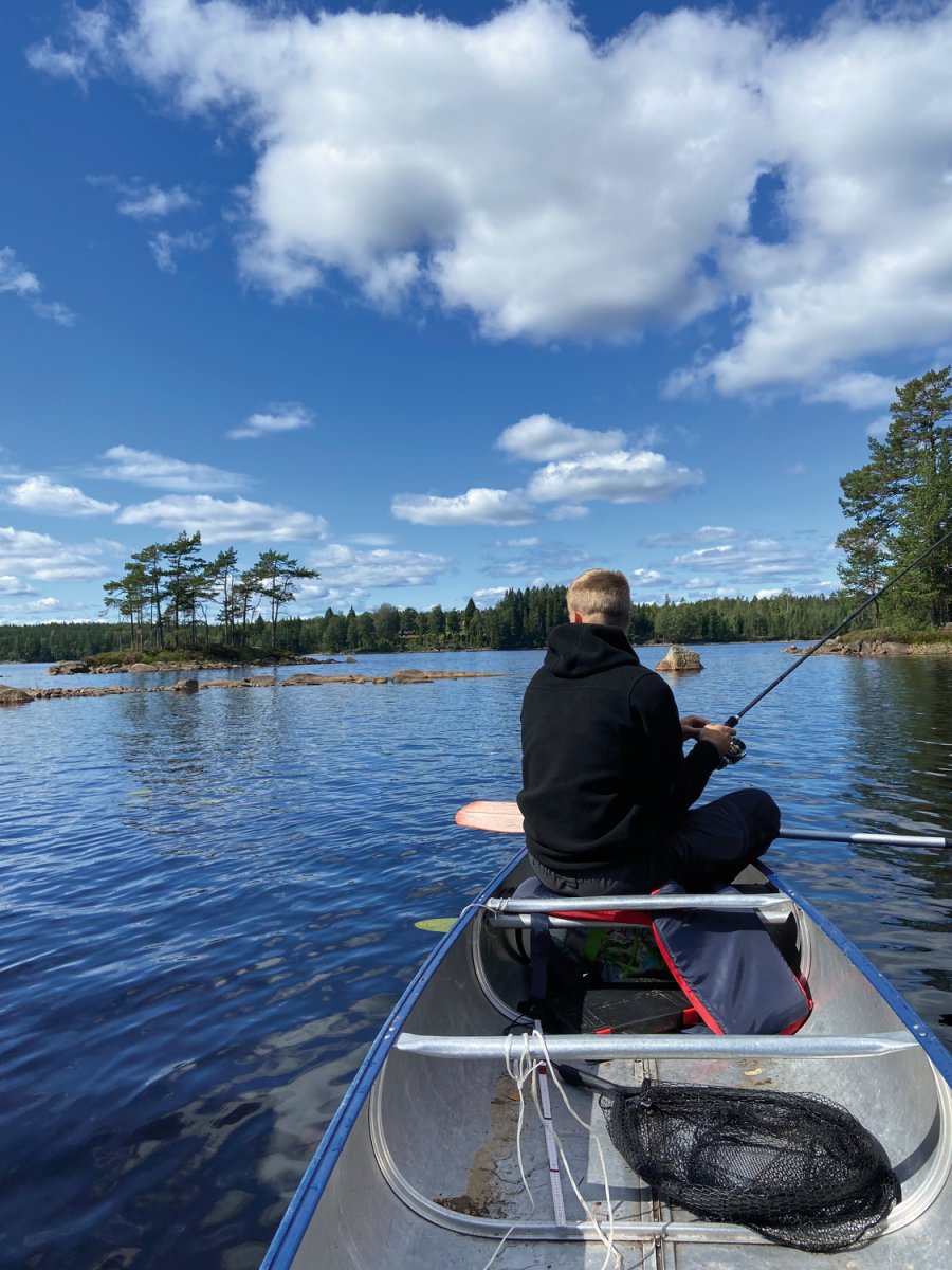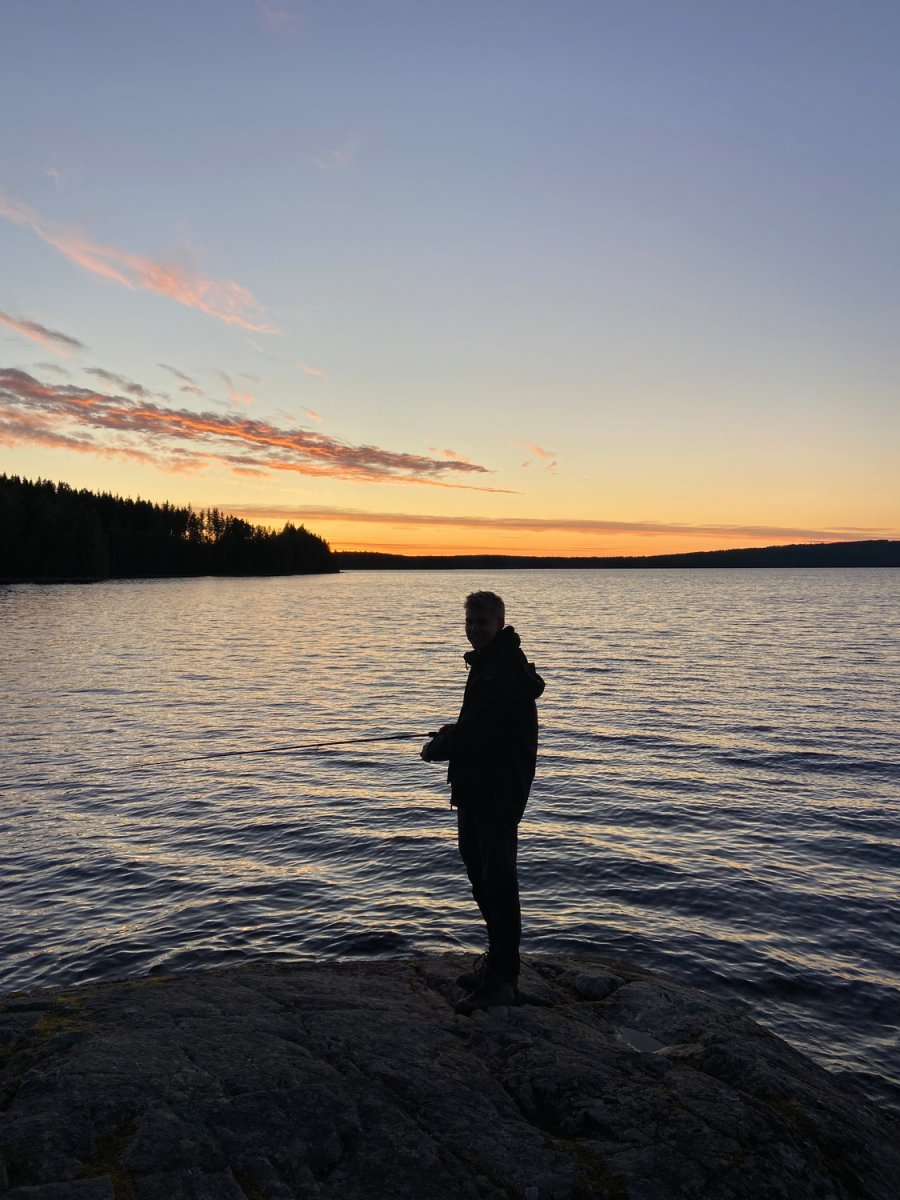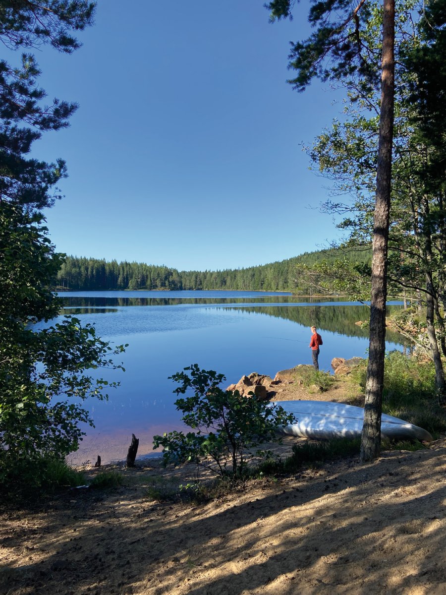 Unser Startpunkt war der große See Övre Gla. Der Wind türmte Wellen auf, und für einen Moment hatte ich das Gefühl, auf dem Meer zu sein. Am Abend wurden wir dafür belohnt: ein Sonnenuntergang wie gemalt, während die Angel ausgeworfen wurde – unser erster Abend im Rhythmus der Natur. Es fühlte sich an, als ob die Welt für einen Augenblick stillstand, nur wir und das goldene Licht über dem Wasser.